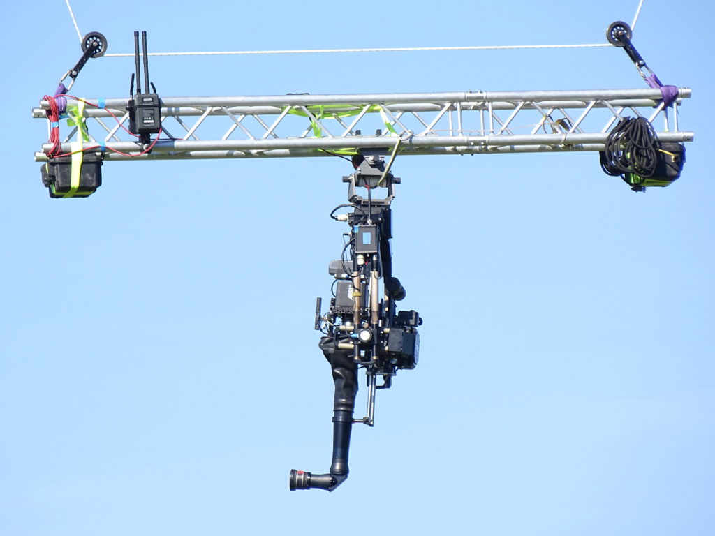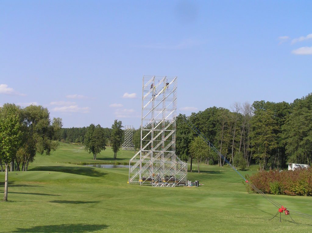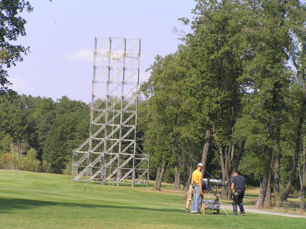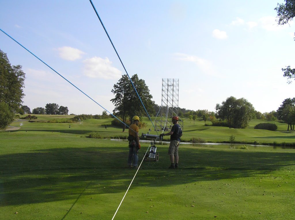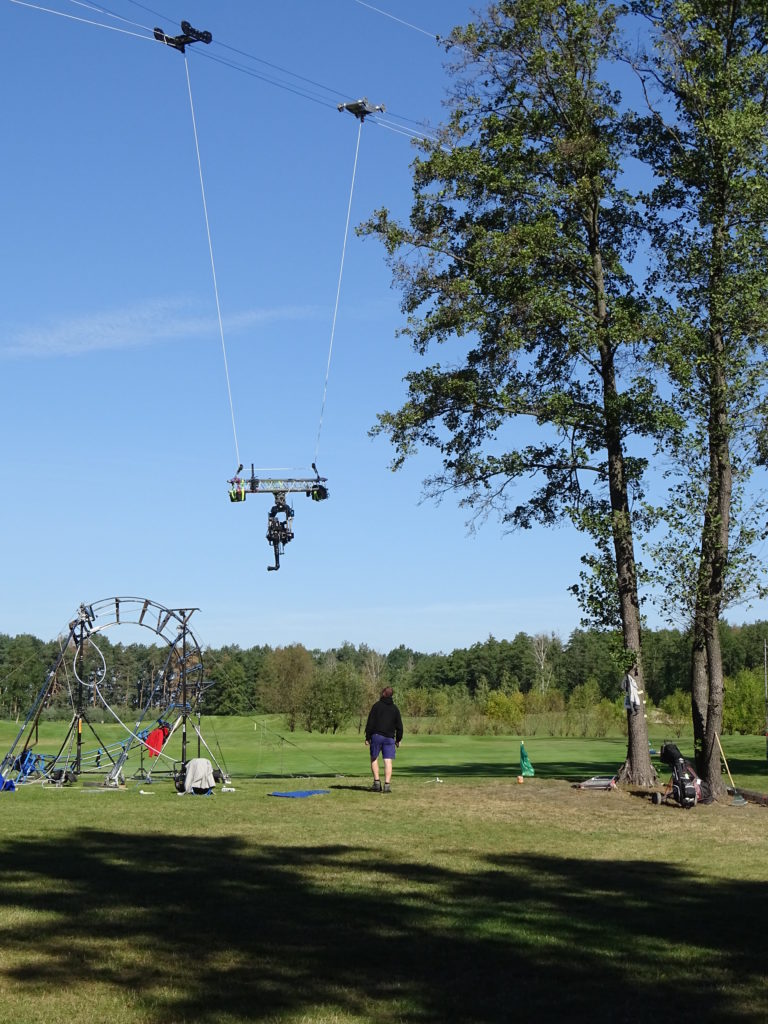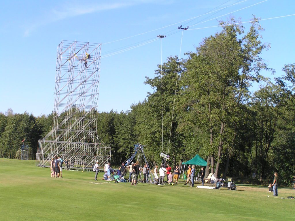 На травяном покрытии гольф-поля были построены две башни из строительных лесов высотой 20 м., расстояние между башнями составляло 250 м. На расстоянии 150м. от каждой башни находились точки крепления несущих тросов — группы бетонных блоков общей массой по 6 т. каждая. Все эти 4 объекта были выставлены на одной прямой. В качестве несущего троса использовался синтетический кевларовый трос. Творческий замысле режиссера требовал, чтобы камера сопровождала летящий после удара гольфистом мяч. Мяч после удара поднимался с уровня земли на высоту 15 м. и затем падал в воду озера. Все это, включая касание объективом камеры воды и было реализовано с помощью тросовой дороги и лебедок Фильмотехник. Монтаж и тест занял две двенадцатичасовые смены. На третий день была проведена съемка и демонтаж. Работа проводилась бригадой из 6 человек.