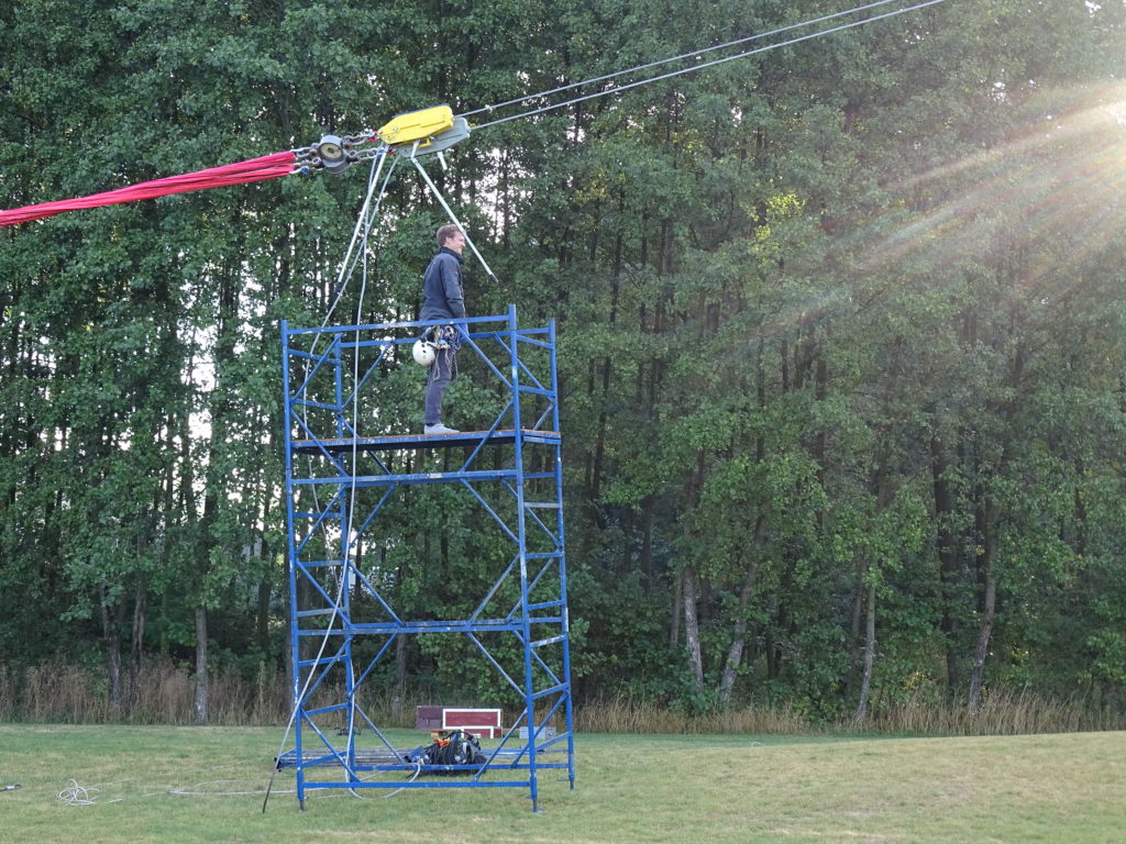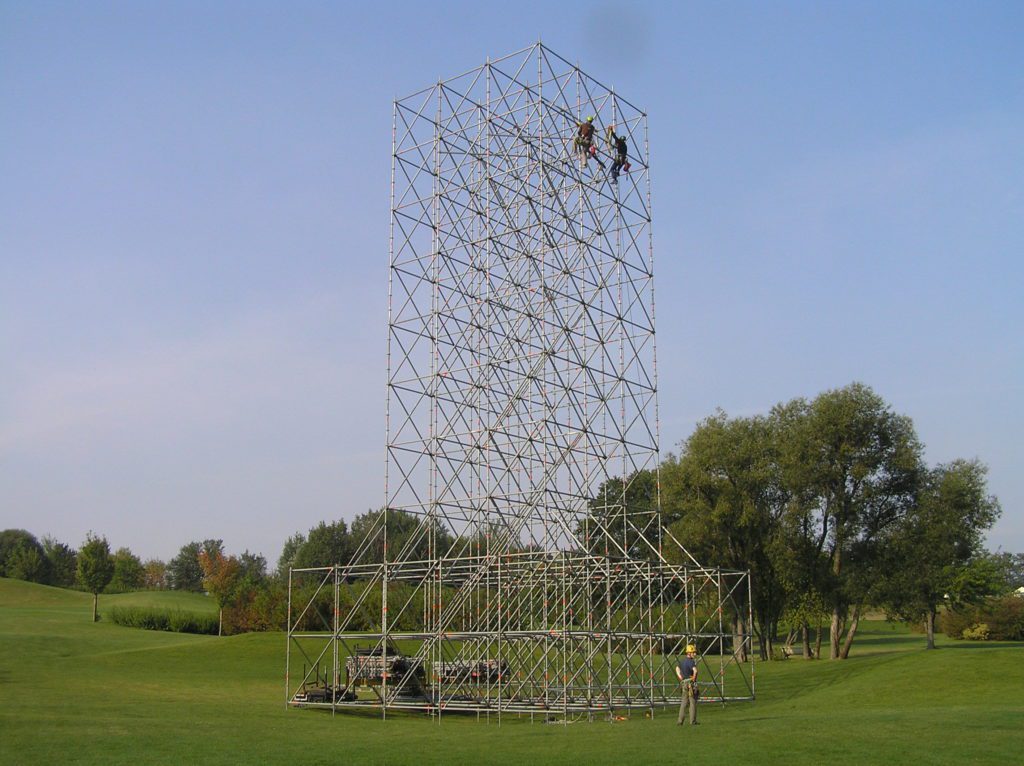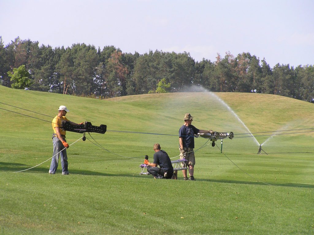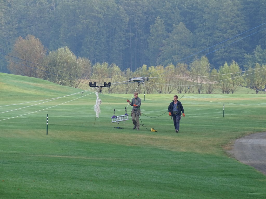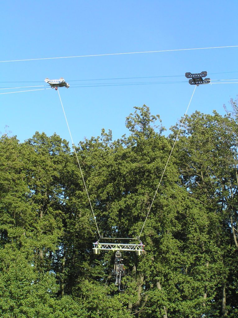 На травяном покрытии гольф-поля были построены две башни из строительных лесов высотой 20 м., расстояние между башнями составляло 250 м. На расстоянии 150м. от каждой башни находились точки крепления несущих тросов — группы бетонных блоков общей массой по 6 т. каждая. Все эти 4 объекта были выставлены на одной прямой. В качестве несущего троса использовался синтетический кевларовый трос. Творческий замысле режиссера требовал, чтобы камера сопровождала летящий после удара гольфистом мяч. Мяч после удара поднимался с уровня земли на высоту 15 м. и затем падал в воду озера. Все это, включая касание объективом камеры воды и было реализовано с помощью тросовой дороги и лебедок Фильмотехник. Монтаж и тест занял две двенадцатичасовые смены. На третий день была проведена съемка и демонтаж. Работа проводилась бригадой из 6 человек.