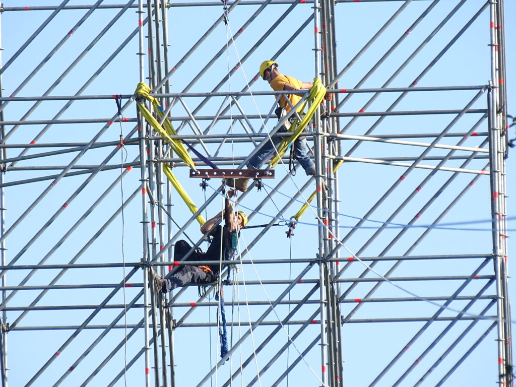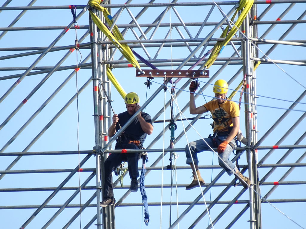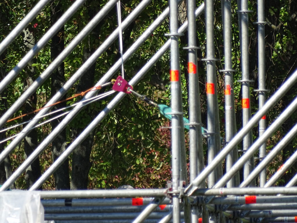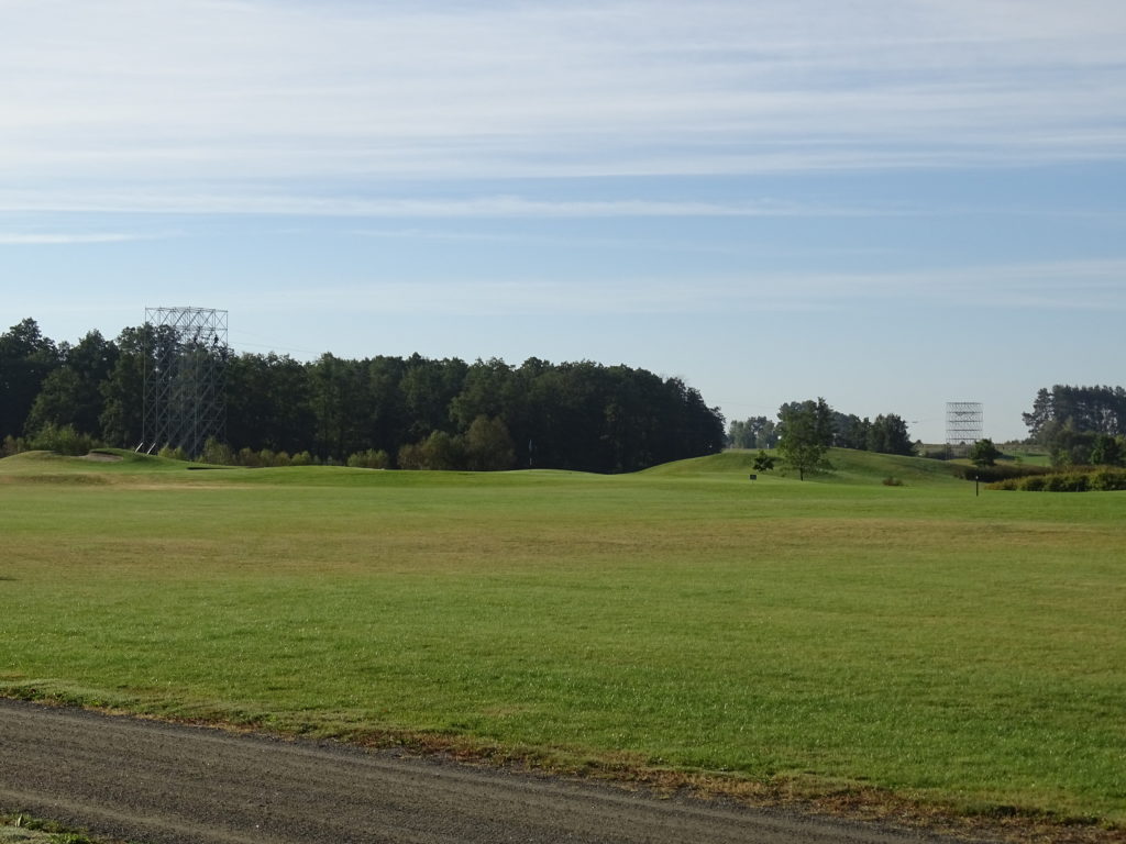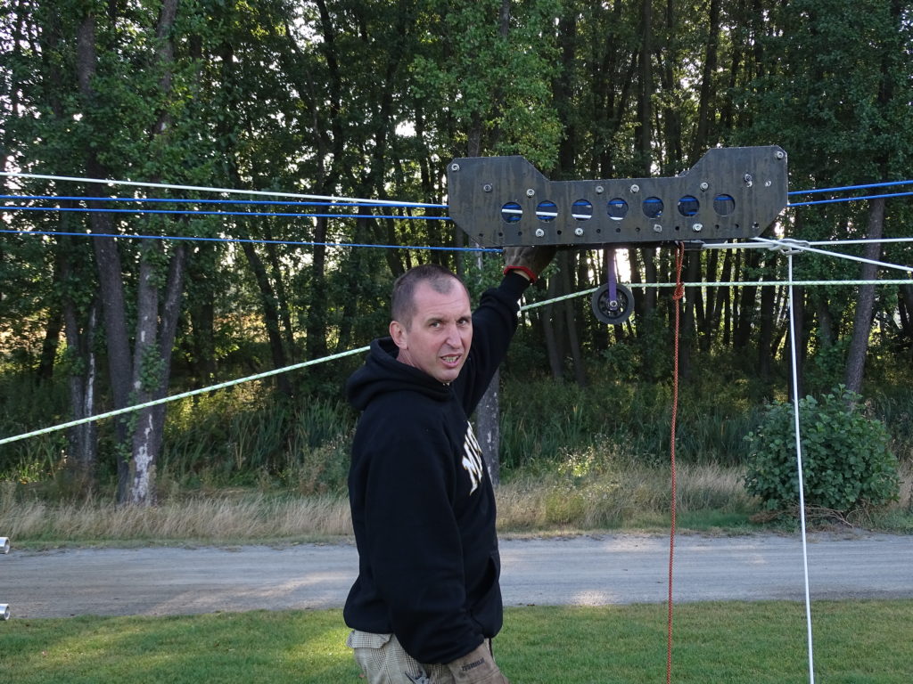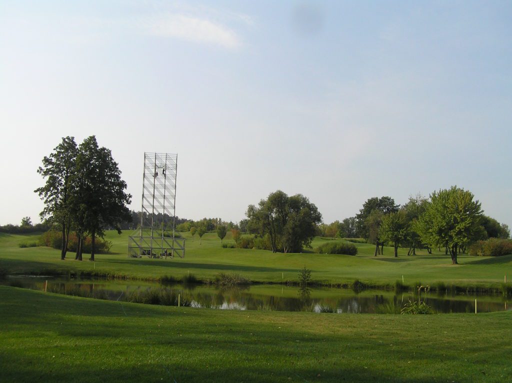 На травяном покрытии гольф-поля были построены две башни из строительных лесов высотой 20 м., расстояние между башнями составляло 250 м. На расстоянии 150м. от каждой башни находились точки крепления несущих тросов — группы бетонных блоков общей массой по 6 т. каждая. Все эти 4 объекта были выставлены на одной прямой. В качестве несущего троса использовался синтетический кевларовый трос. Творческий замысле режиссера требовал, чтобы камера сопровождала летящий после удара гольфистом мяч. Мяч после удара поднимался с уровня земли на высоту 15 м. и затем падал в воду озера. Все это, включая касание объективом камеры воды и было реализовано с помощью тросовой дороги и лебедок Фильмотехник. Монтаж и тест занял две двенадцатичасовые смены. На третий день была проведена съемка и демонтаж. Работа проводилась бригадой из 6 человек.
