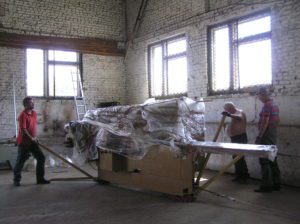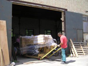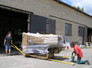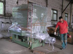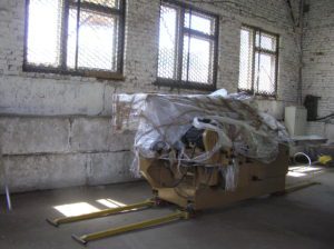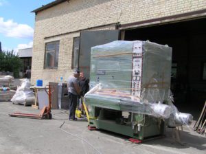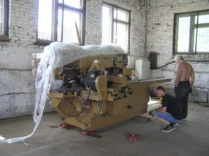 Три деревообрабатывающих станка весом около трех тонн каждый, цех возле г.Бровары. Первый станок манипулятор выгрузил в цеху, но экспозиция поменялась и его предстояло развернуть на месте на 180 градусов. Это мы сделали сразу, в виде разминки, чтобы мышцы прогреть. По ходу выяснили, что полы – асфальтные и под ними кроме земли нет ничего.