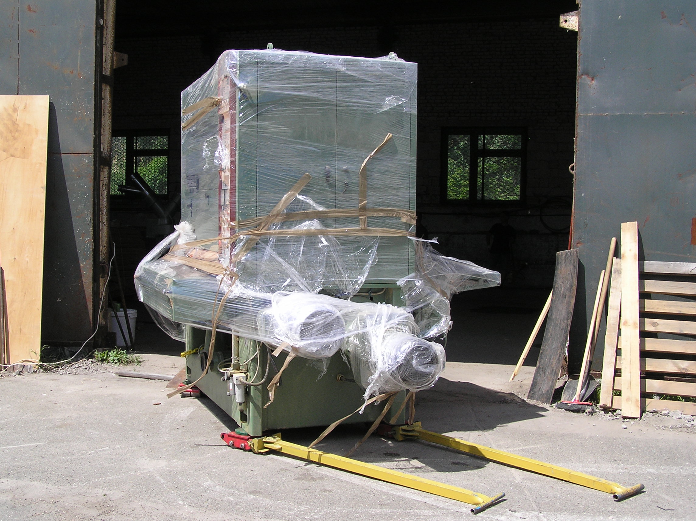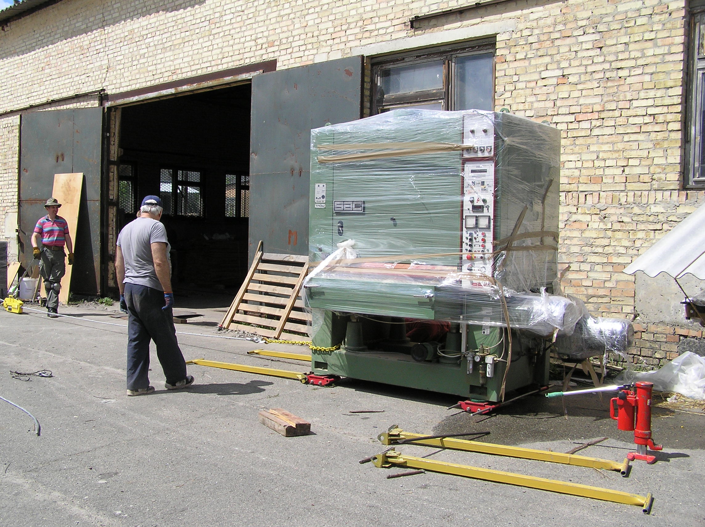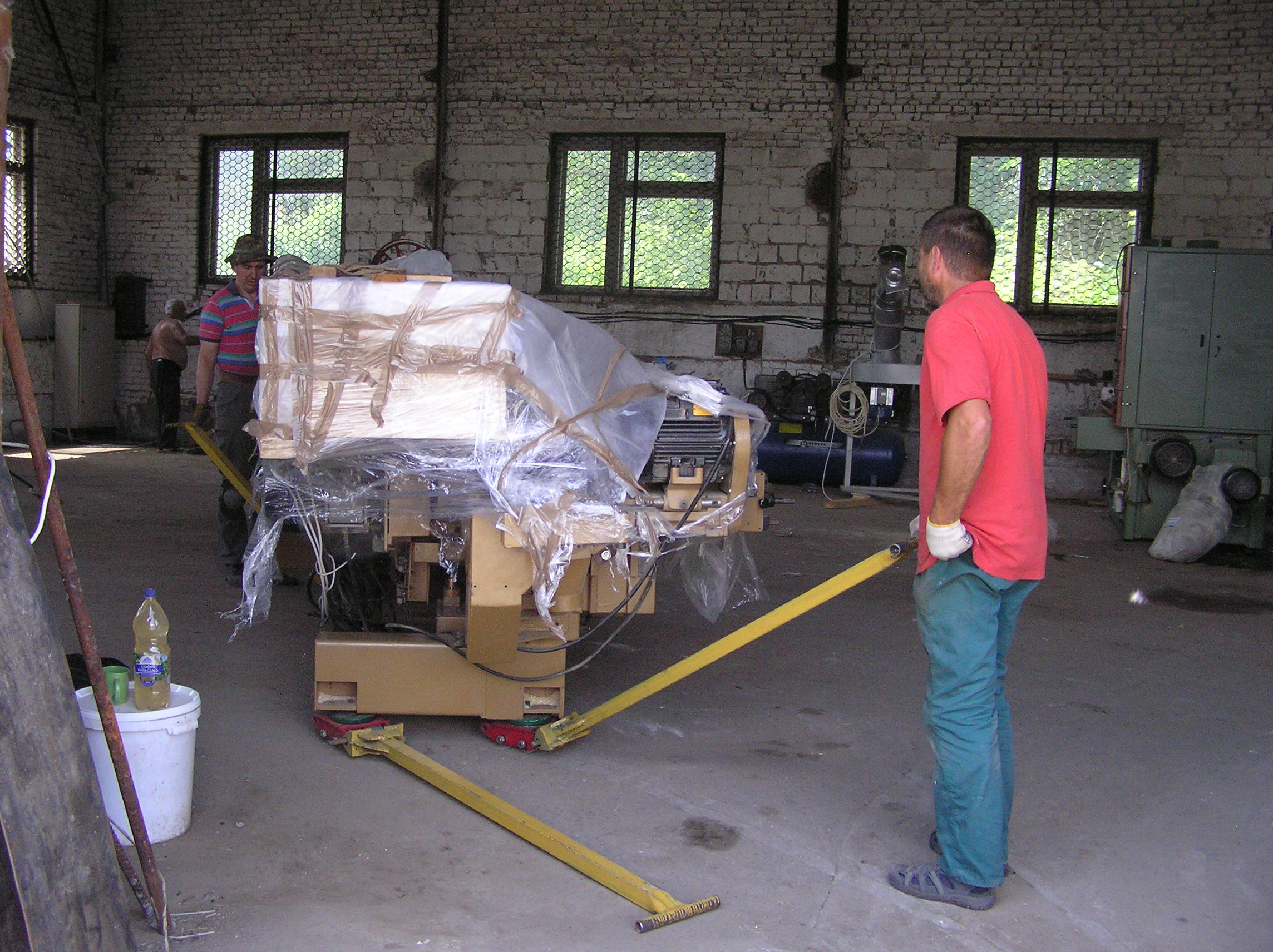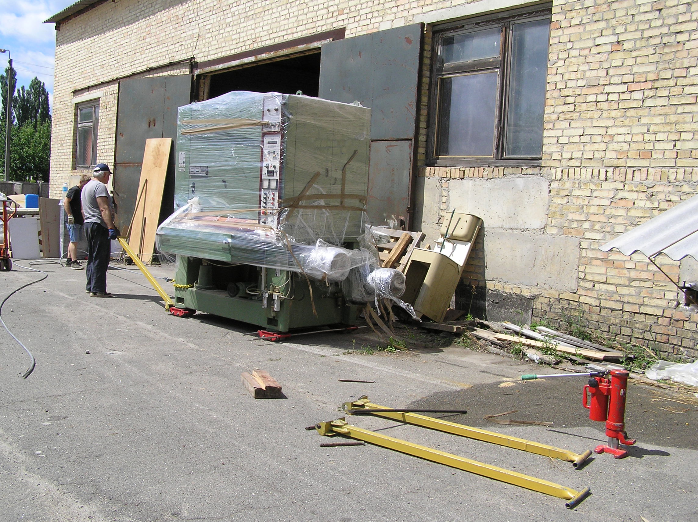 Три деревообрабатывающих станка весом около трех тонн каждый, цех возле г.Бровары. Первый станок манипулятор выгрузил в цеху, но экспозиция поменялась и его предстояло развернуть на месте на 180 градусов. Это мы сделали сразу, в виде разминки, чтобы мышцы прогреть. По ходу выяснили, что полы – асфальтные и под ними кроме земли нет ничего.