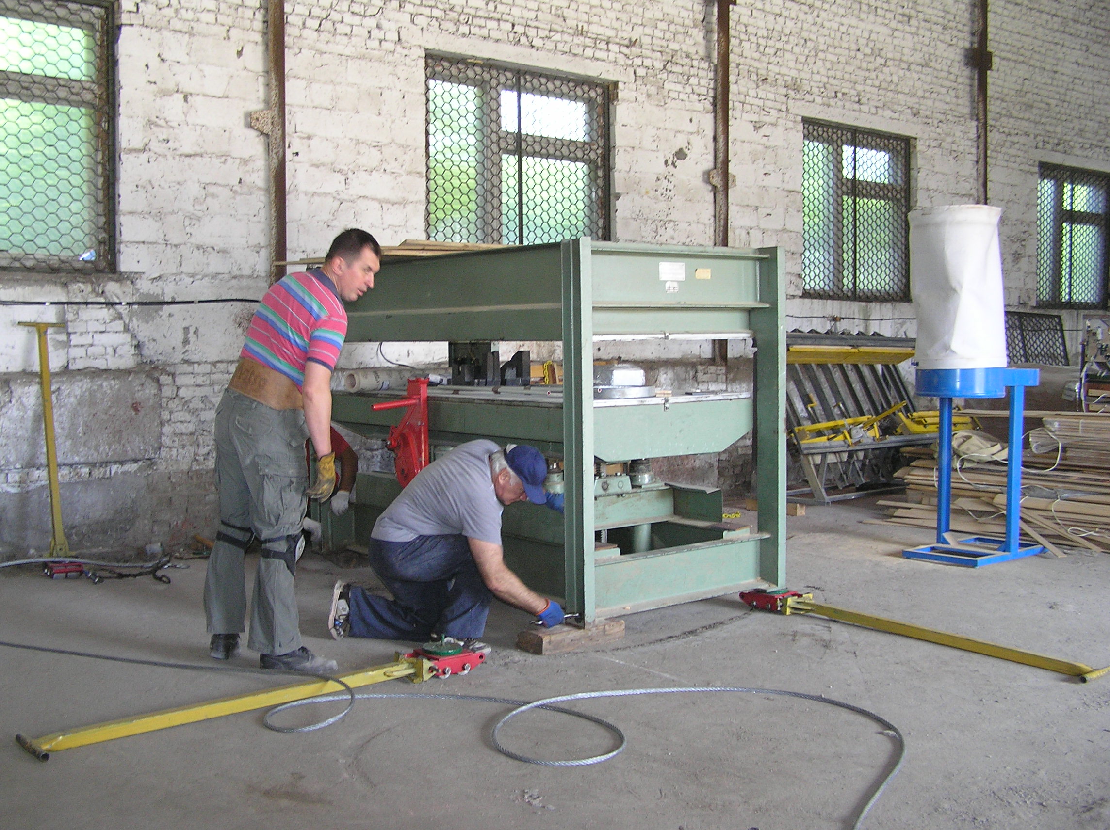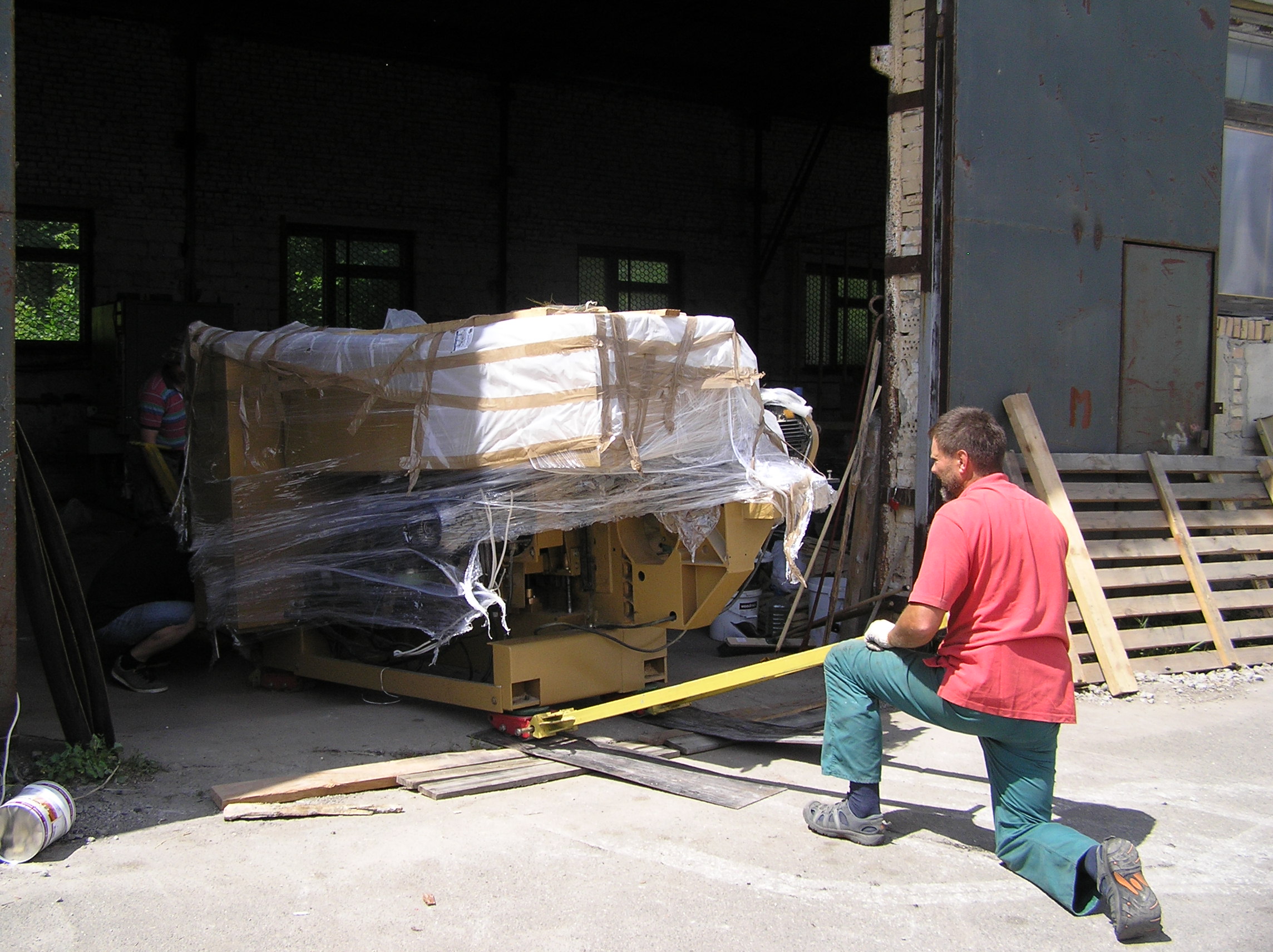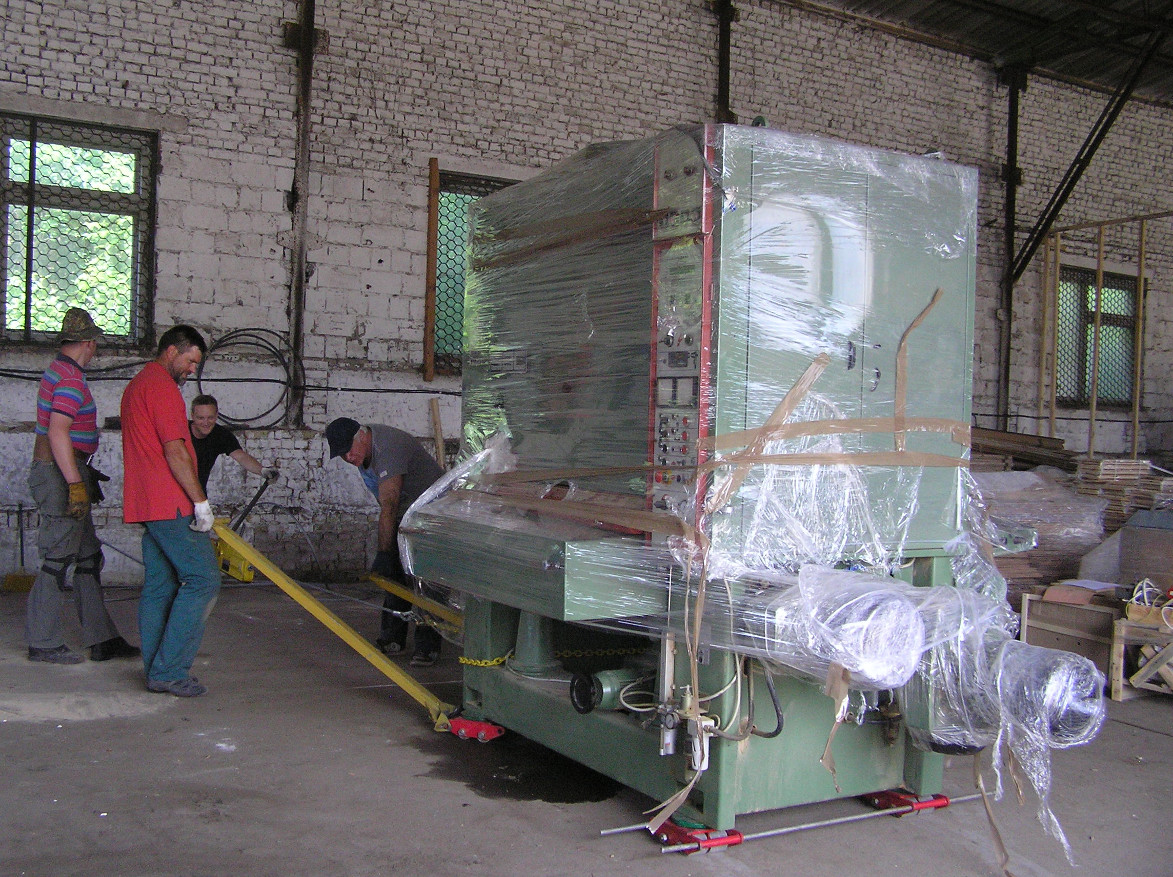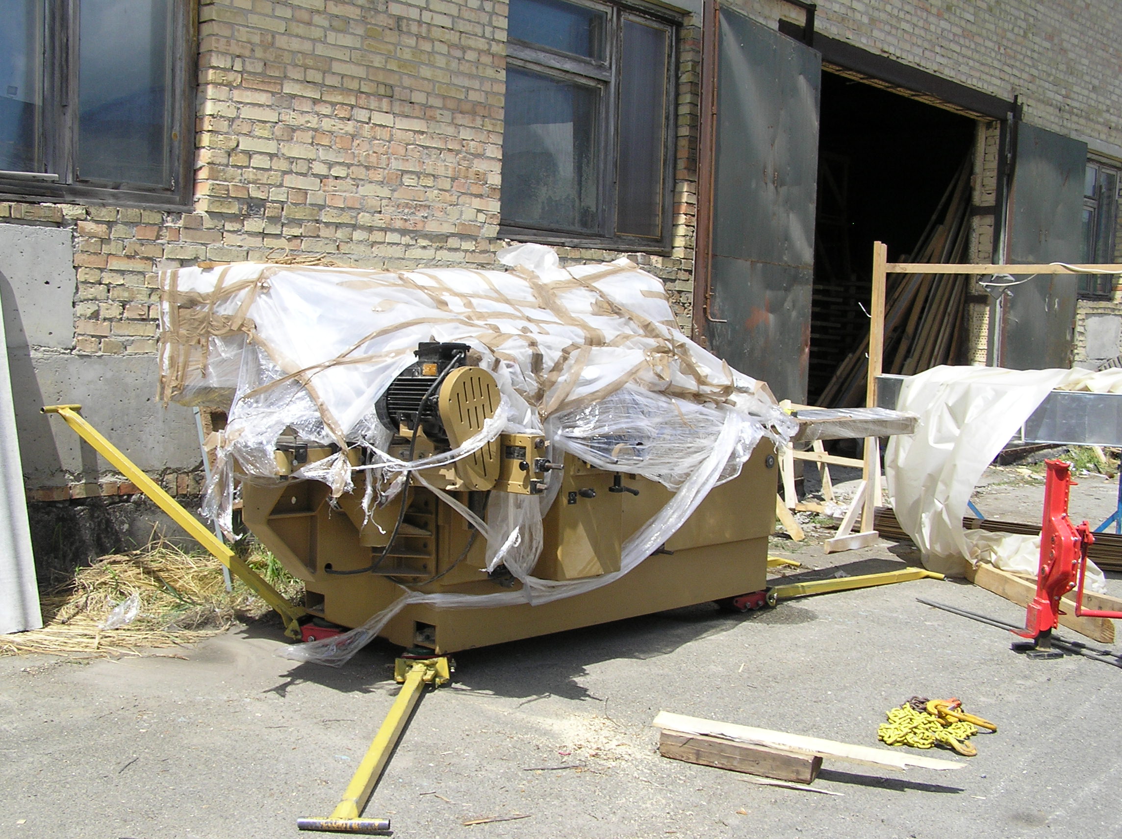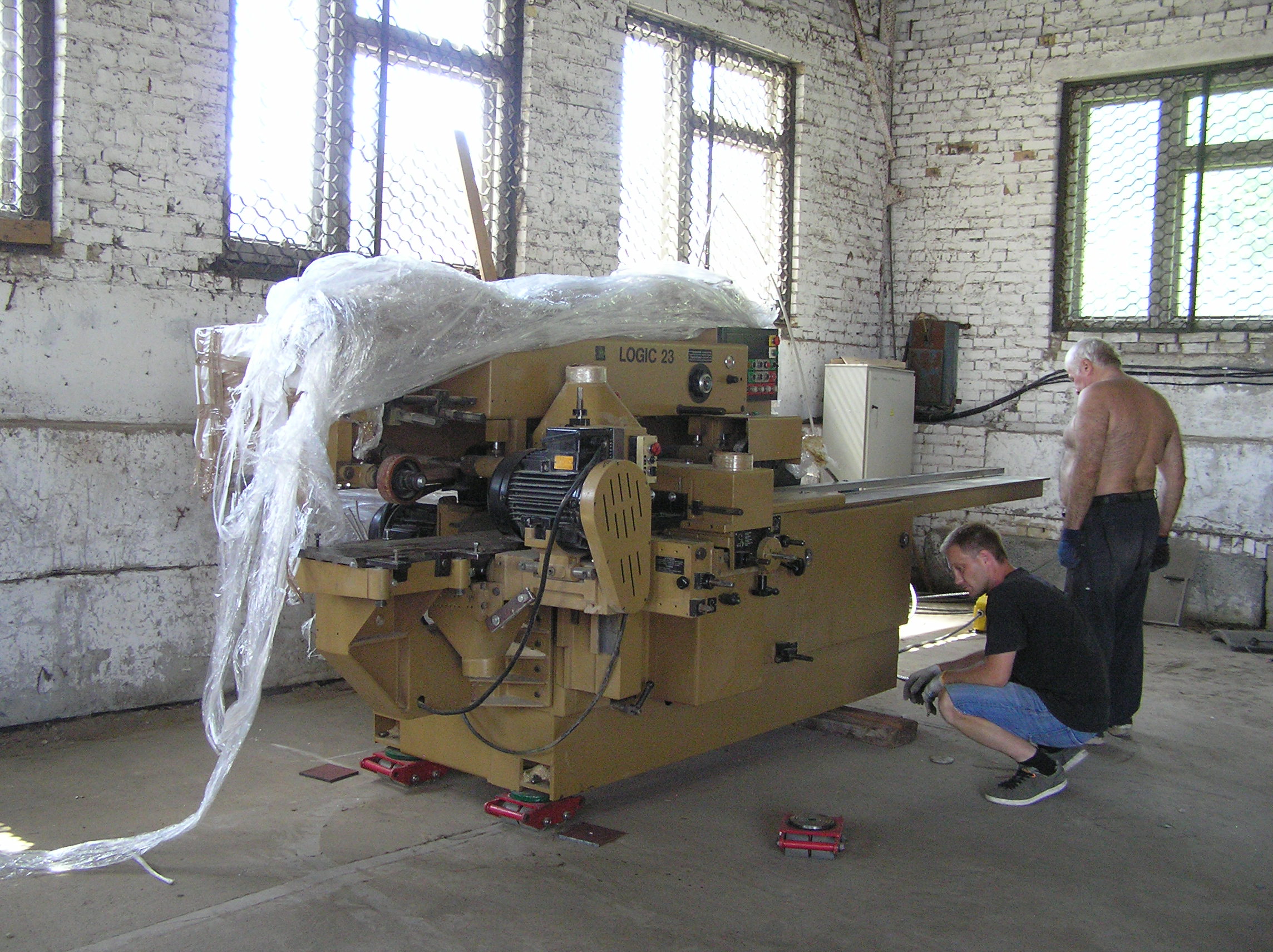 Три деревообрабатывающих станка весом около трех тонн каждый, цех возле г.Бровары. Первый станок манипулятор выгрузил в цеху, но экспозиция поменялась и его предстояло развернуть на месте на 180 градусов. Это мы сделали сразу, в виде разминки, чтобы мышцы прогреть. По ходу выяснили, что полы – асфальтные и под ними кроме земли нет ничего.