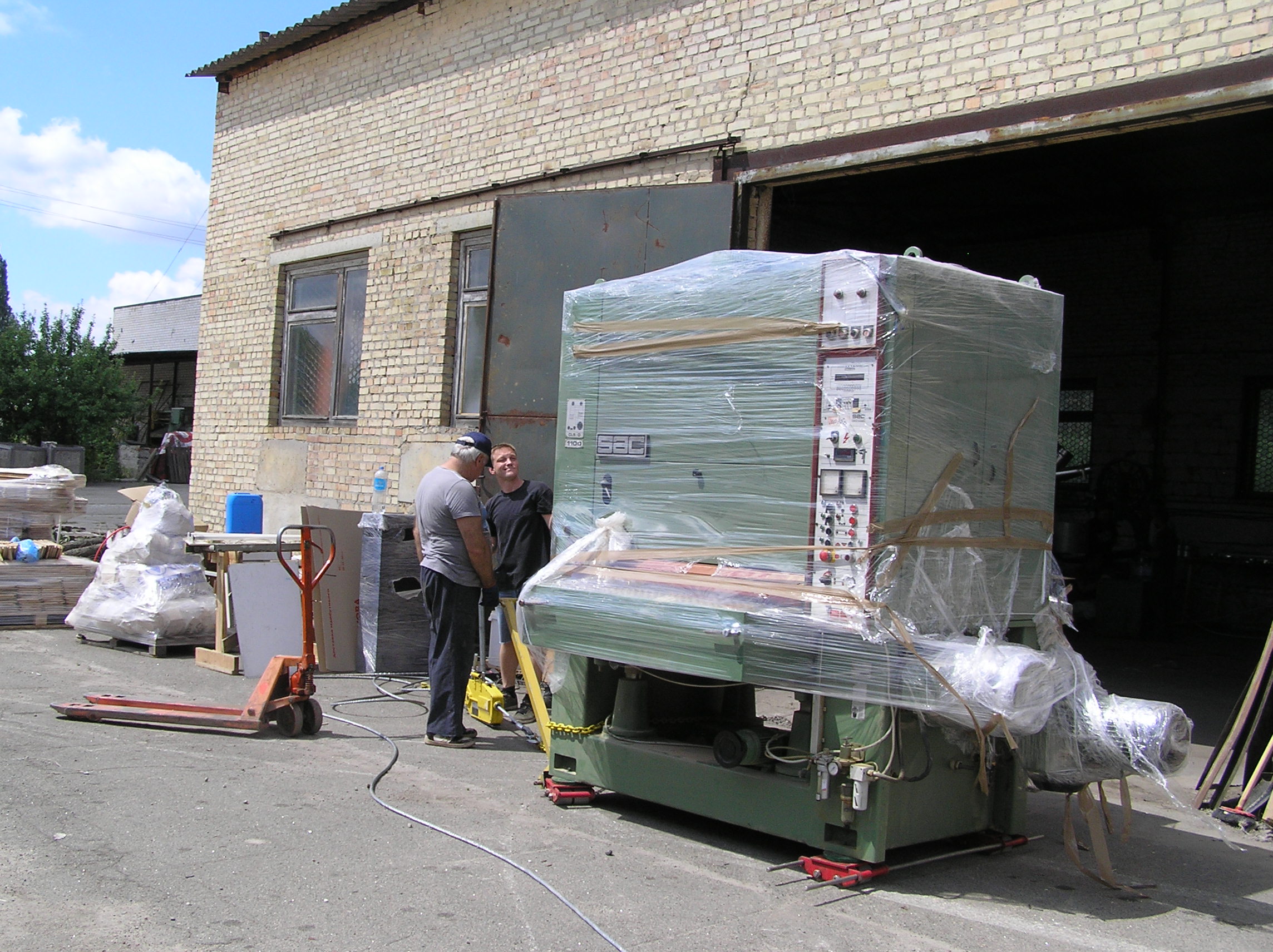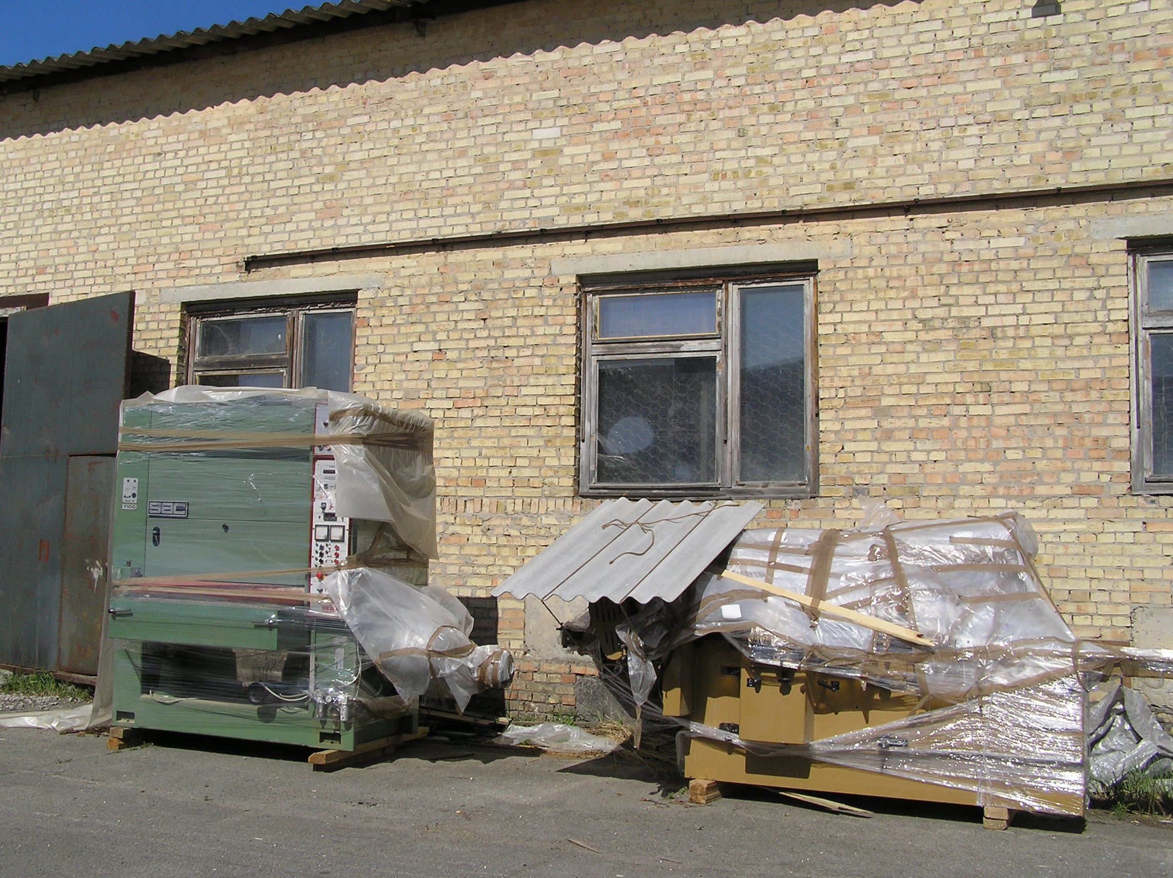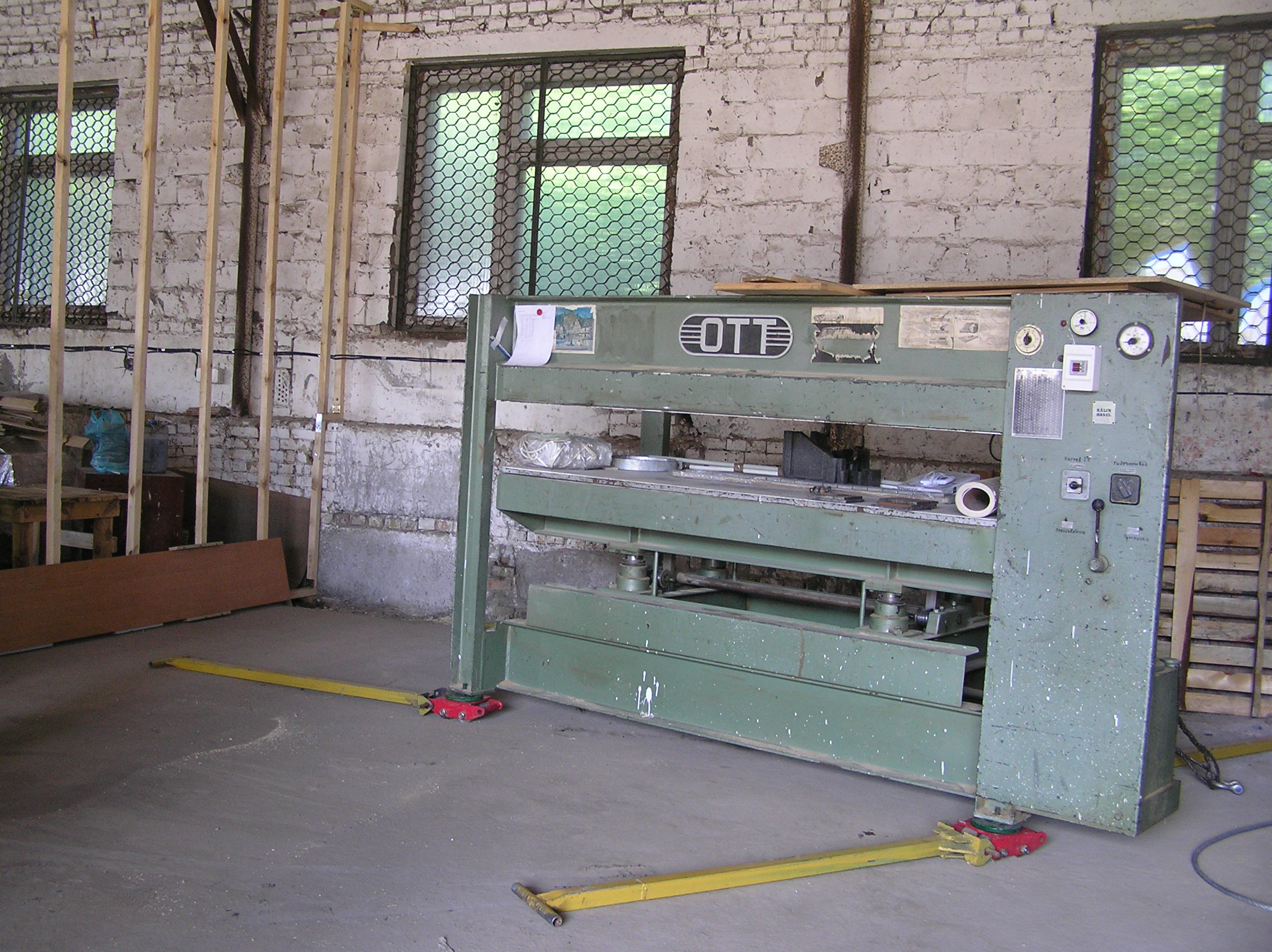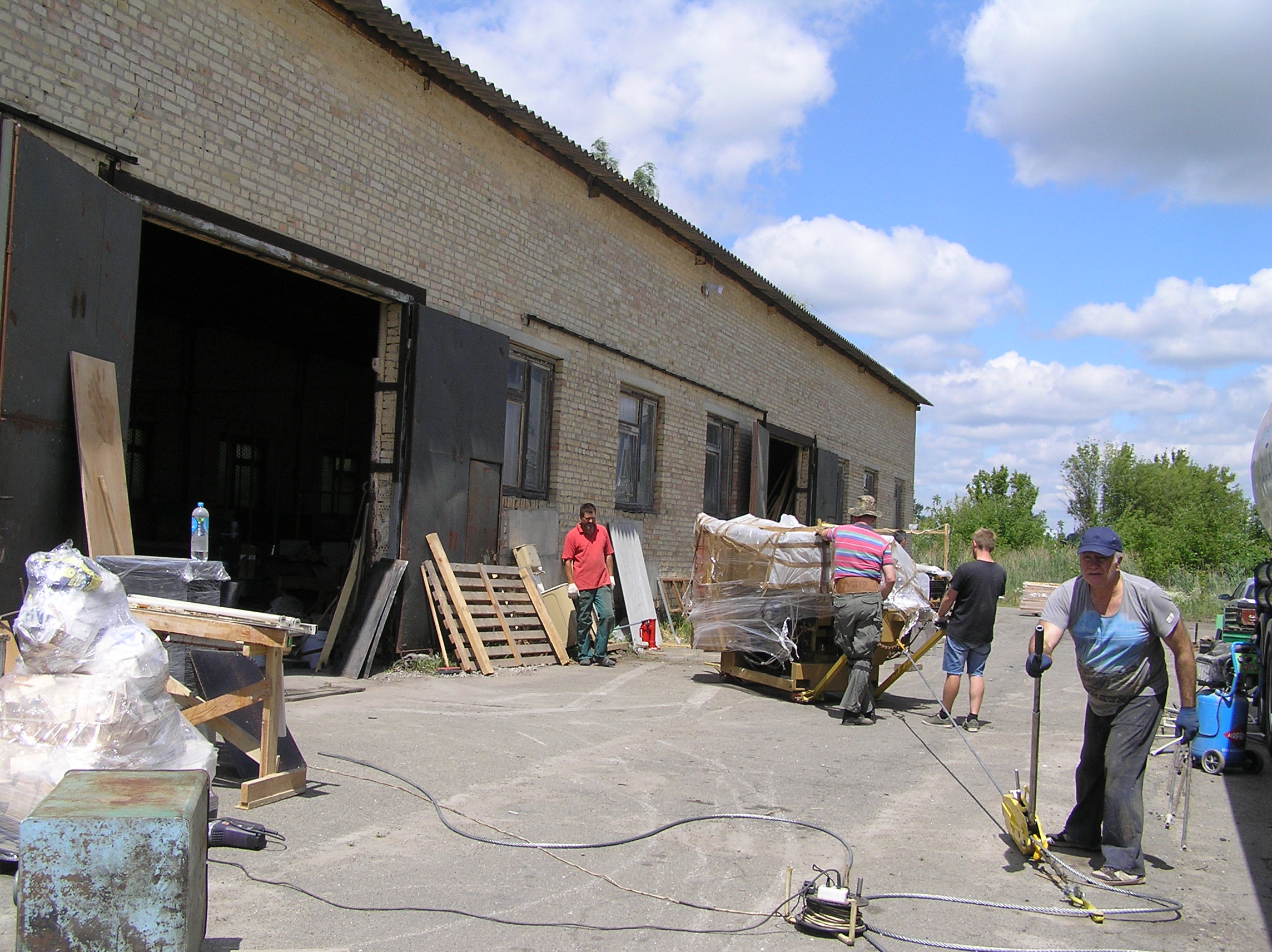 Три деревообрабатывающих станка весом около трех тонн каждый, цех возле г.Бровары. Первый станок манипулятор выгрузил в цеху, но экспозиция поменялась и его предстояло развернуть на месте на 180 градусов. Это мы сделали сразу, в виде разминки, чтобы мышцы прогреть. По ходу выяснили, что полы – асфальтные и под ними кроме земли нет ничего.