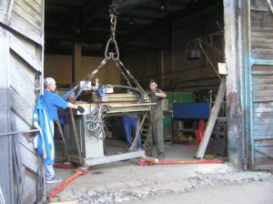 Заказчик, видя как у нас все хорошо и быстро получается, предложил за компанию перевезти еще и сварочный станок. Весу в нем было немного, но конструкция предполагала строповку с траверсой, а мы ее в этот день, как на зло с собой не взяли. Но оптимизм владельца вдохновил нас и мы согласились и на сварочный станок.