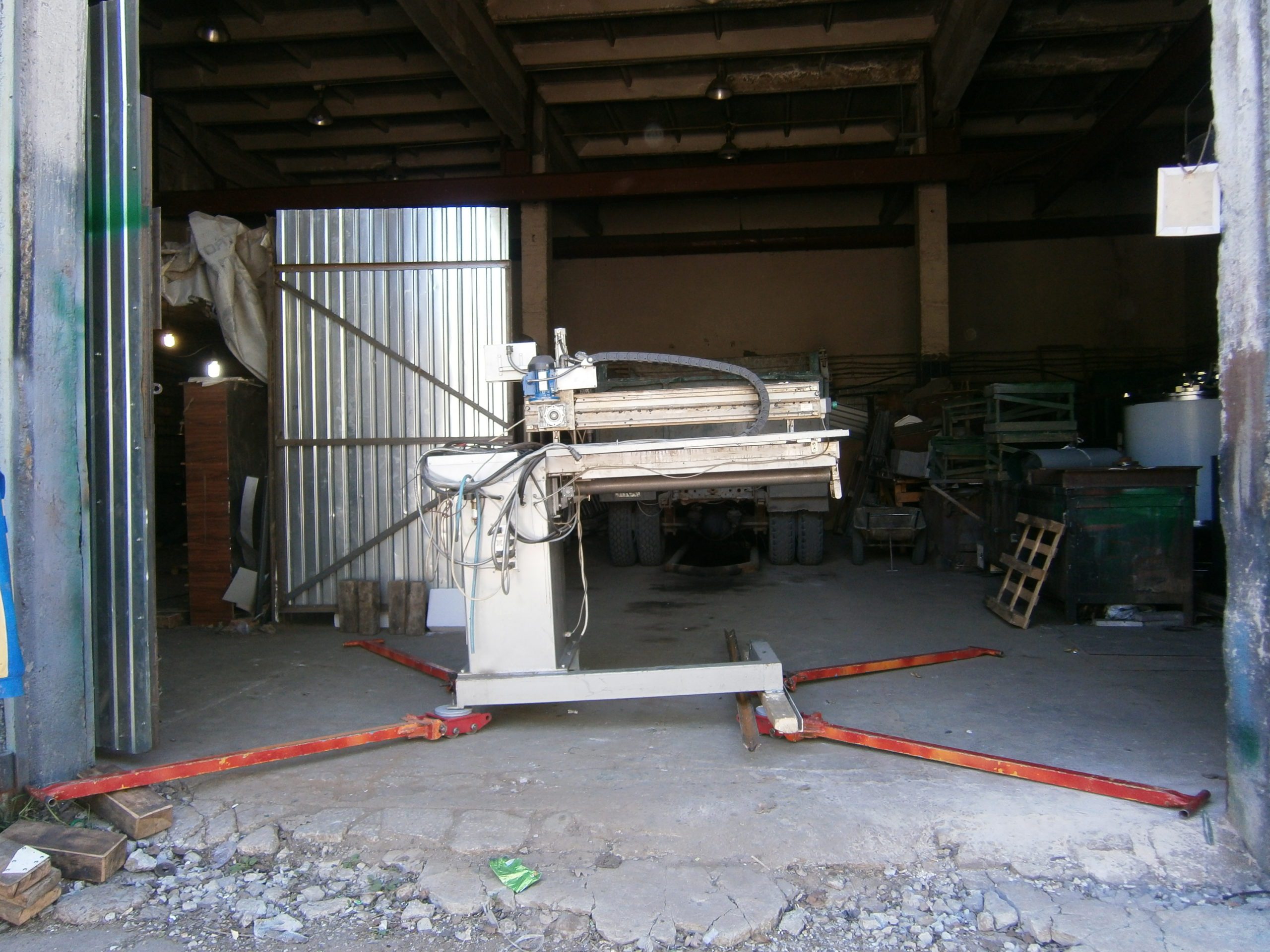 Ширины ворот нового цеха оказалось достаточно, чтобы водитель смог почти полностью заехать вовнутрь. Благодаря этому, за три ходки удалось перевезти все грузы в новый цех и расставить их там. Выражаем искреннюю благодарность водителю манипулятора за мастерство в работе.