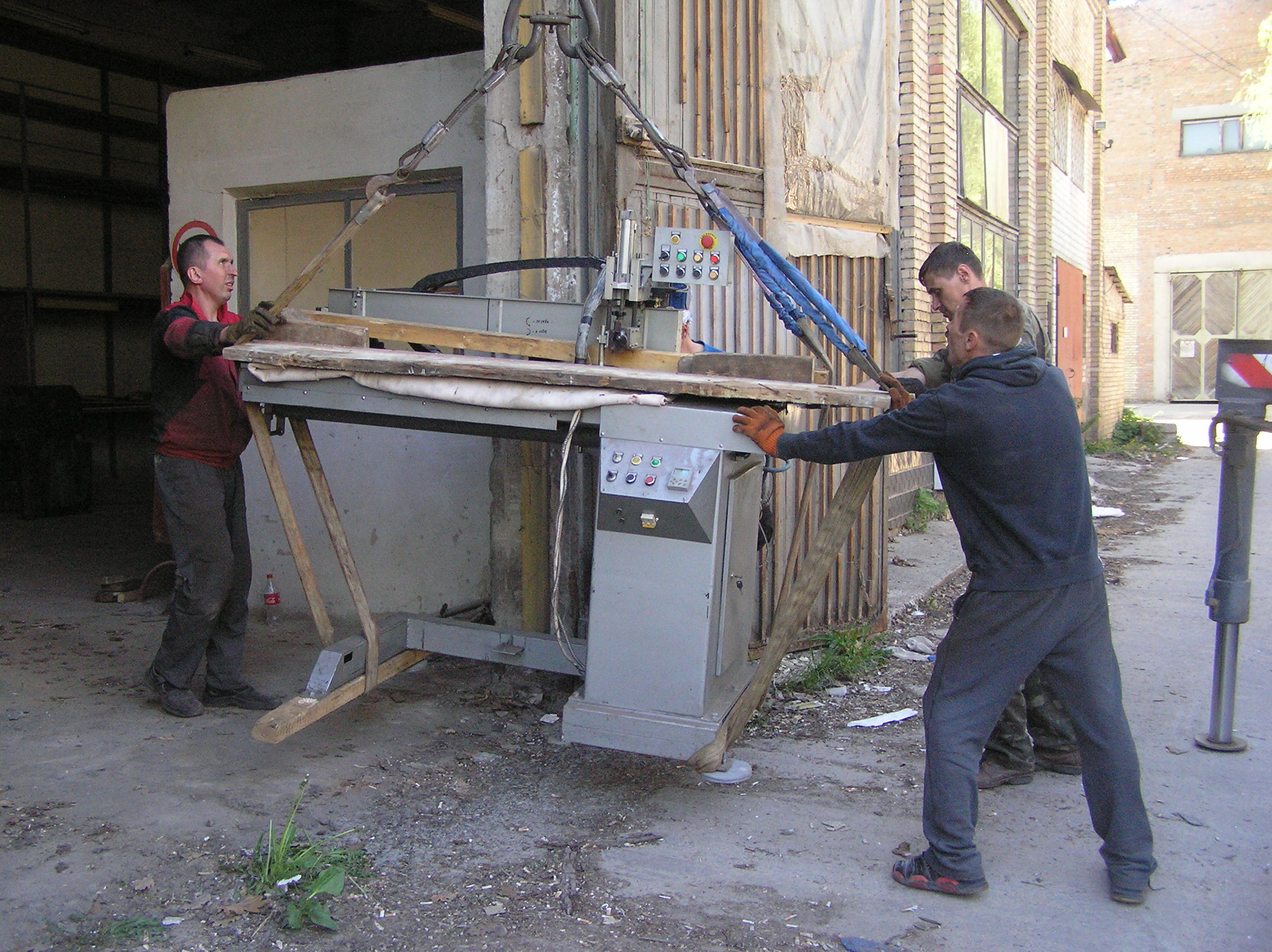 Заказчик, видя как у нас все хорошо и быстро получается, предложил за компанию перевезти еще и сварочный станок. Весу в нем было немного, но конструкция предполагала строповку с траверсой, а мы ее в этот день, как на зло с собой не взяли. Но оптимизм владельца вдохновил нас и мы согласились и на сварочный станок.