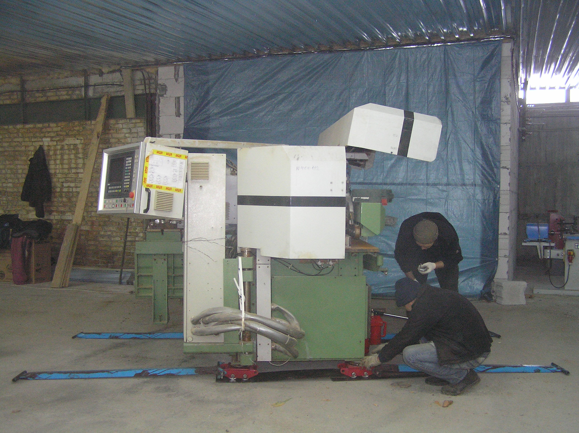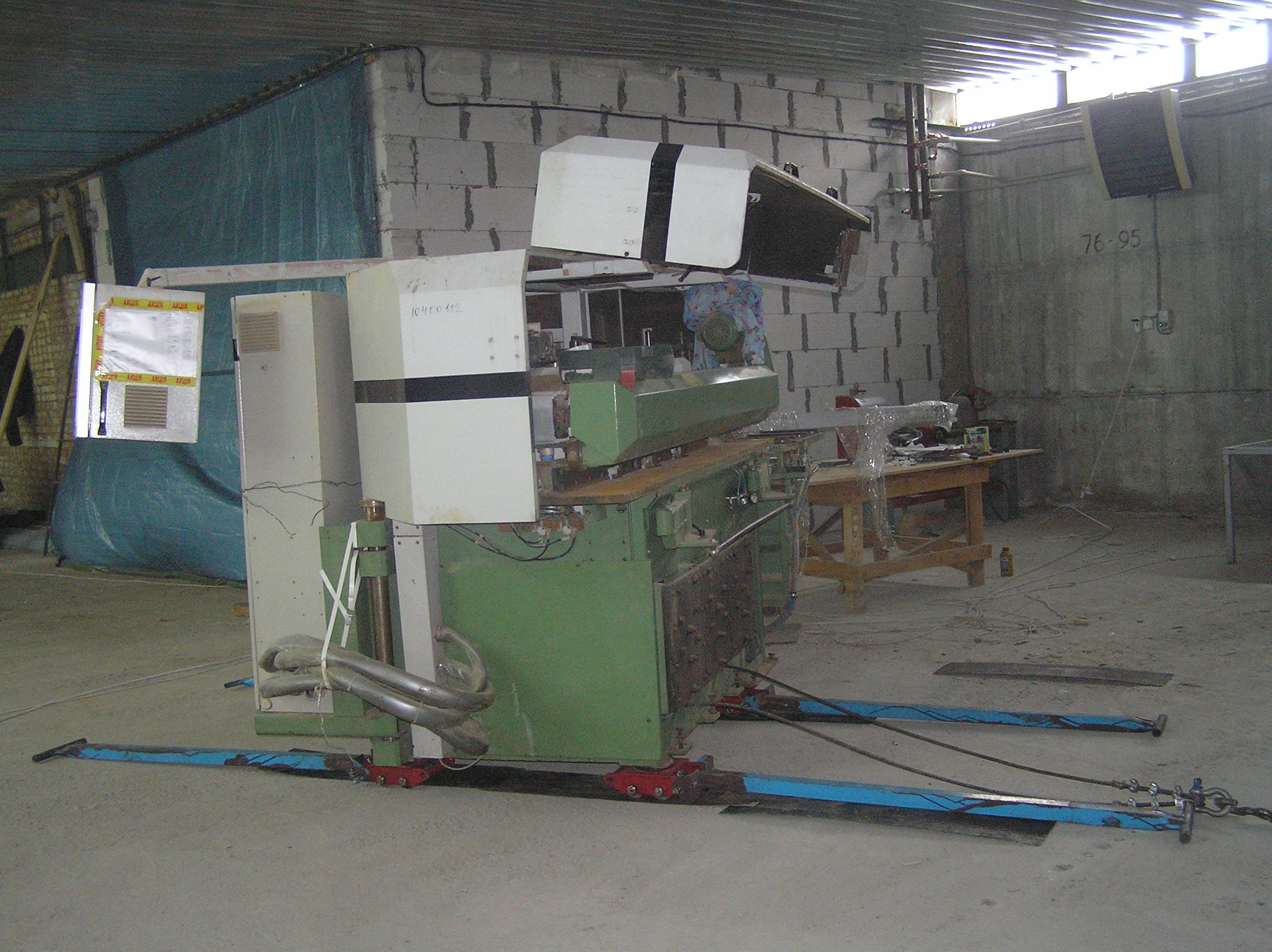 Станок был выгружен заказчиком внутри цеха. Перемещение механизма по цеху к месту постоянной установки заказчик решил доверить специалистам компании БлокМастер, и не ошибся. После перетаскивания, станок был выставлен по уровню на подушках с помощью регулировочных болтов. По окончании работ и заказчик, и специалисты компании БлокМастер остались довольны друг другом.