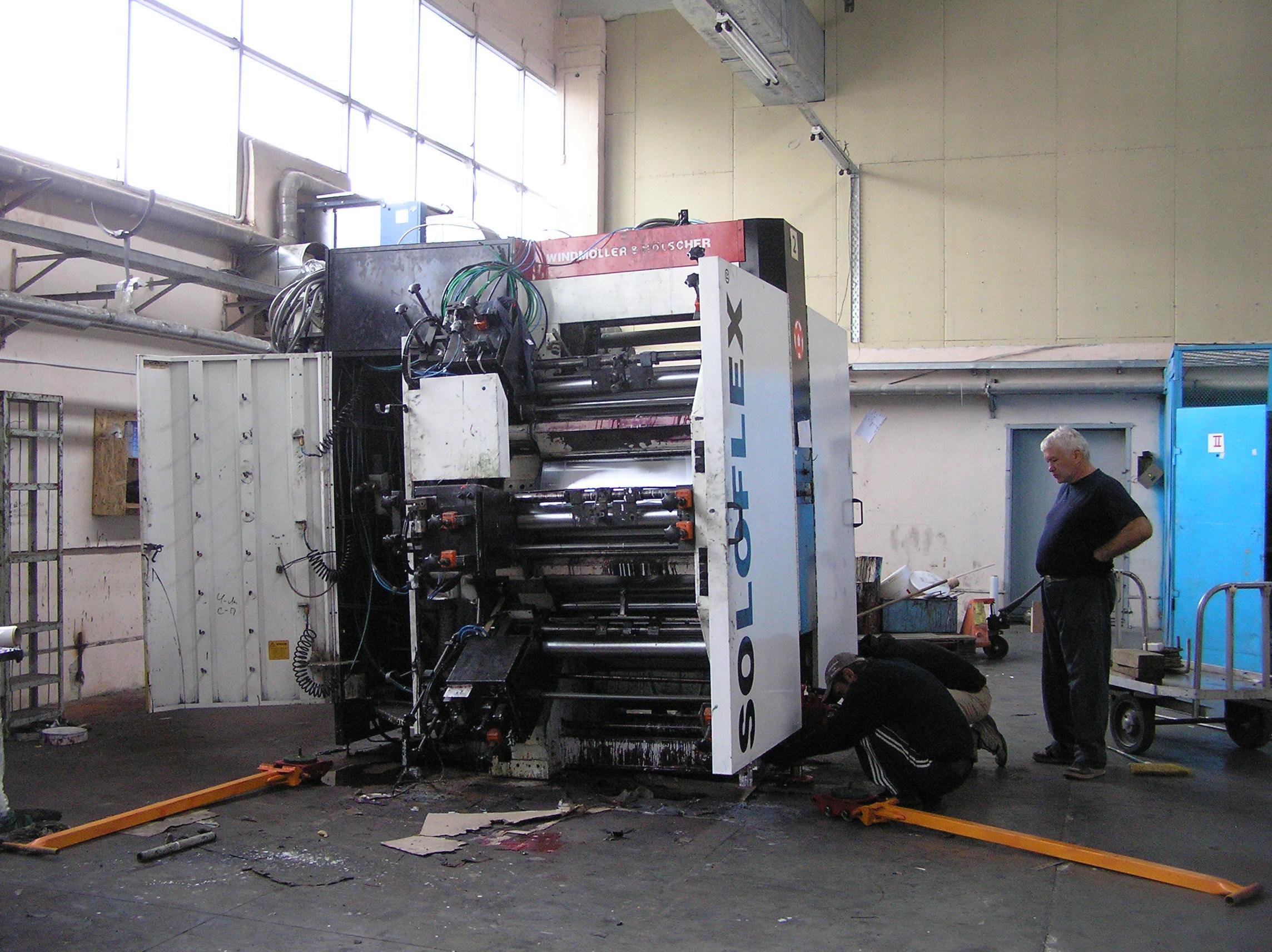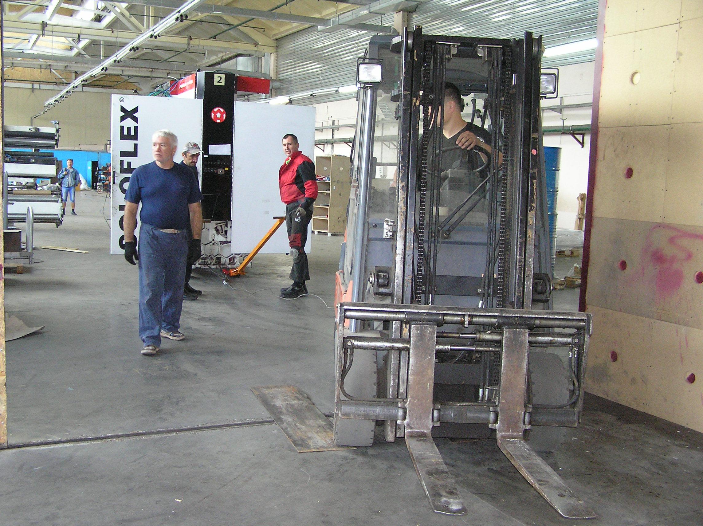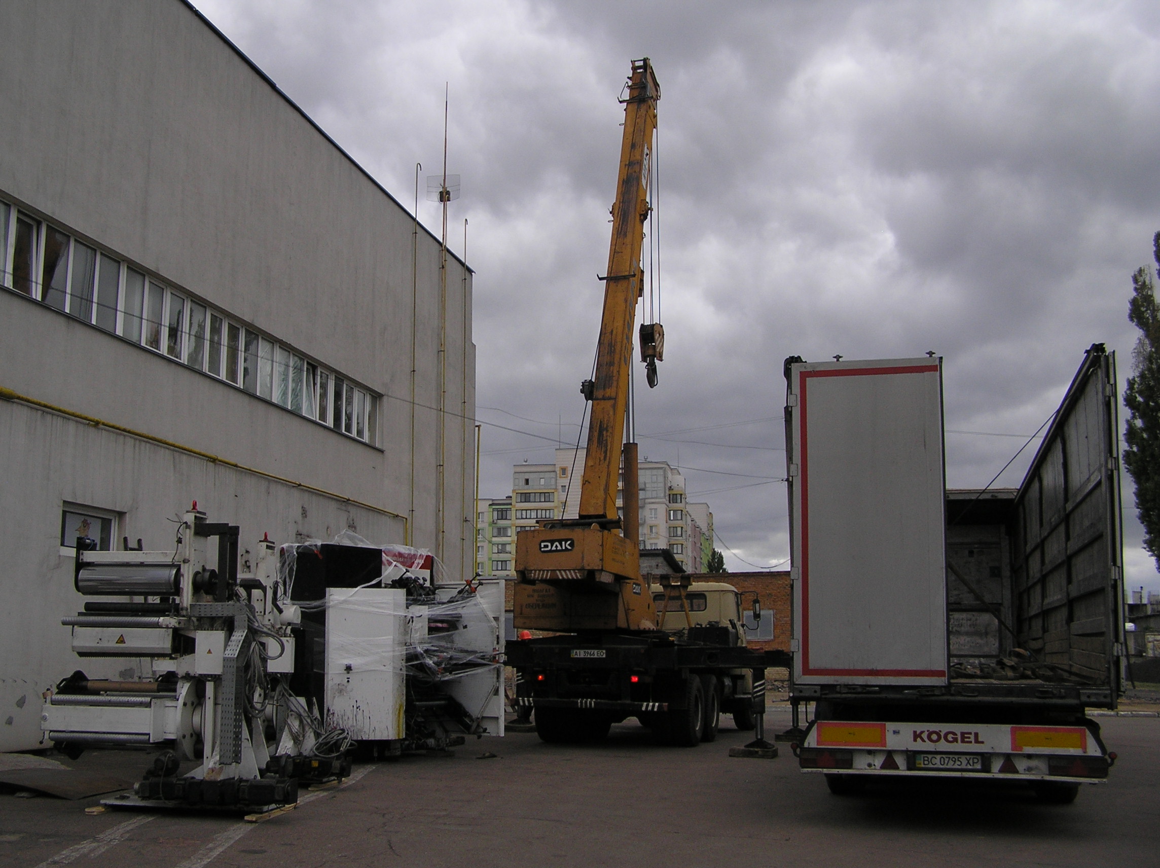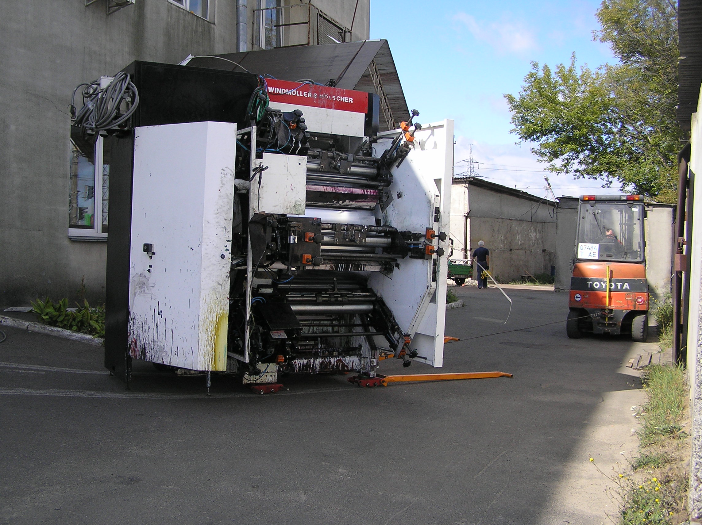 Печатное производство целиком переезжало из Киева в Днепропетровск. Линия состояла из печатной машины весом 8 т и нескольких агрегатов весом 1- 2т. Нам предстояло выкатить печатную машину из цеха на улицу и вместе с остальными агрегатами загрузить в кузов фуры. Полы в цеху были идеально ровными, тянуть машину по цеху помогал вилочный погрузчик. Сбросить скорость пришлось на выезде из цеха, так как имелся уклон и выбоины на асфальте. На спуске груз ускорялся сам, так что пришлось его даже придерживать. Но опасный участок был благополучно преодолен и дальнейший путь по асфальту прошел без осложнений.