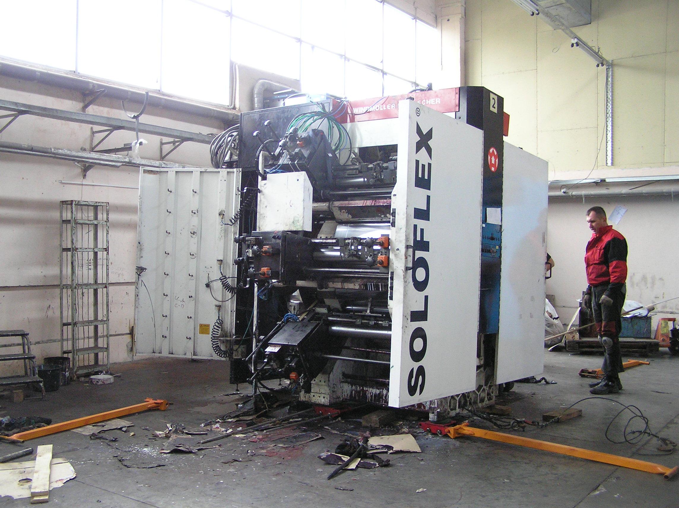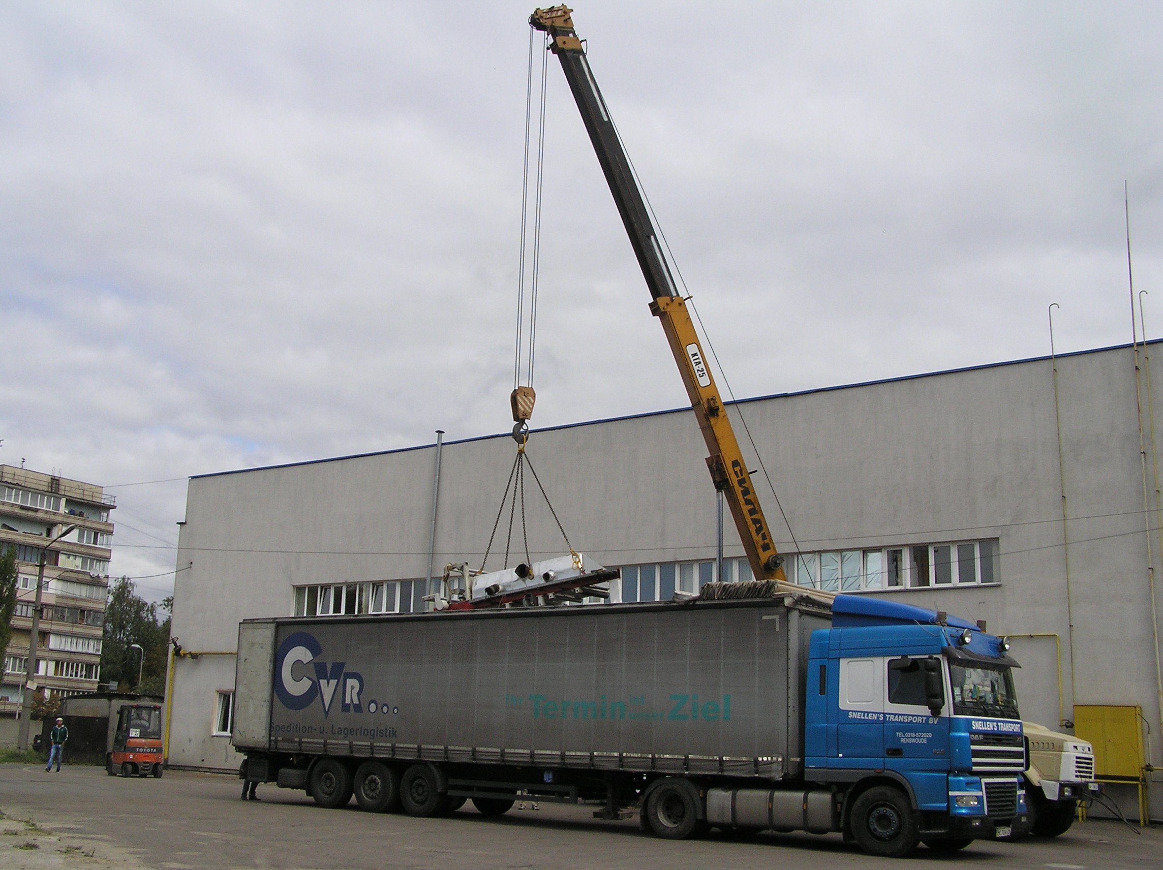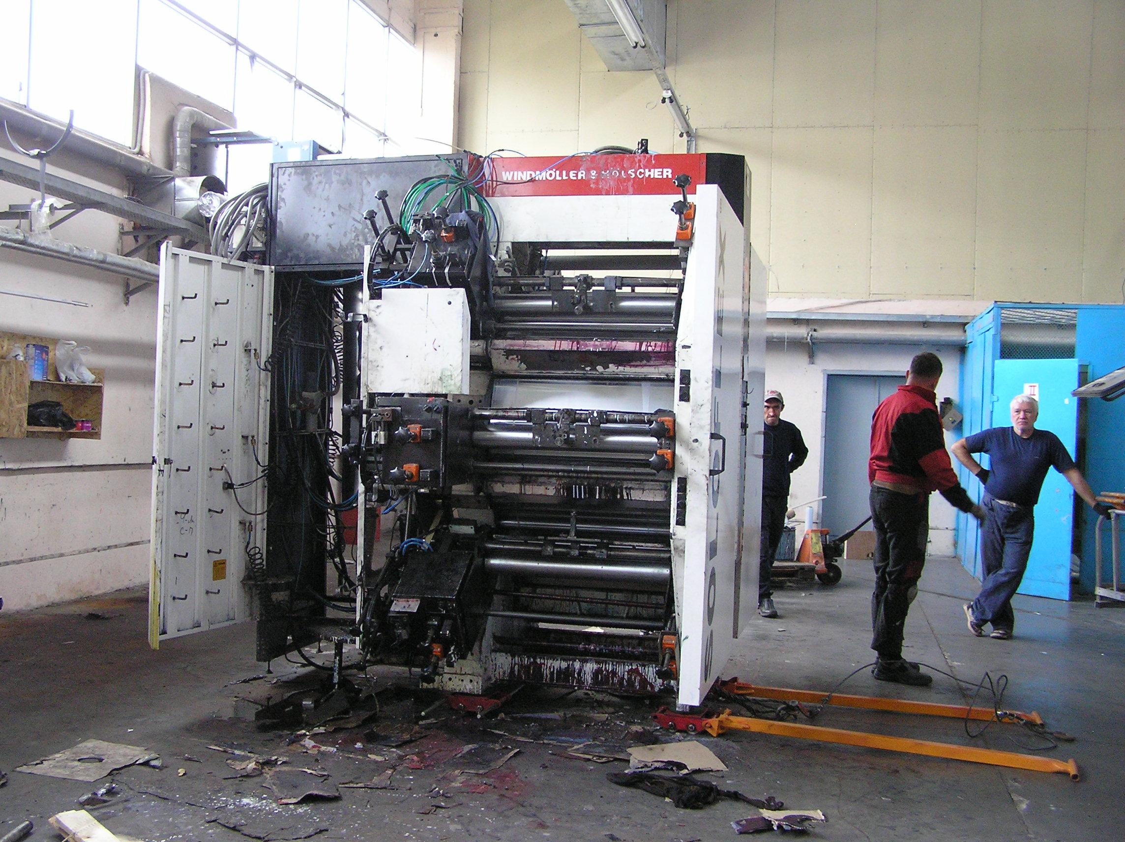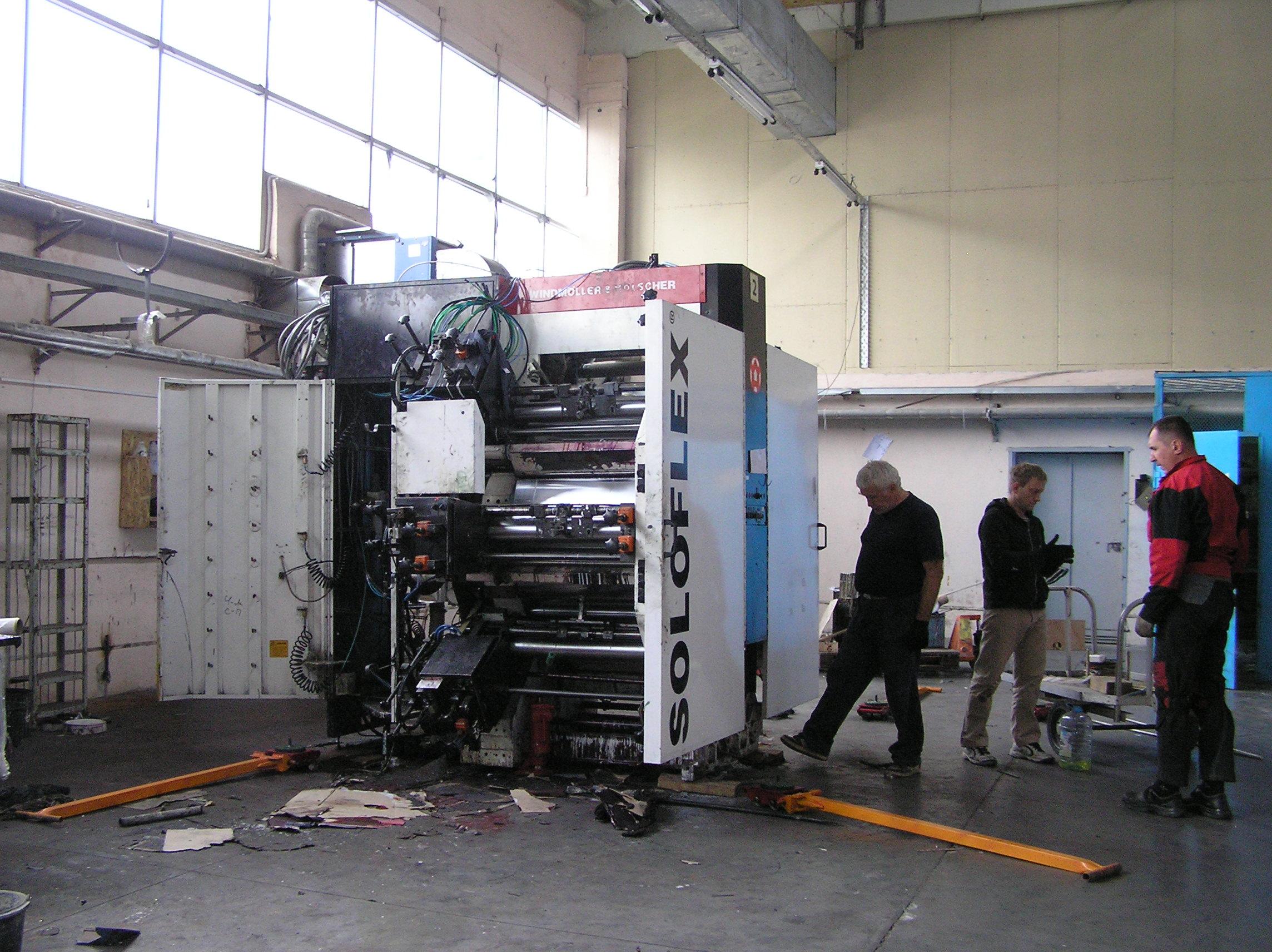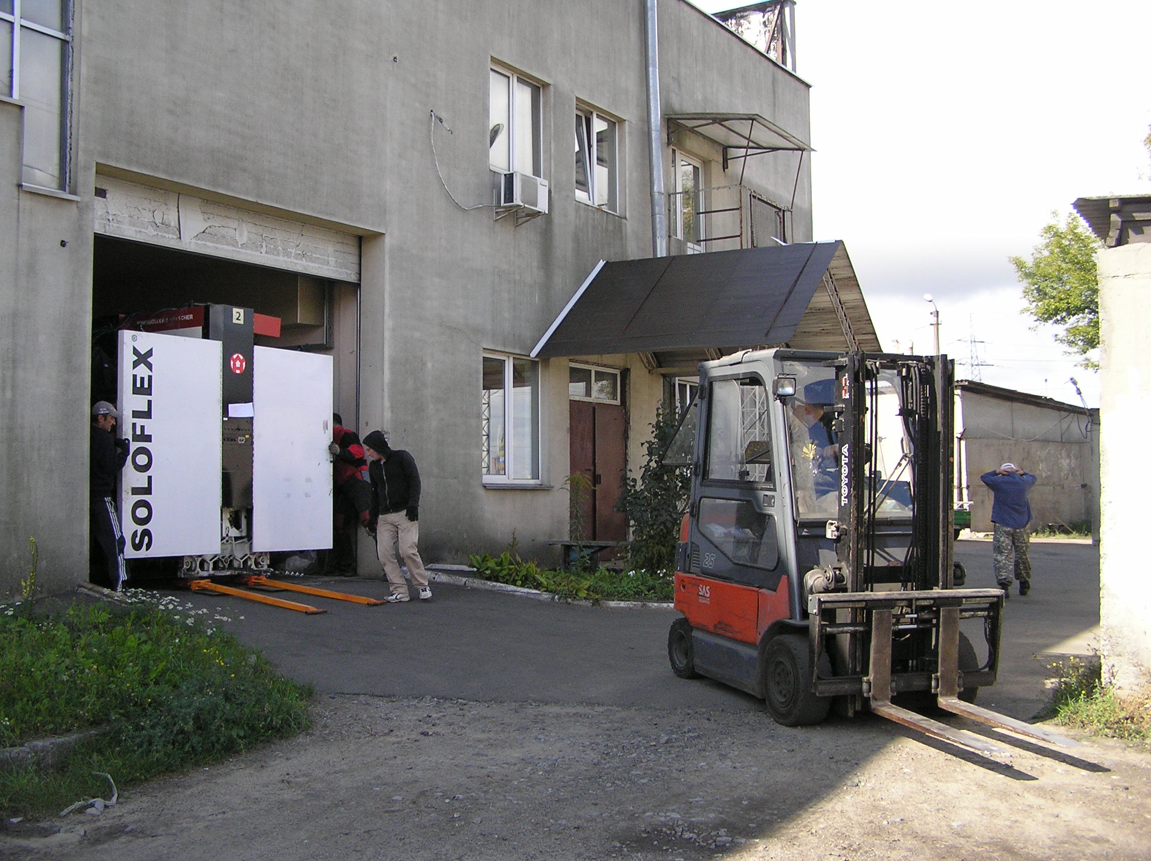 Печатное производство целиком переезжало из Киева в Днепропетровск. Линия состояла из печатной машины весом 8 т и нескольких агрегатов весом 1- 2т. Нам предстояло выкатить печатную машину из цеха на улицу и вместе с остальными агрегатами загрузить в кузов фуры. Полы в цеху были идеально ровными, тянуть машину по цеху помогал вилочный погрузчик. Сбросить скорость пришлось на выезде из цеха, так как имелся уклон и выбоины на асфальте. На спуске груз ускорялся сам, так что пришлось его даже придерживать. Но опасный участок был благополучно преодолен и дальнейший путь по асфальту прошел без осложнений.