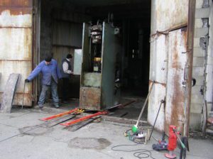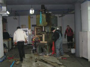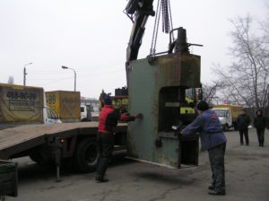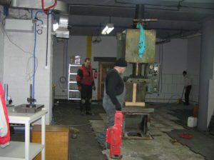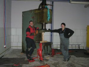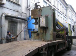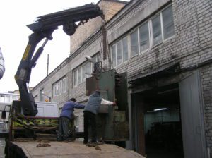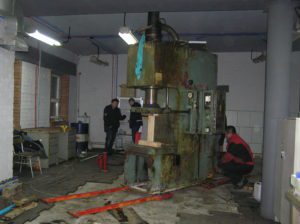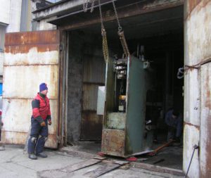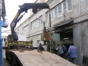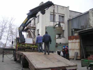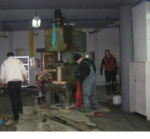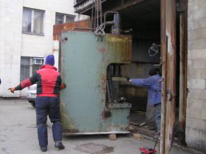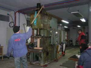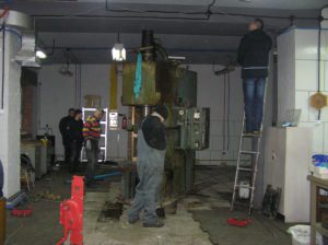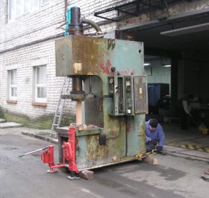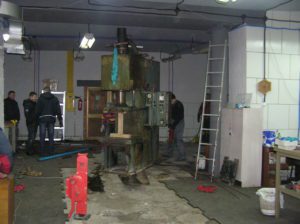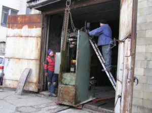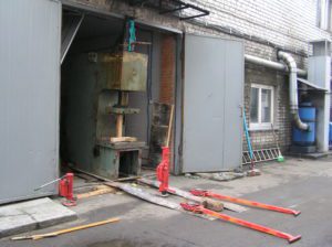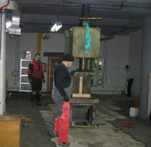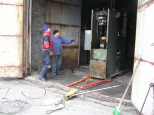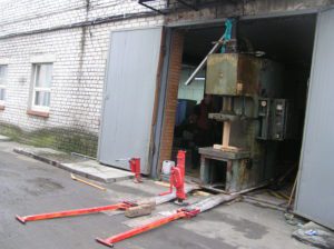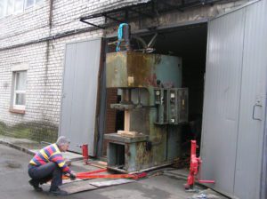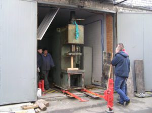 Замерив рулеткой высоту ворот, мы поняли, что до победы ещё далеко. Пресс не проходил. Очень искренне удивились этому факту даже заказчики. Подразобрав верхушку пресса, оказалось, что проходит, но без тележек, тупо на пузе! Мы стараемся так не работать, но другого выхода не было. Как поганый кот, елозя задом по полу, станок въехал в цех.