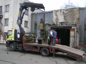 Крепыш был прибит к полу анкерами и залит по периметру качественным бетоном. Вся эта красота была нами не сразу, но демонтирована и пресс встал на тележки. Дорогу на выезд преграждала канава с непонятными трубами. Получив разрешение владельцев цеха, мы забили преграду строительным мусором и двинулись дальше. Пресс высотой более трех метров, плавно огибая преграды, пёр на выход.