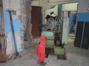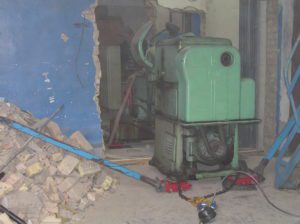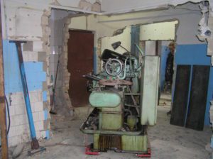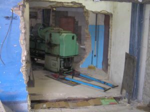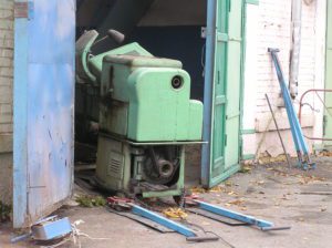 Токарный станок весом 5000 кг. предстояло вытащить из помещения в связи с проведением ремонта. Специально для этого в стене был сделан пролом, через который по направлению к воротам из помещения предстояло двигаться. Отличительной особенностью этой работы являлось наличие канавы с проложенными еще в советские времена электрическими коммуникациями. Канава находилась прямо по пути движения от стены и до стены и обойти ее было нельзя. Но опыт не пропьешь — токарный станок легко и непринужденны преодолел препятствия и продолжил свой путь к выходу из помещения. Так как дальнейшая судьба крепыша была неопределенна, было решено оставить его на парковки среди машин.