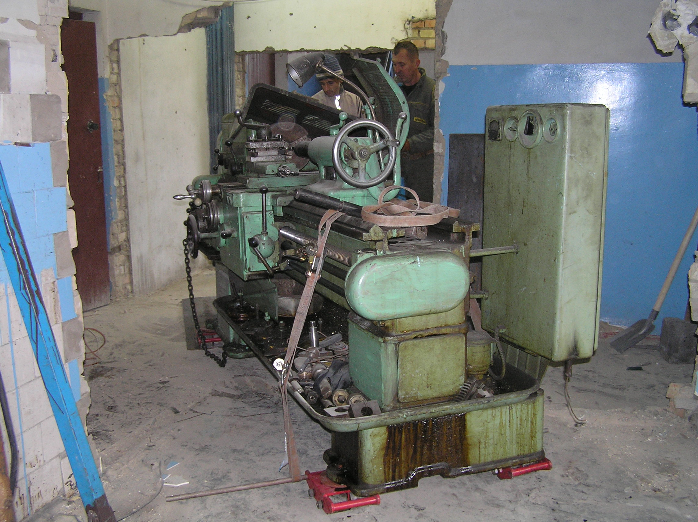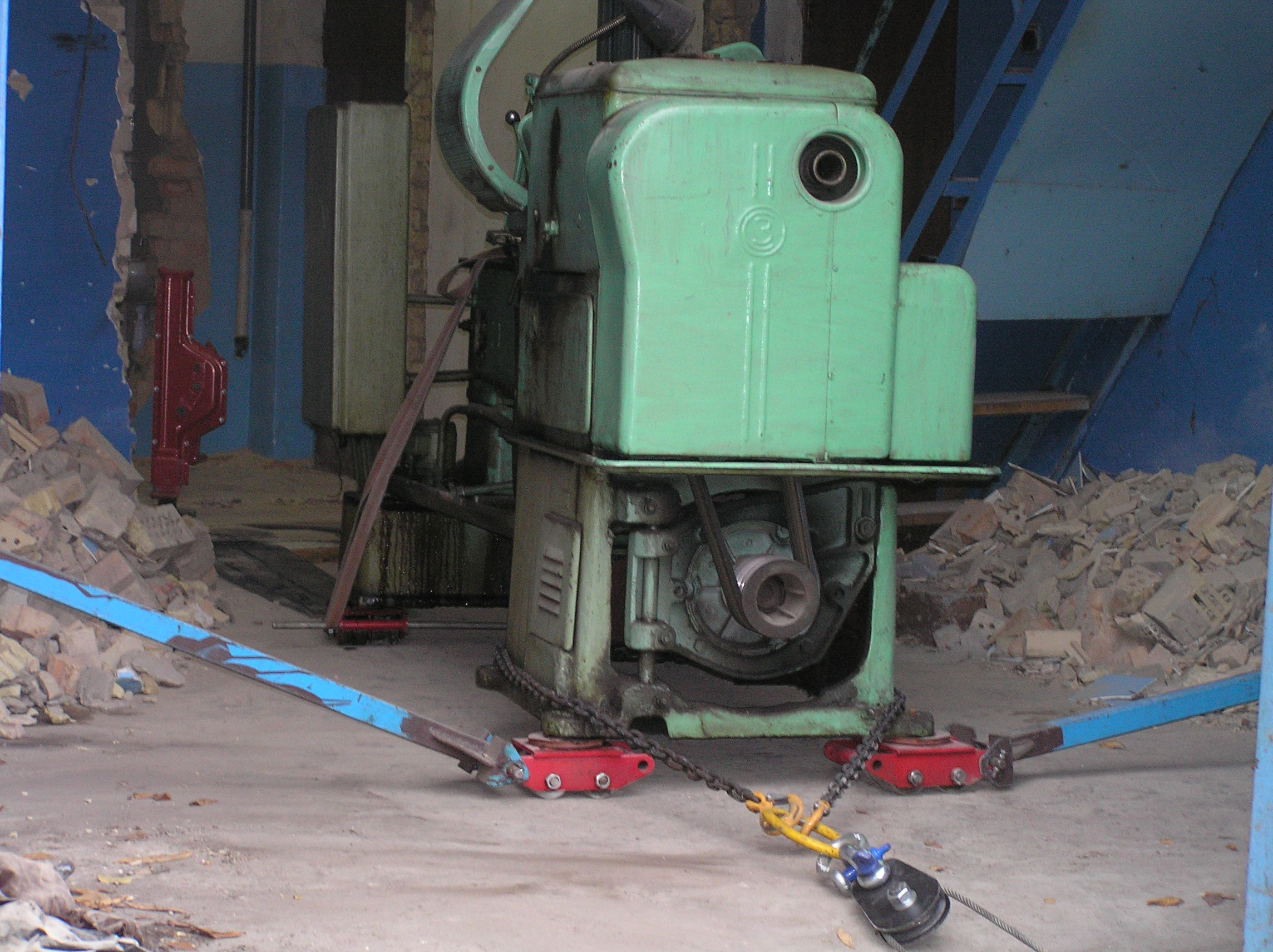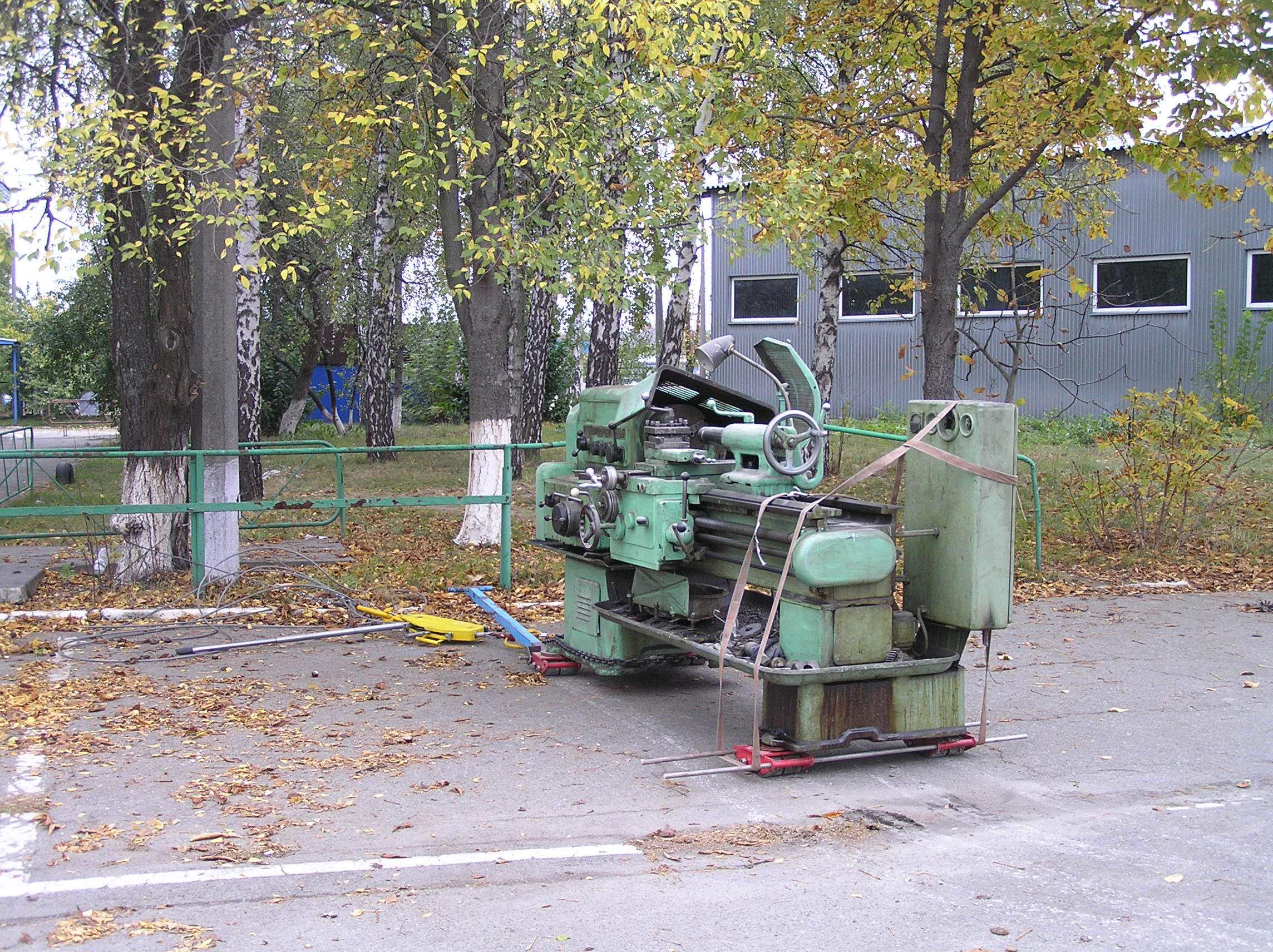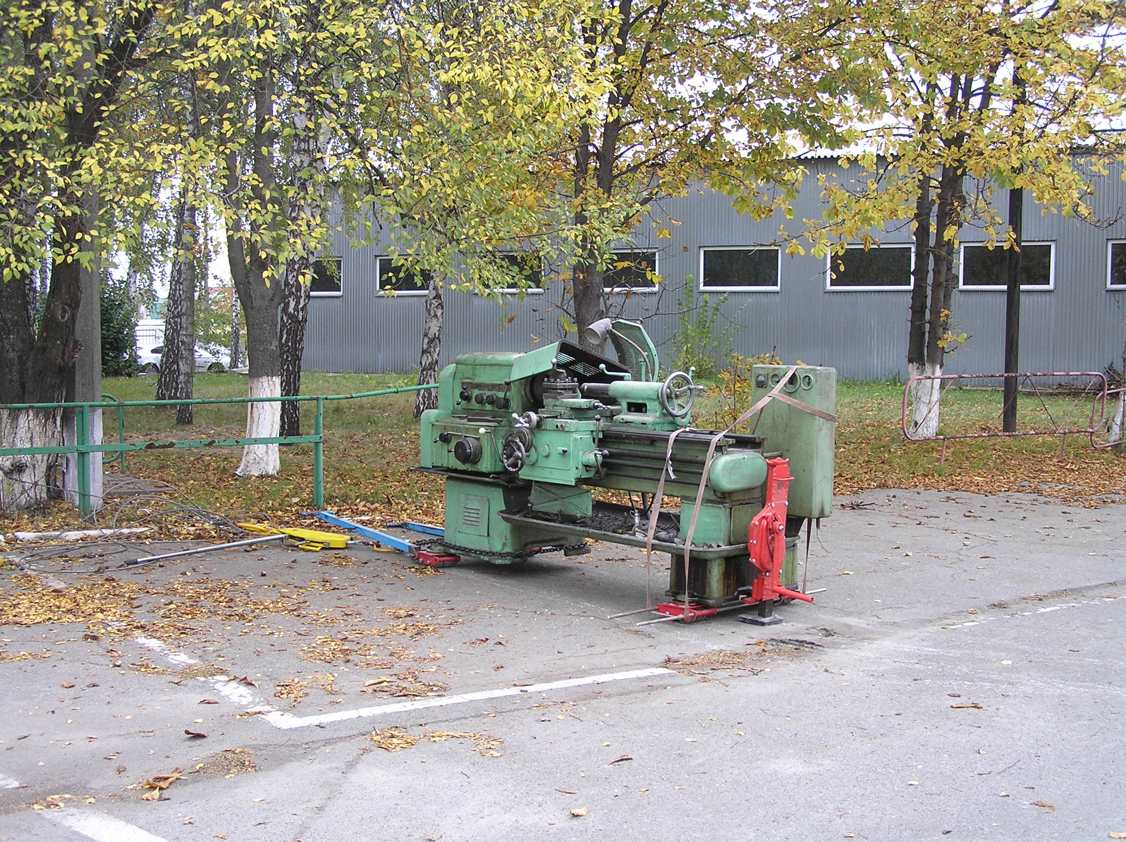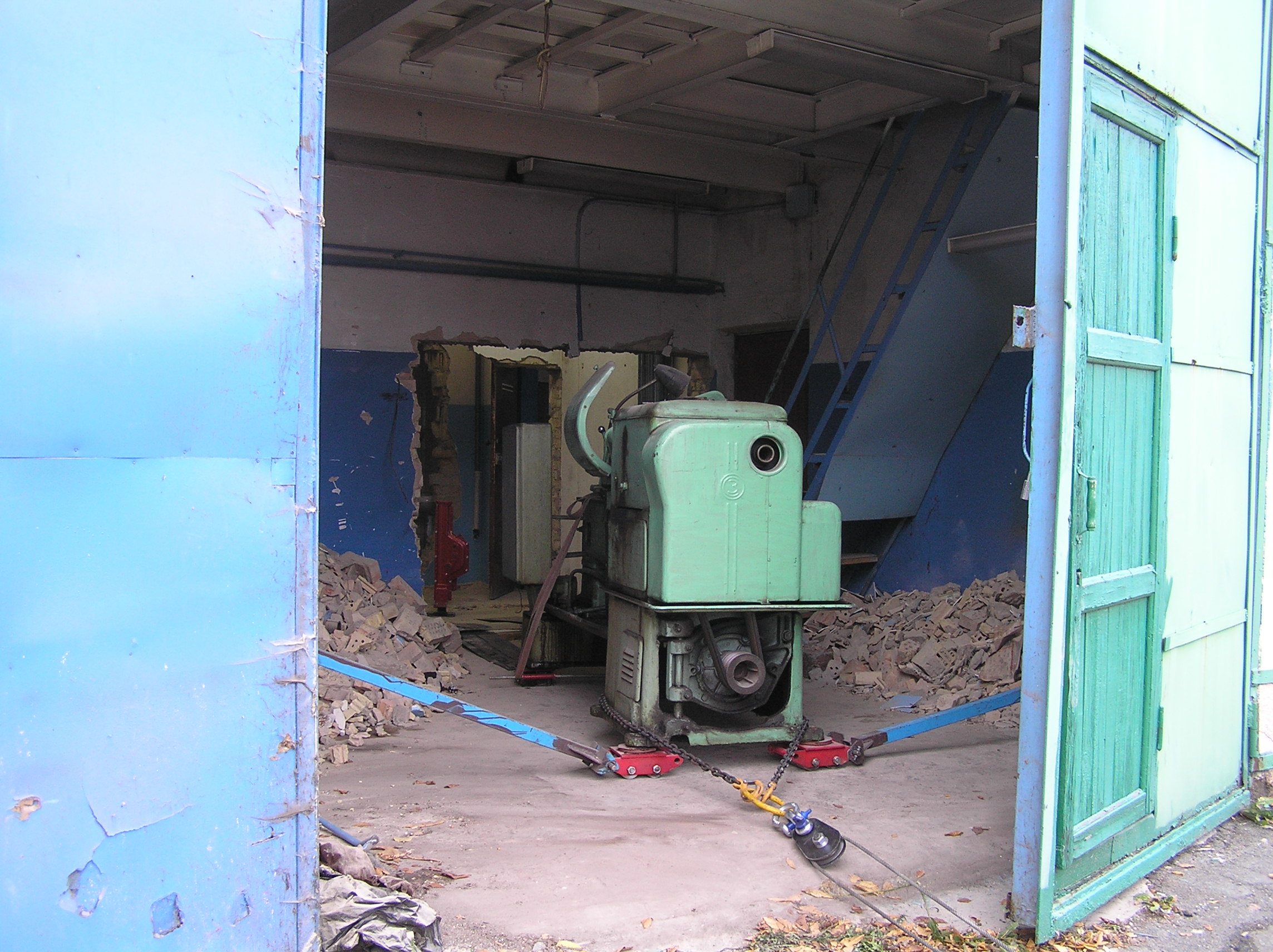 Токарный станок весом 5000 кг. предстояло вытащить из помещения в связи с проведением ремонта. Специально для этого в стене был сделан пролом, через который по направлению к воротам из помещения предстояло двигаться. Отличительной особенностью этой работы являлось наличие канавы с проложенными еще в советские времена электрическими коммуникациями. Канава находилась прямо по пути движения от стены и до стены и обойти ее было нельзя. Но опыт не пропьешь — токарный станок легко и непринужденны преодолел препятствия и продолжил свой путь к выходу из помещения. Так как дальнейшая судьба крепыша была неопределенна, было решено оставить его на парковки среди машин.