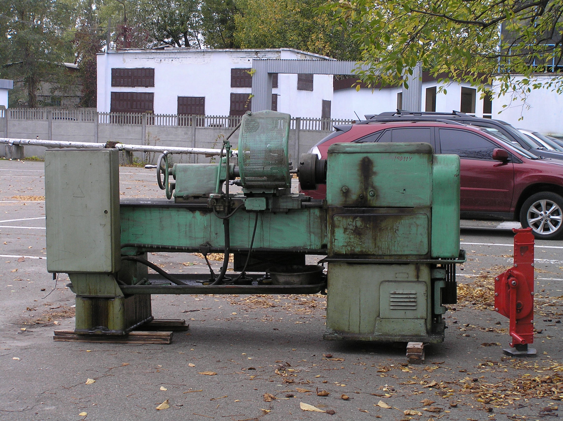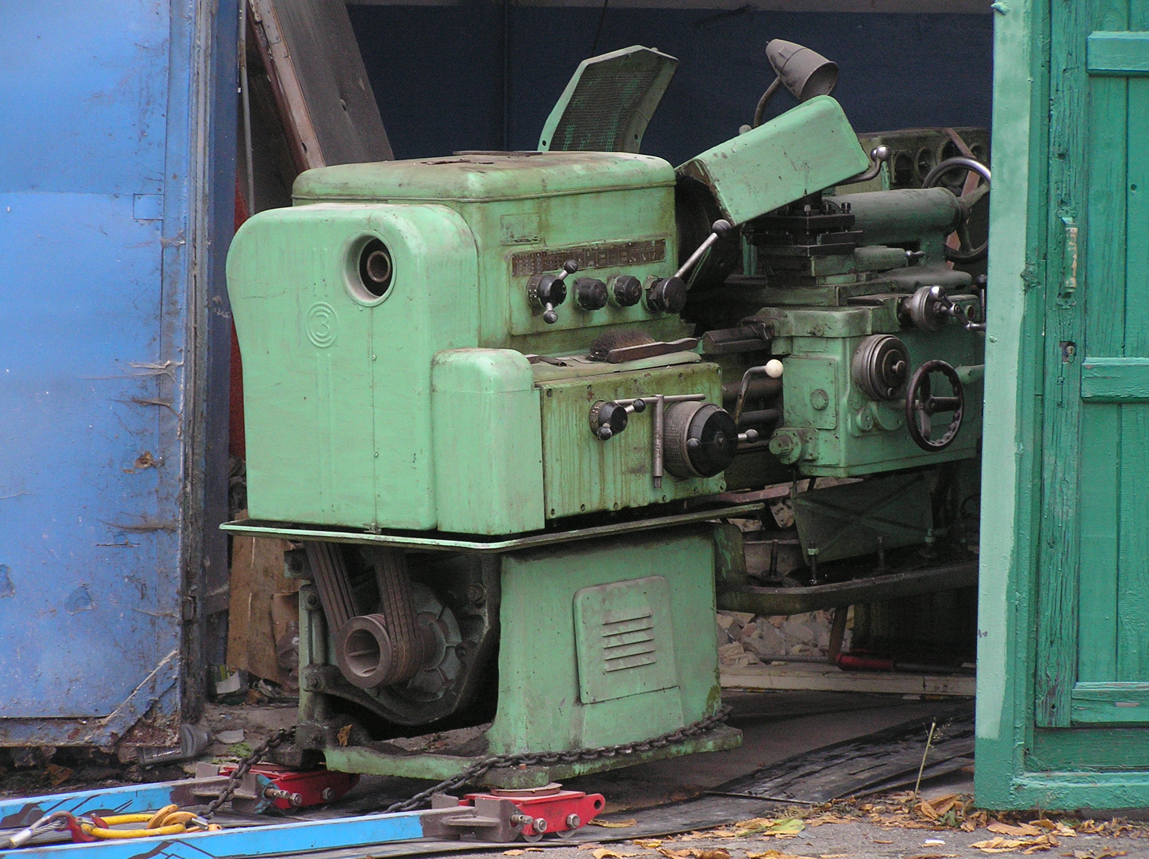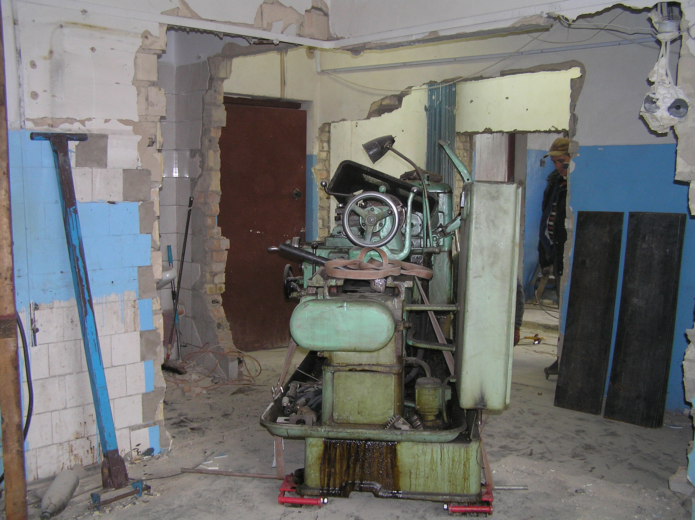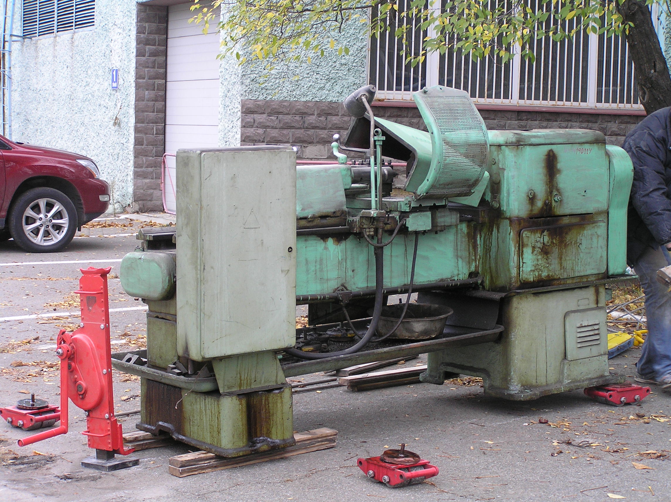 Токарный станок весом 5000 кг. предстояло вытащить из помещения в связи с проведением ремонта. Специально для этого в стене был сделан пролом, через который по направлению к воротам из помещения предстояло двигаться. Отличительной особенностью этой работы являлось наличие канавы с проложенными еще в советские времена электрическими коммуникациями. Канава находилась прямо по пути движения от стены и до стены и обойти ее было нельзя. Но опыт не пропьешь — токарный станок легко и непринужденны преодолел препятствия и продолжил свой путь к выходу из помещения. Так как дальнейшая судьба крепыша была неопределенна, было решено оставить его на парковки среди машин.
