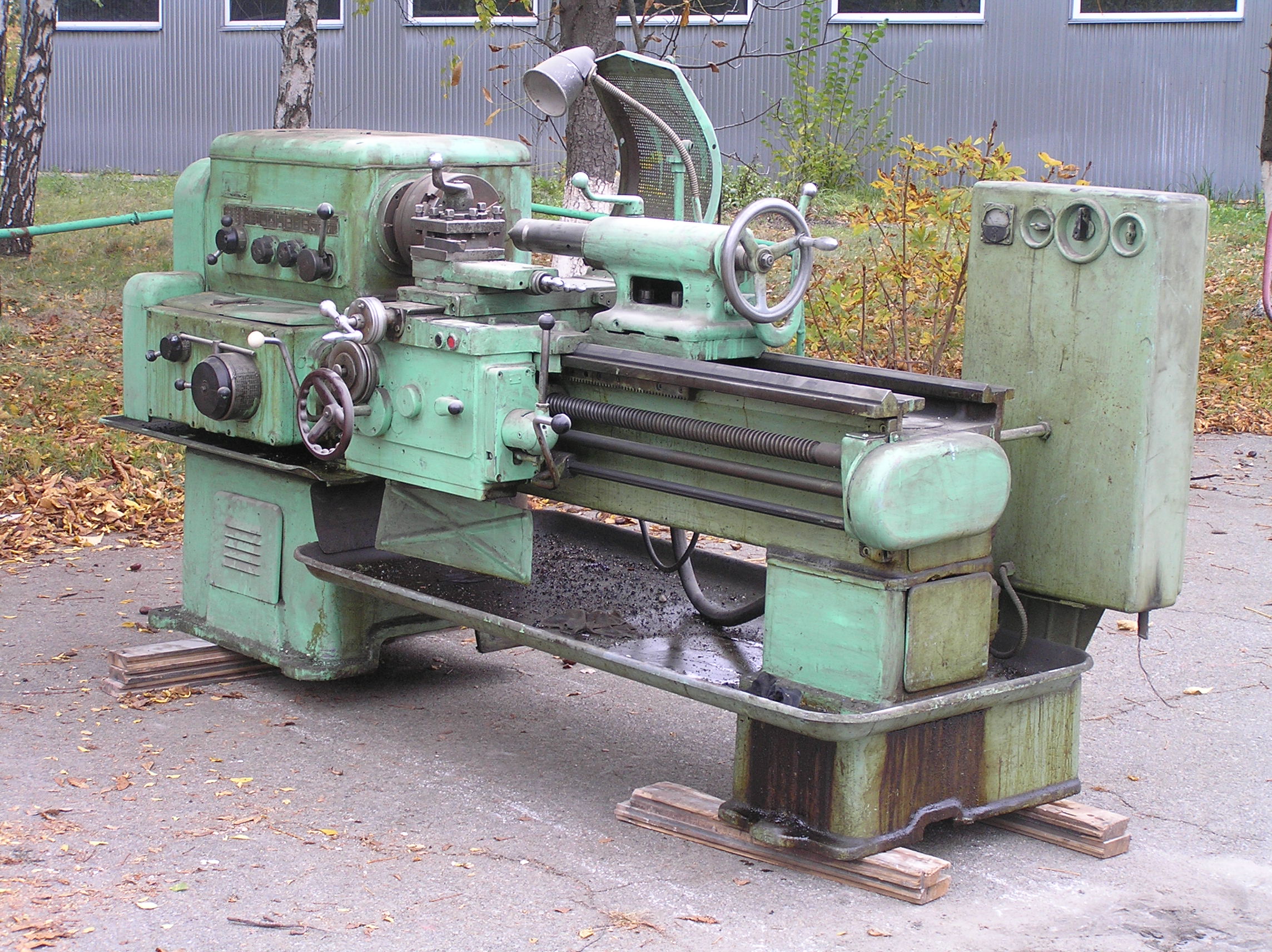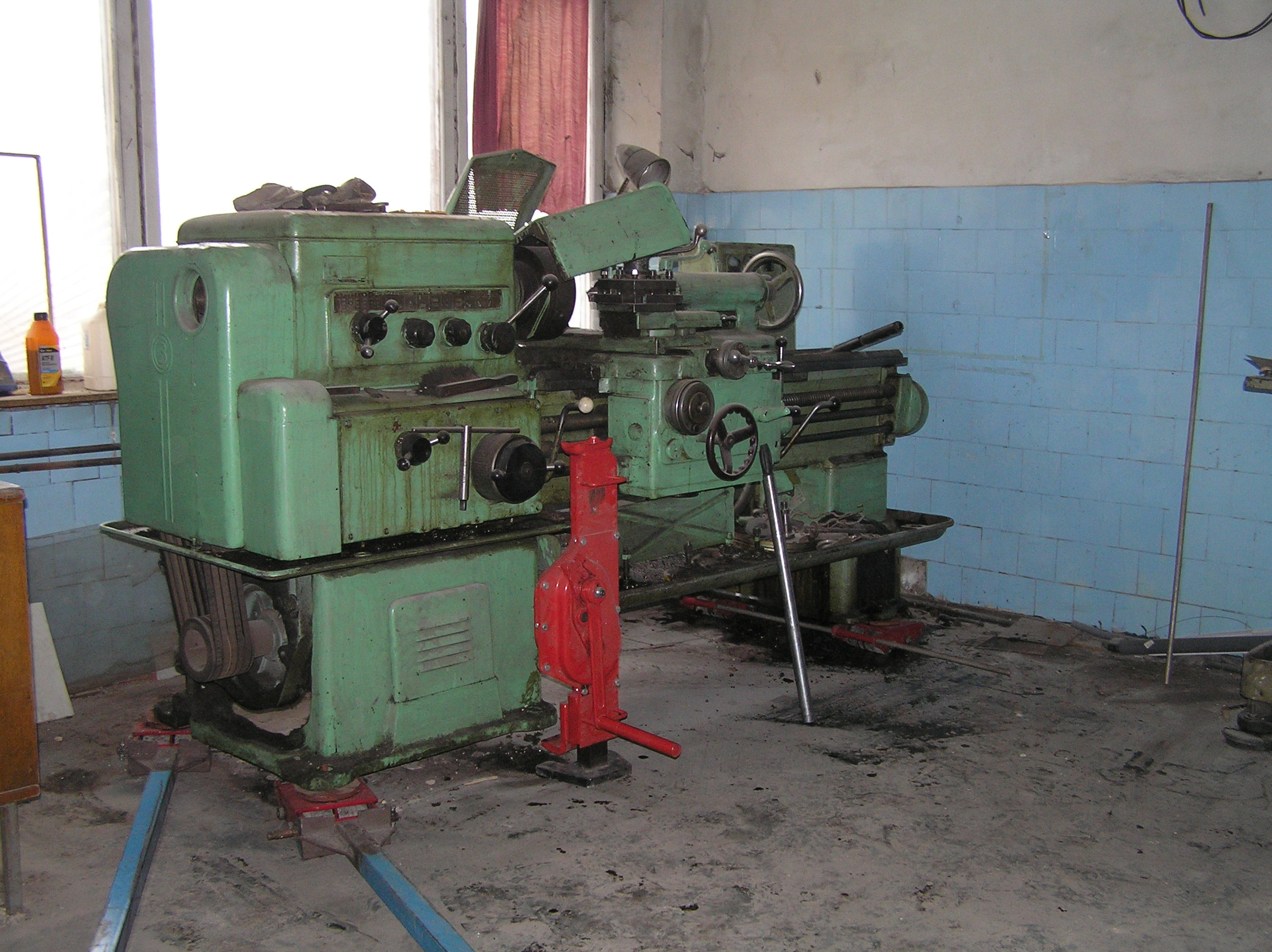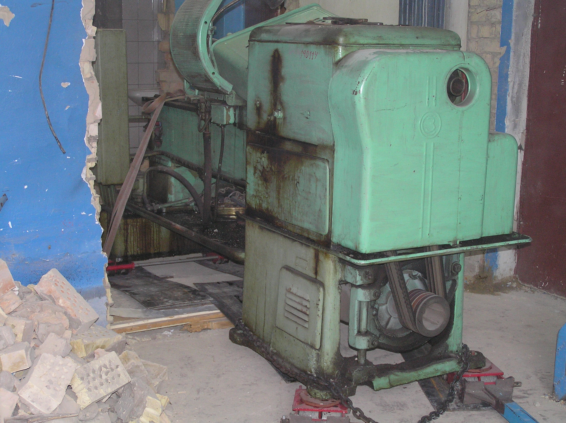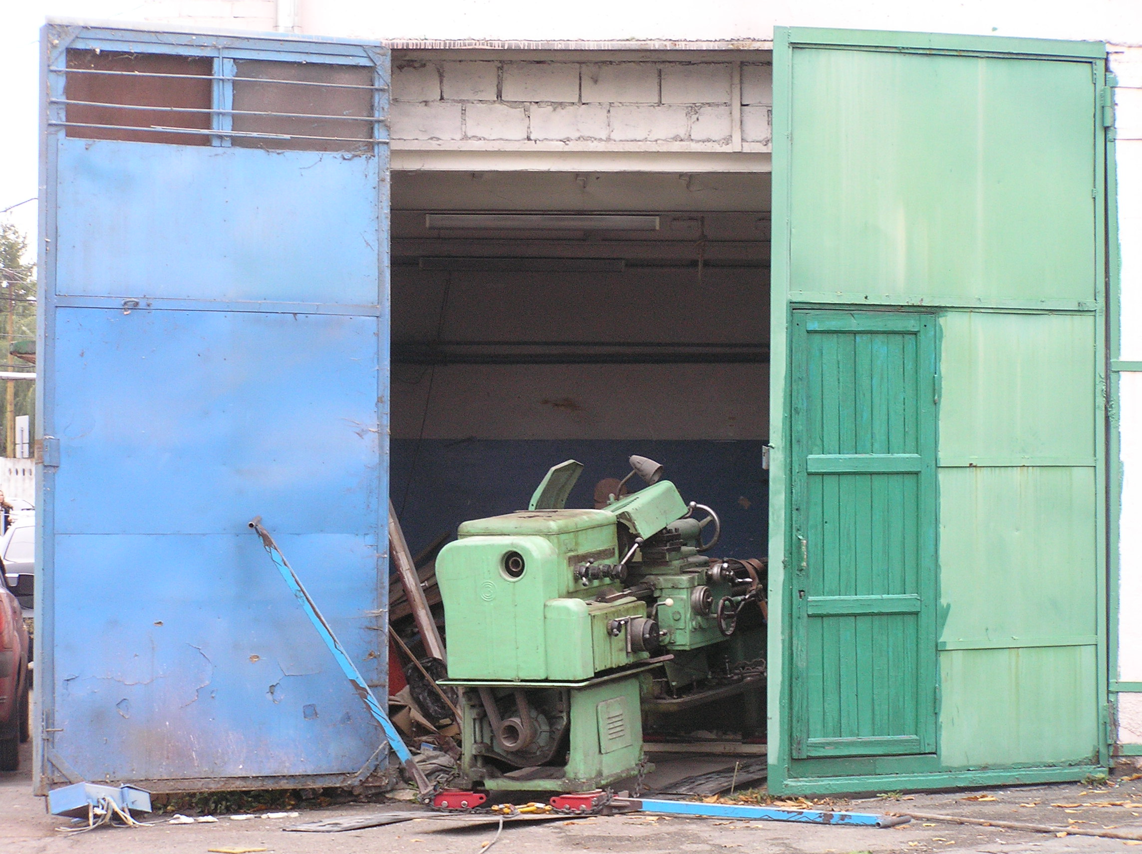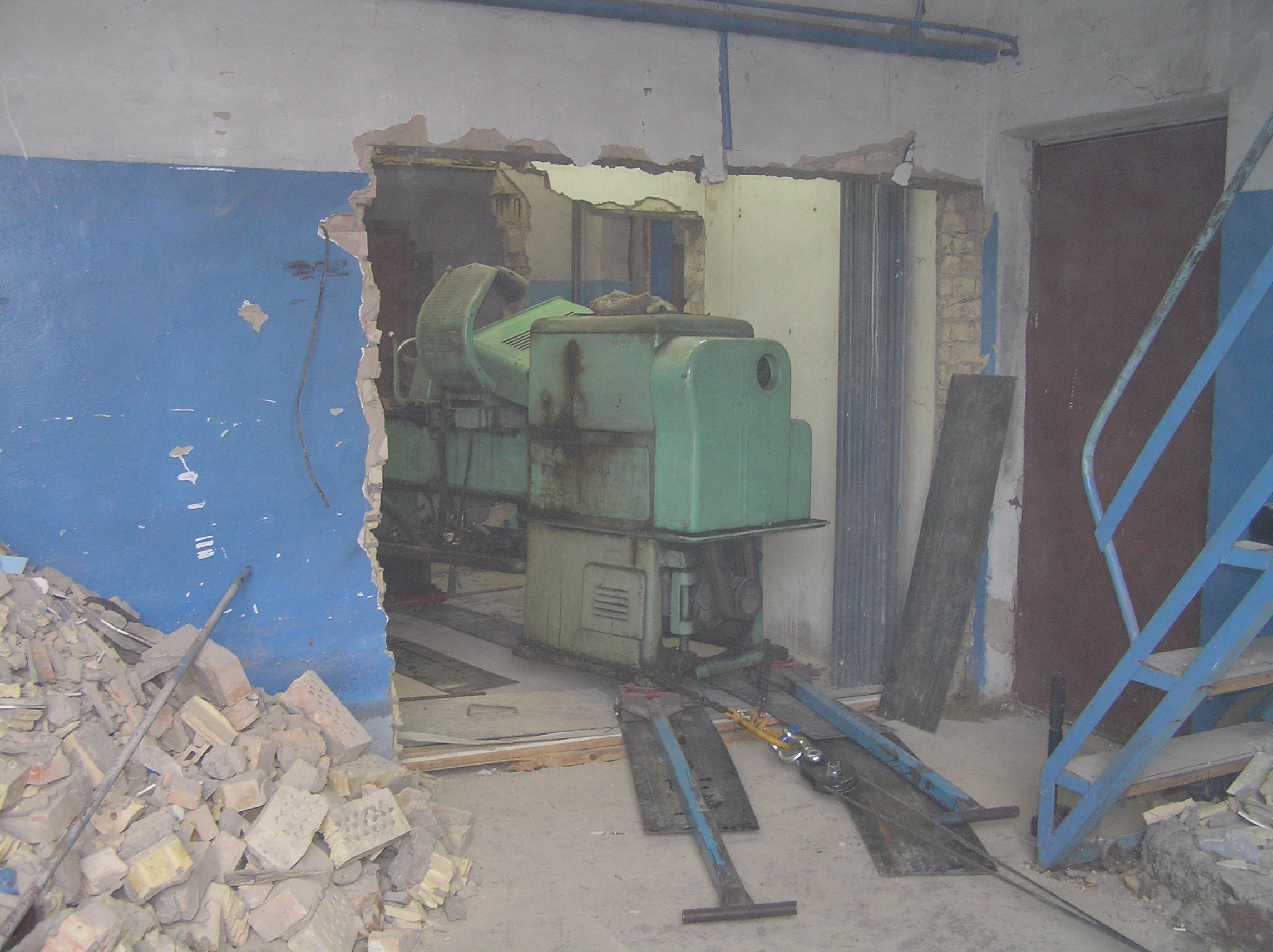 Токарный станок весом 5000 кг. предстояло вытащить из помещения в связи с проведением ремонта. Специально для этого в стене был сделан пролом, через который по направлению к воротам из помещения предстояло двигаться. Отличительной особенностью этой работы являлось наличие канавы с проложенными еще в советские времена электрическими коммуникациями. Канава находилась прямо по пути движения от стены и до стены и обойти ее было нельзя. Но опыт не пропьешь — токарный станок легко и непринужденны преодолел препятствия и продолжил свой путь к выходу из помещения. Так как дальнейшая судьба крепыша была неопределенна, было решено оставить его на парковки среди машин.