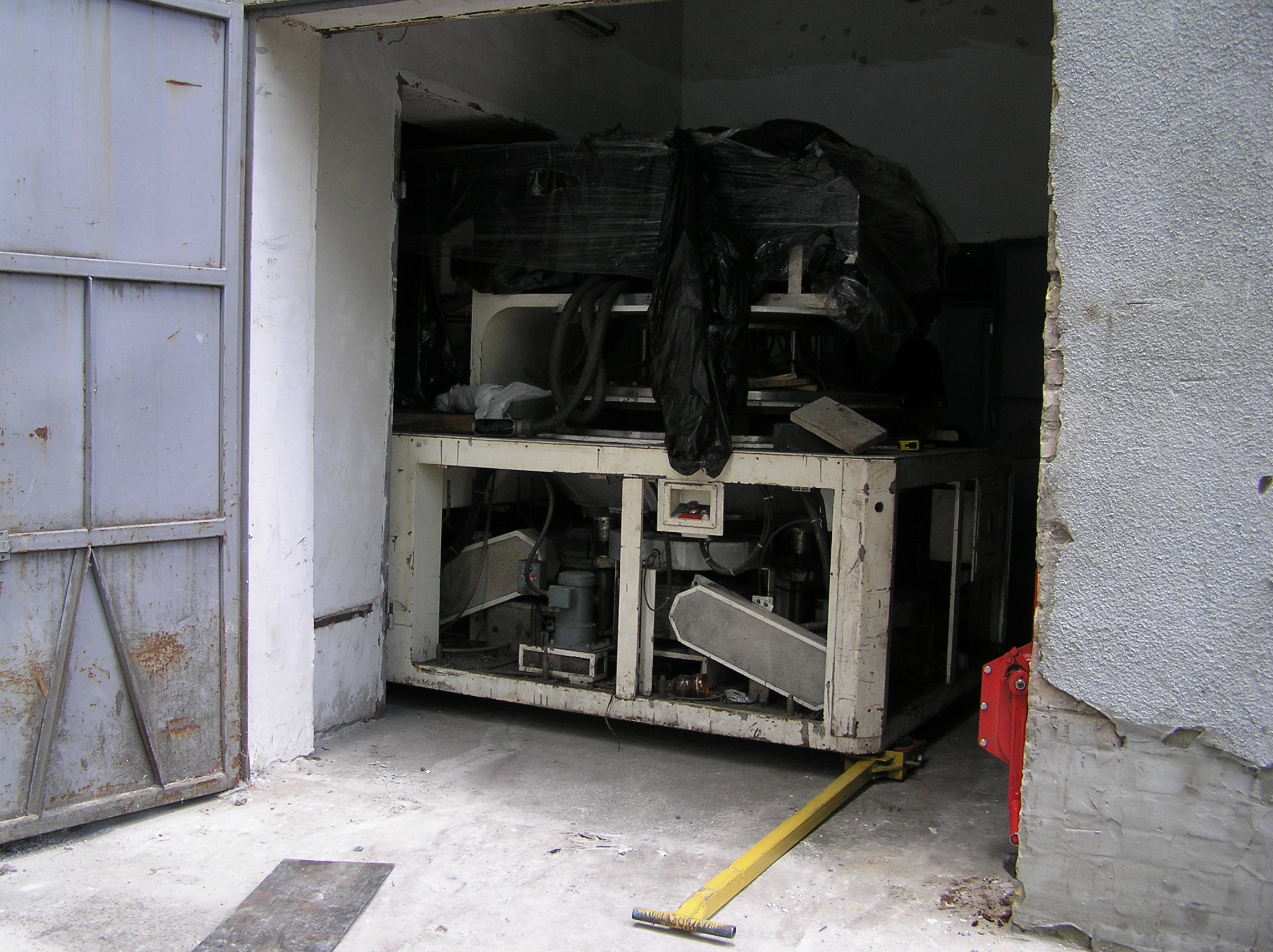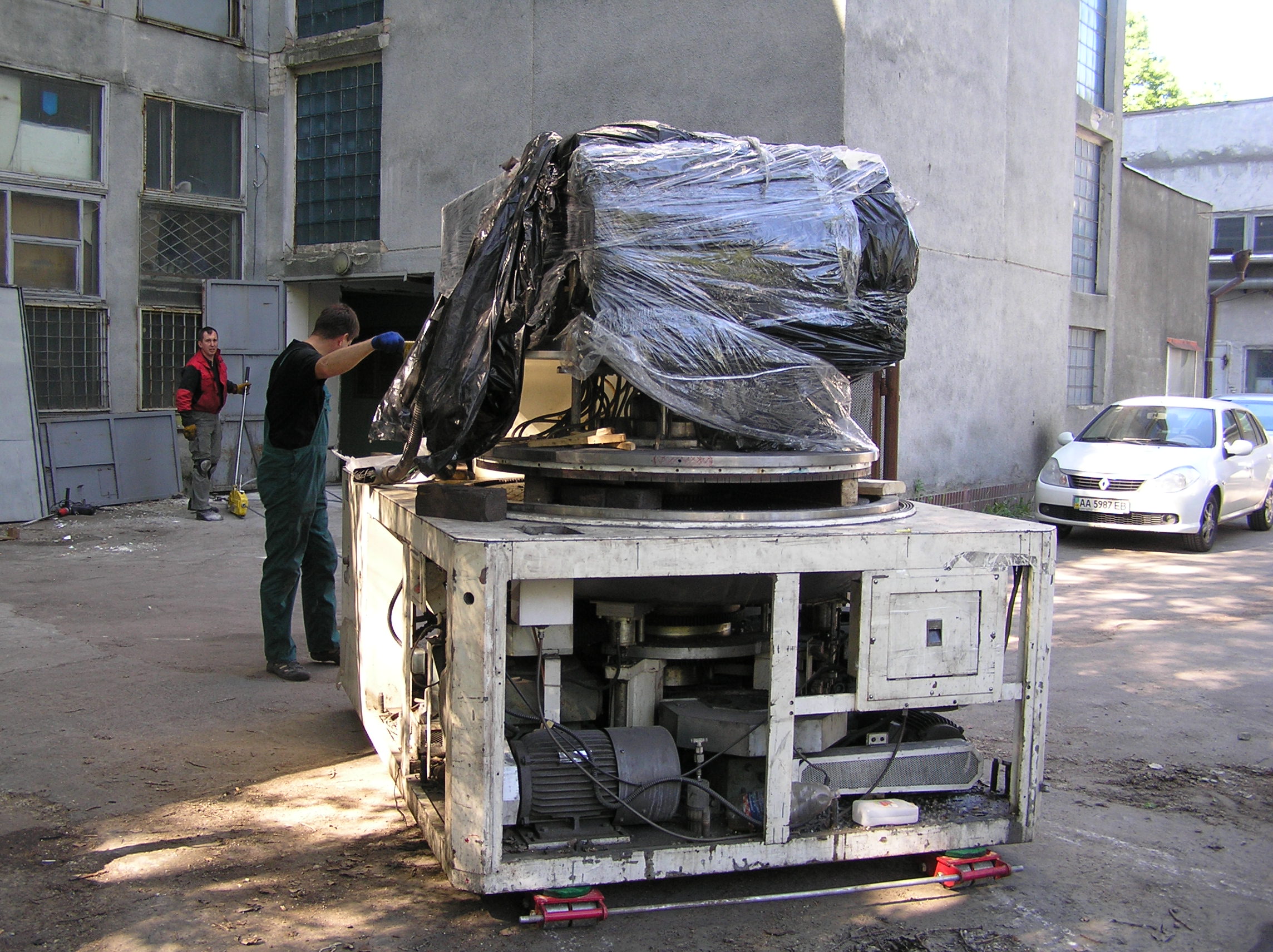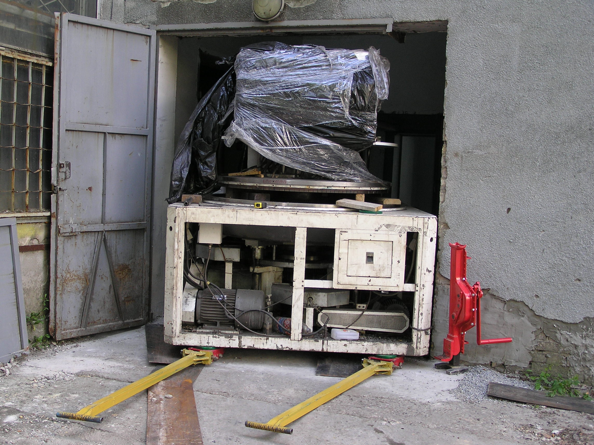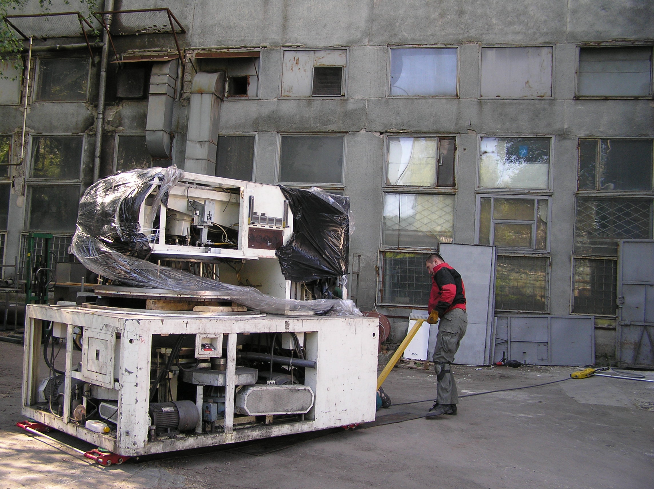 Так много за одну работу мы еще не поворачивали. Повороты при въезде в цех, повороты на месте, чтобы проехать в проем ворот, повороты, повороты, повороты…. И зазоры между стенами и грузом минимальные, проемы просто нельзя было сделать шире. И это станком, вес которого превышал 6 т, хотя по нашим ощущениям, заказчик вес сильно занизил. Продавленные колесами тележек толстые стальные листы подтверждают эти предположения.