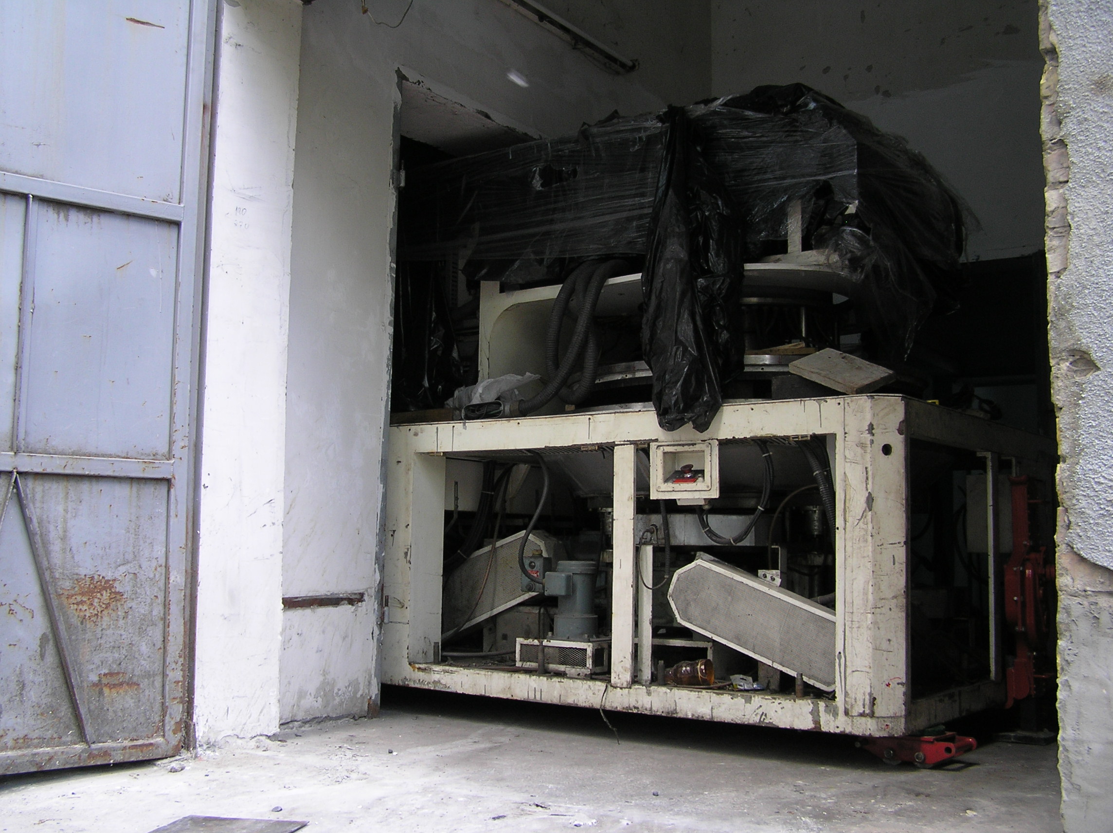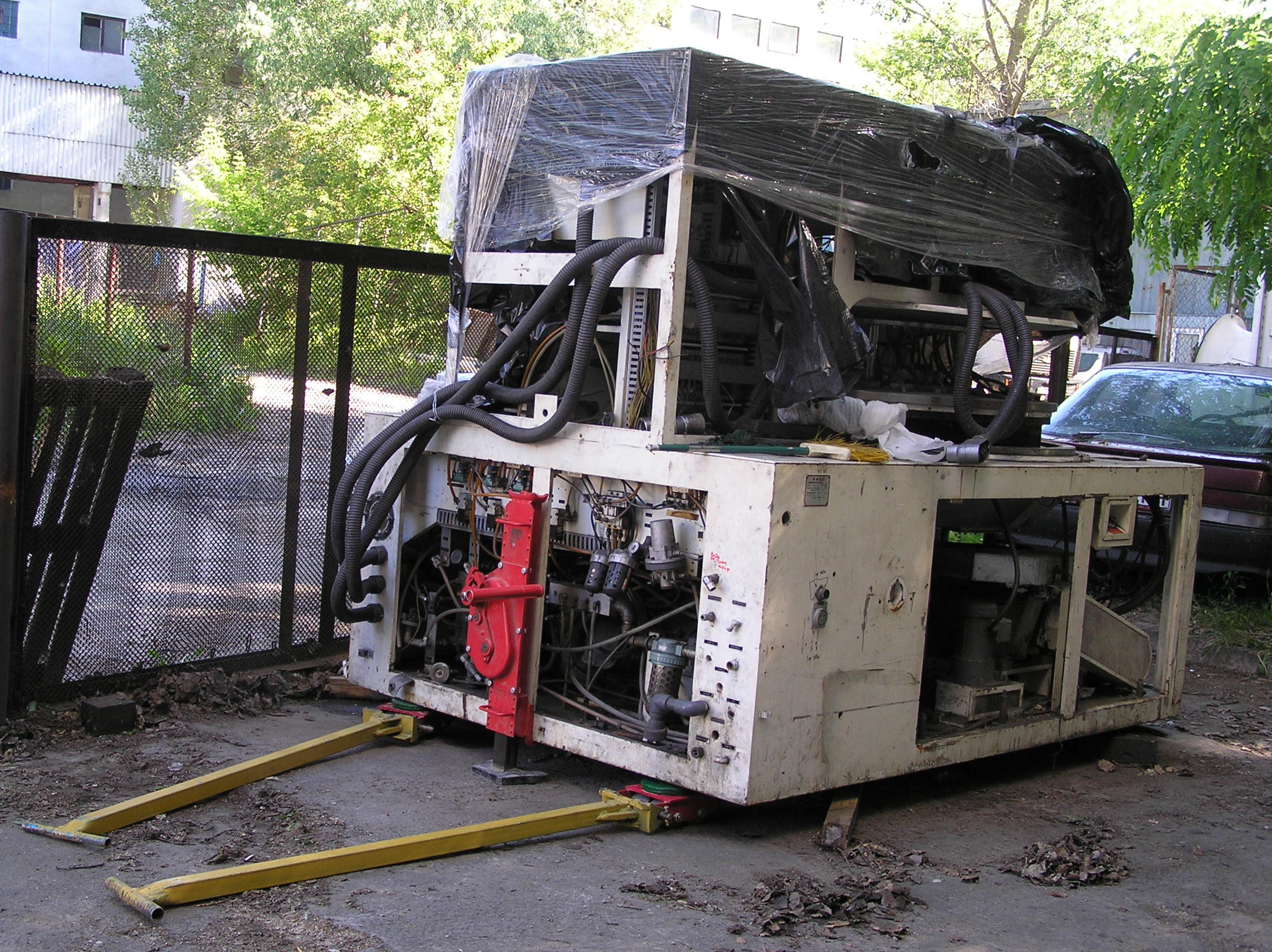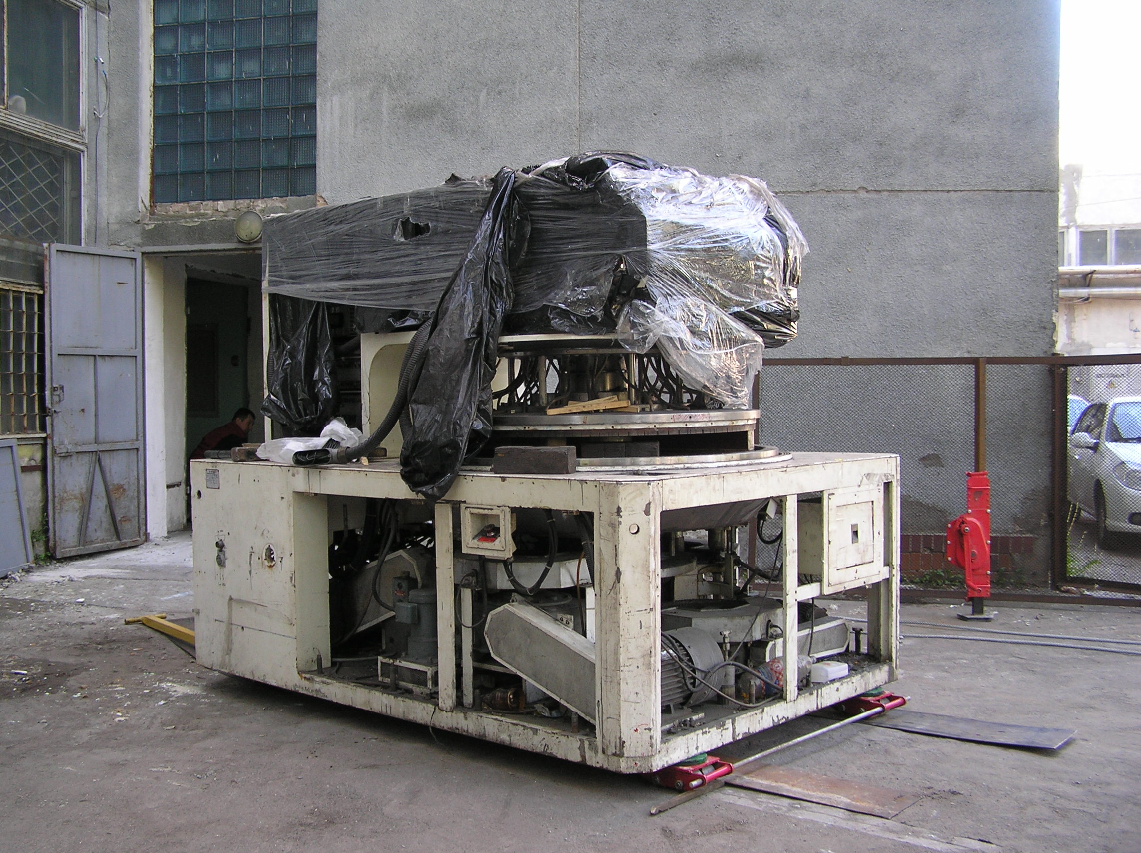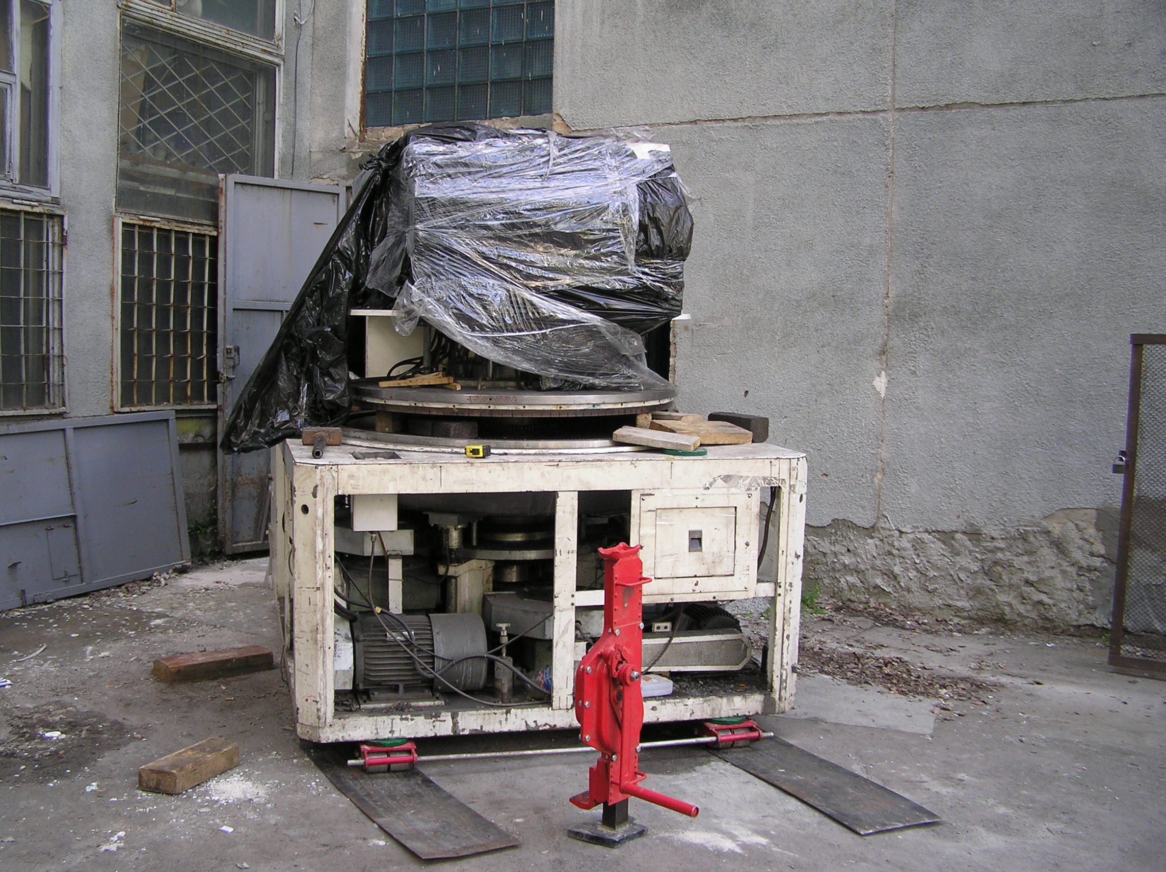 Так много за одну работу мы еще не поворачивали. Повороты при въезде в цех, повороты на месте, чтобы проехать в проем ворот, повороты, повороты, повороты…. И зазоры между стенами и грузом минимальные, проемы просто нельзя было сделать шире. И это станком, вес которого превышал 6 т, хотя по нашим ощущениям, заказчик вес сильно занизил. Продавленные колесами тележек толстые стальные листы подтверждают эти предположения.
