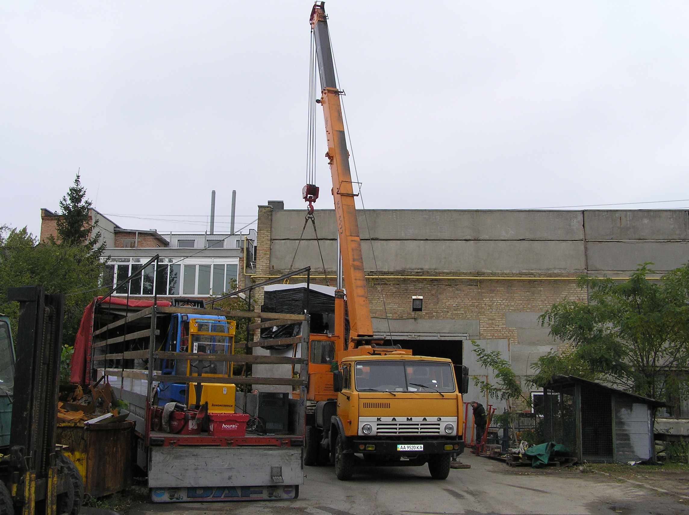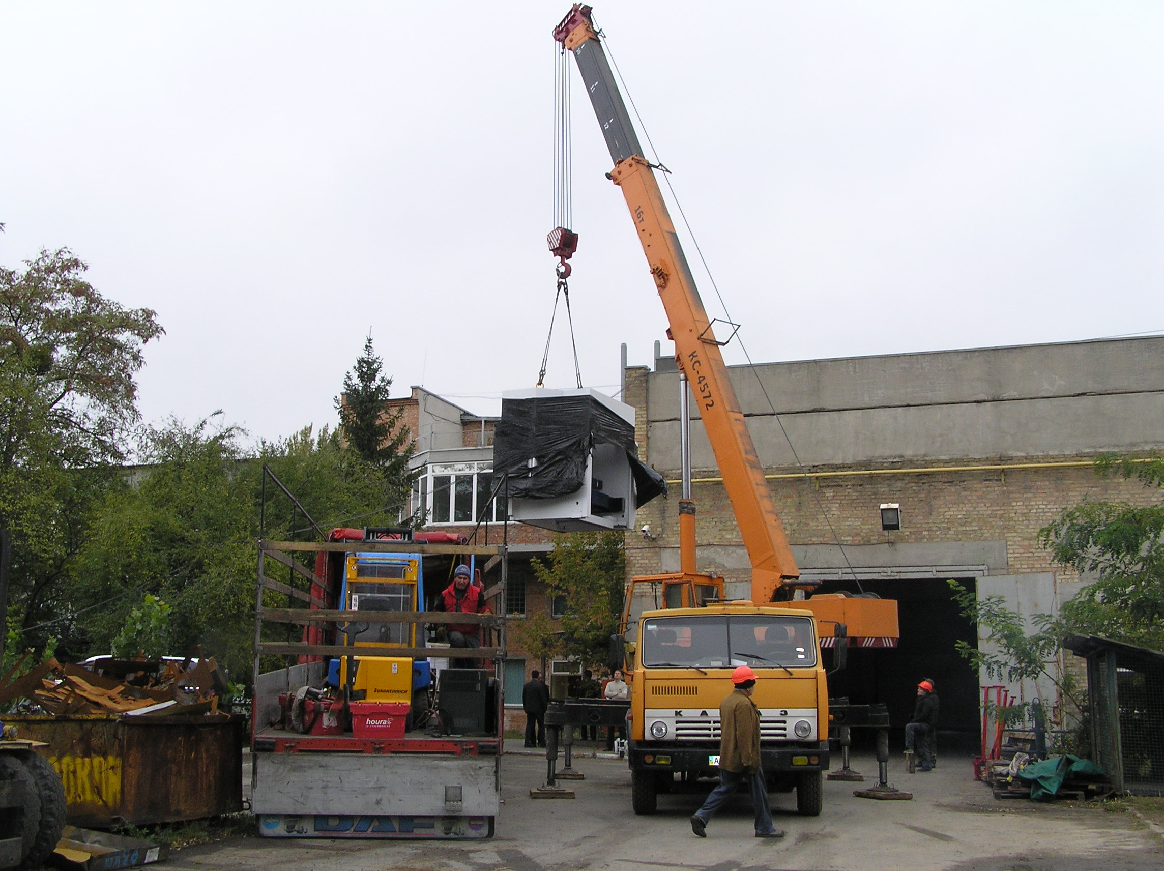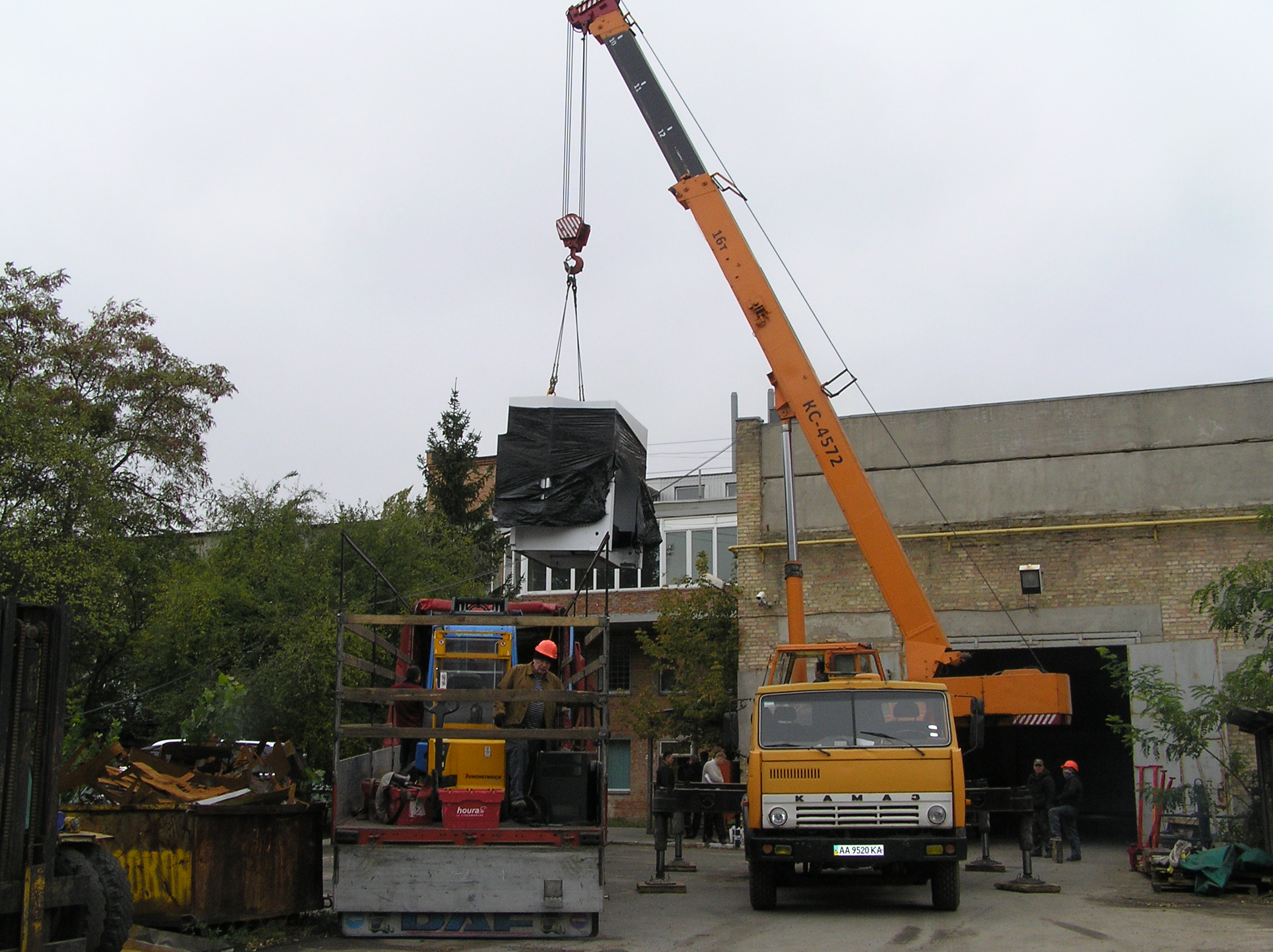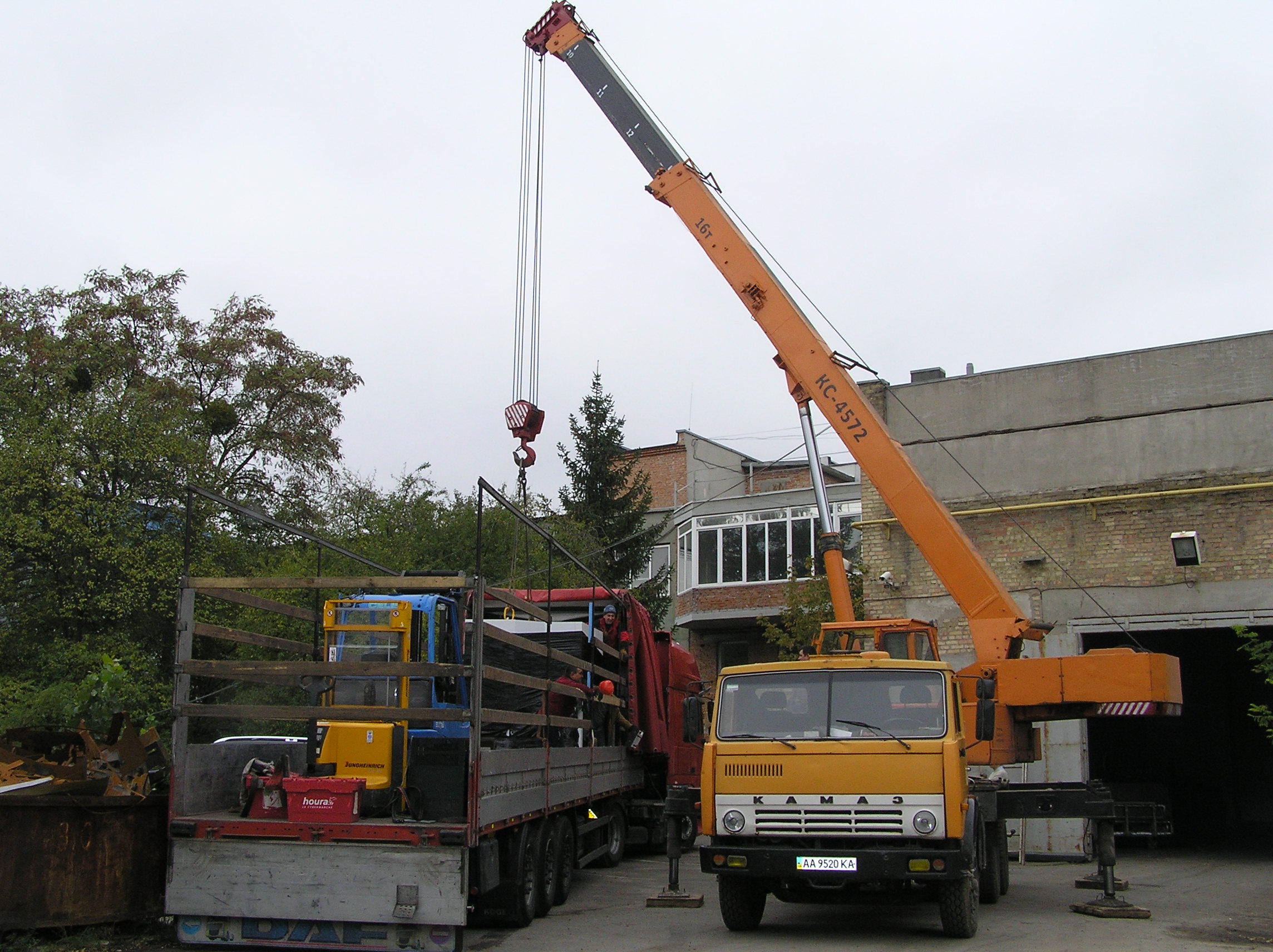 Кран установил пресс на деревянные бруски перед воротами и пресс был подготовлен к дальнейшей транспортировке. На неровности асфальта были уложены стальные листы, на листы встали катки, на катки взгромоздился прочно сам пресс, к прессу пристегнулся погрузчик – и погрузчик дал газу!