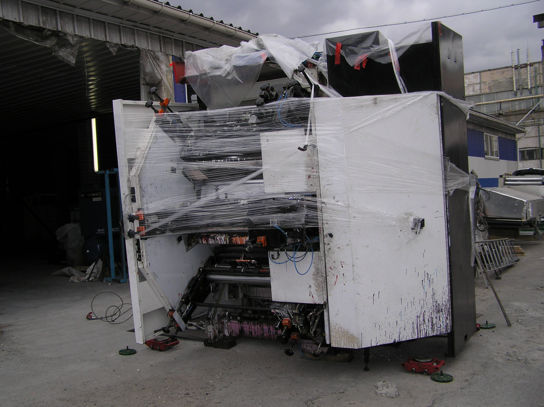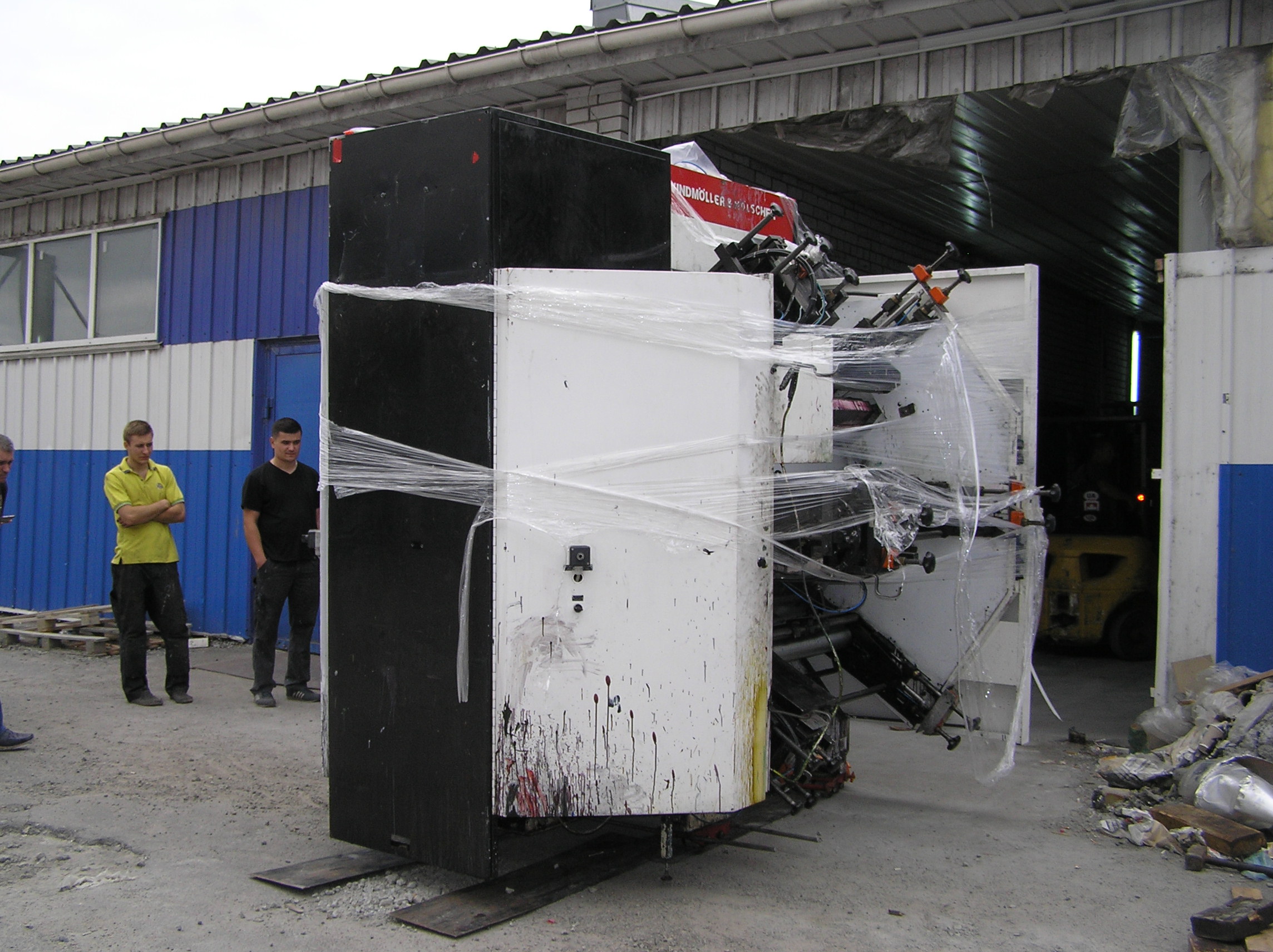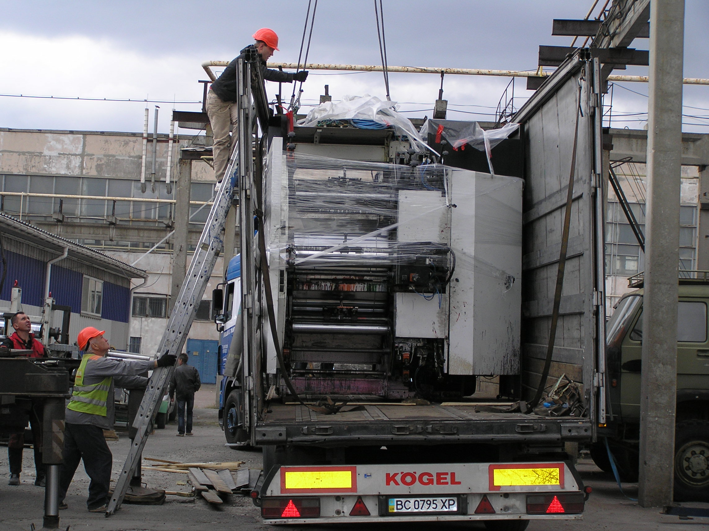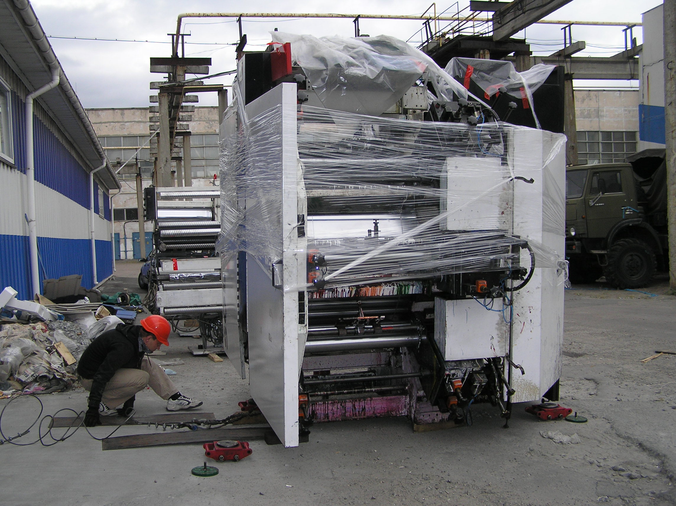 После разгрузки мы приступили к основной задаче. Восьмитонная печатная «машинка» с помощью домкратов была установлена на транспортные тележки и по стальным листам двинулась в цех. После окончательной установки на ПМЖ машина была поставлена на стальные подкладки. Пока мы катили машину, погрузчик успел занести в цех оставшиеся грузы. Вслед за этим были установлены на свое место ворота цеха. Небо хмурилось, время близилось к вечеру – никого не надо было подгонять. Выражаем благодарность заказчику за содействие и правильную организацию работ и искренне сожалеем, что ему пришлось уехать из Киева.