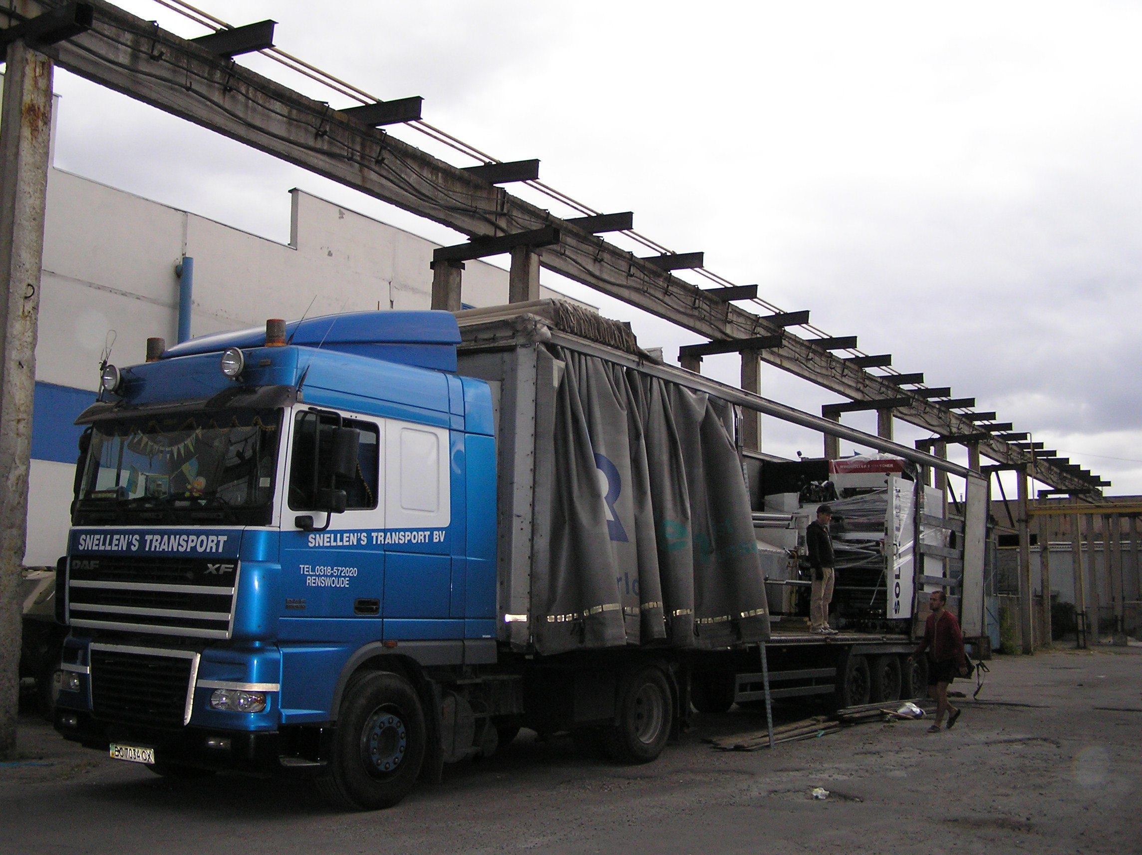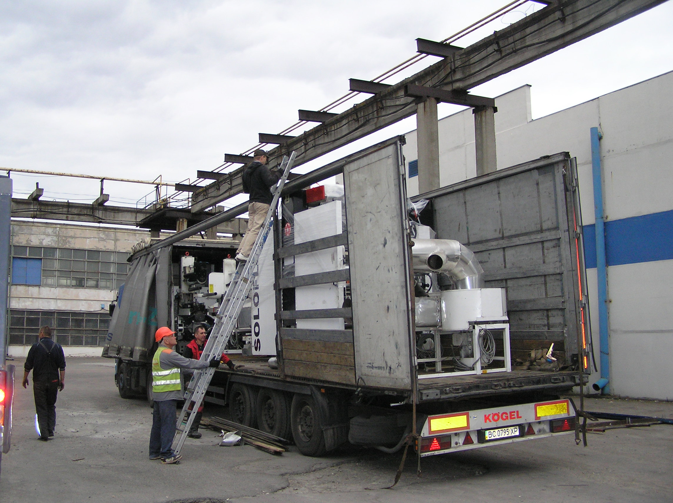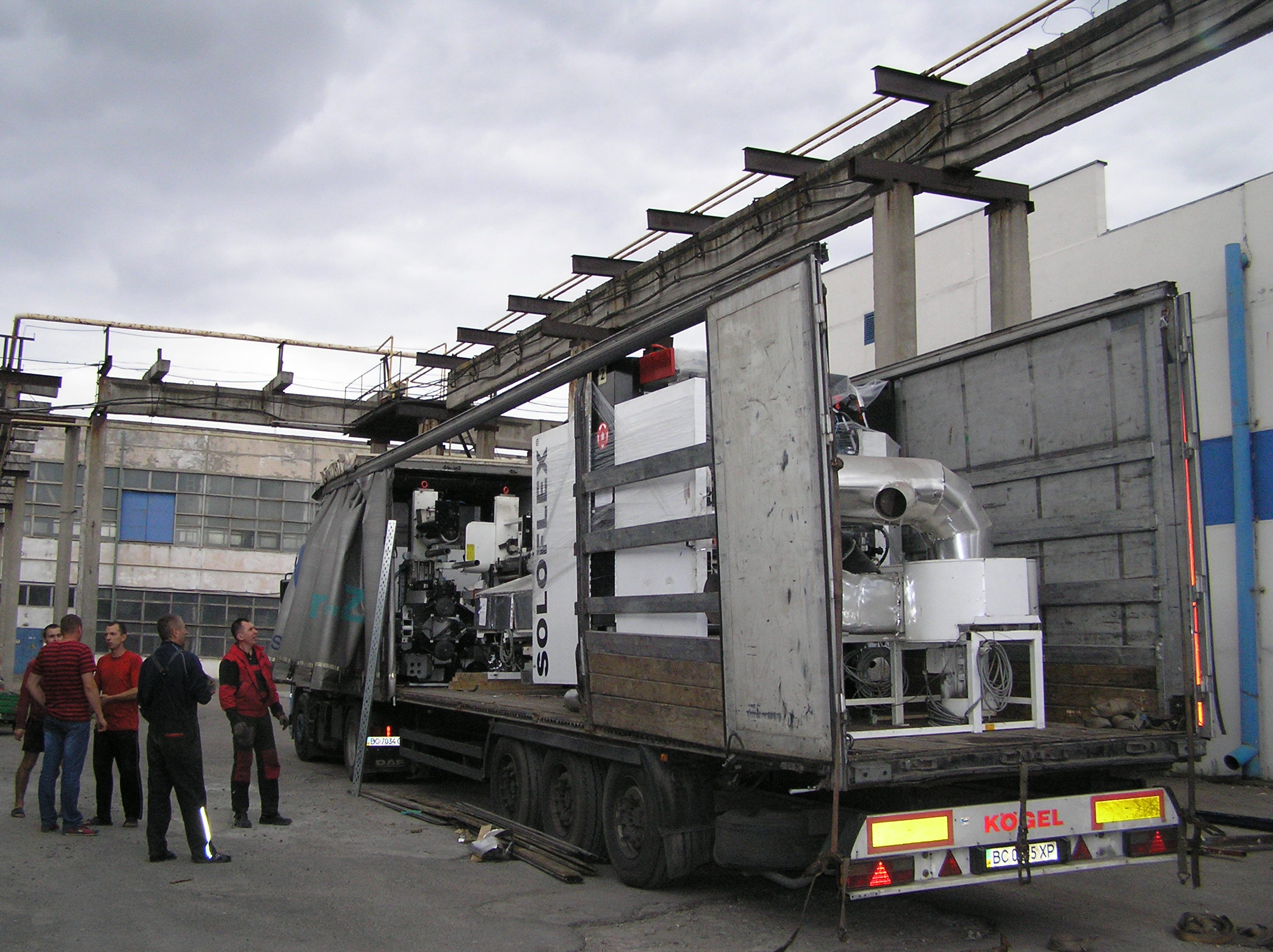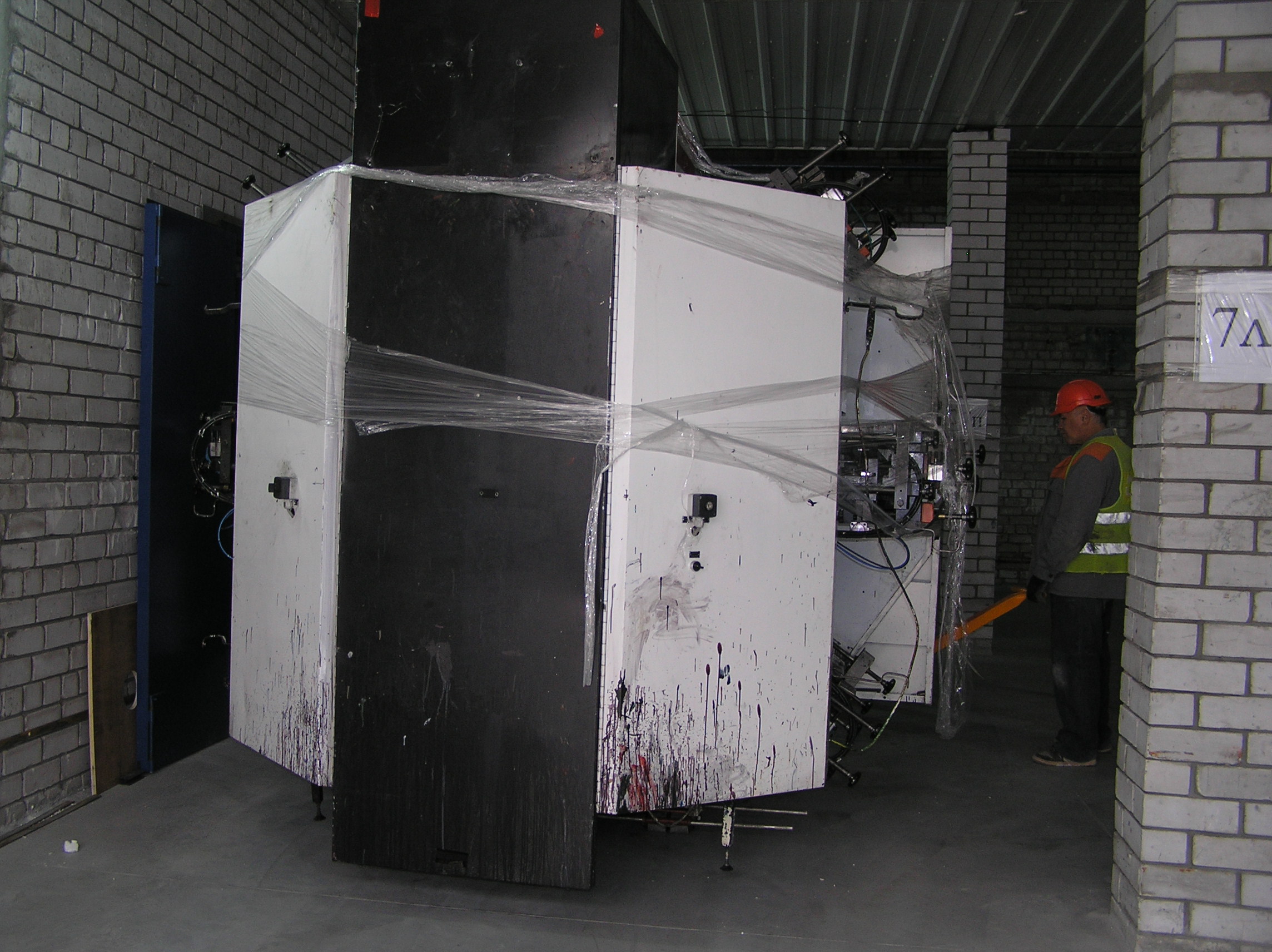 После разгрузки мы приступили к основной задаче. Восьмитонная печатная «машинка» с помощью домкратов была установлена на транспортные тележки и по стальным листам двинулась в цех. После окончательной установки на ПМЖ машина была поставлена на стальные подкладки. Пока мы катили машину, погрузчик успел занести в цех оставшиеся грузы. Вслед за этим были установлены на свое место ворота цеха. Небо хмурилось, время близилось к вечеру – никого не надо было подгонять. Выражаем благодарность заказчику за содействие и правильную организацию работ и искренне сожалеем, что ему пришлось уехать из Киева.