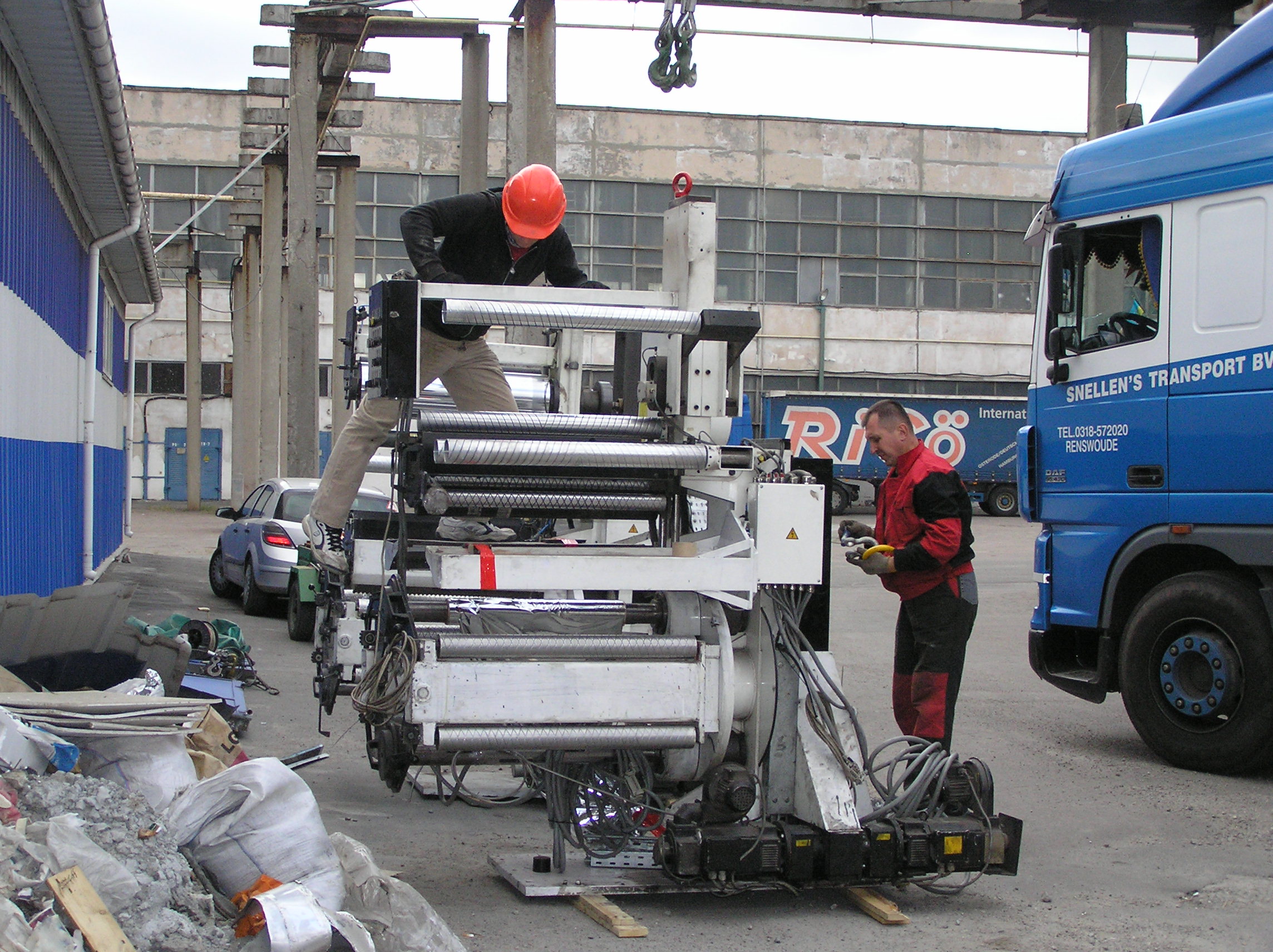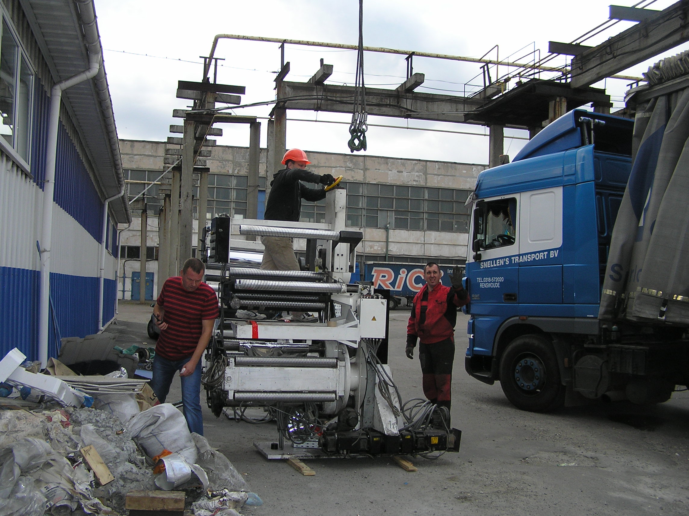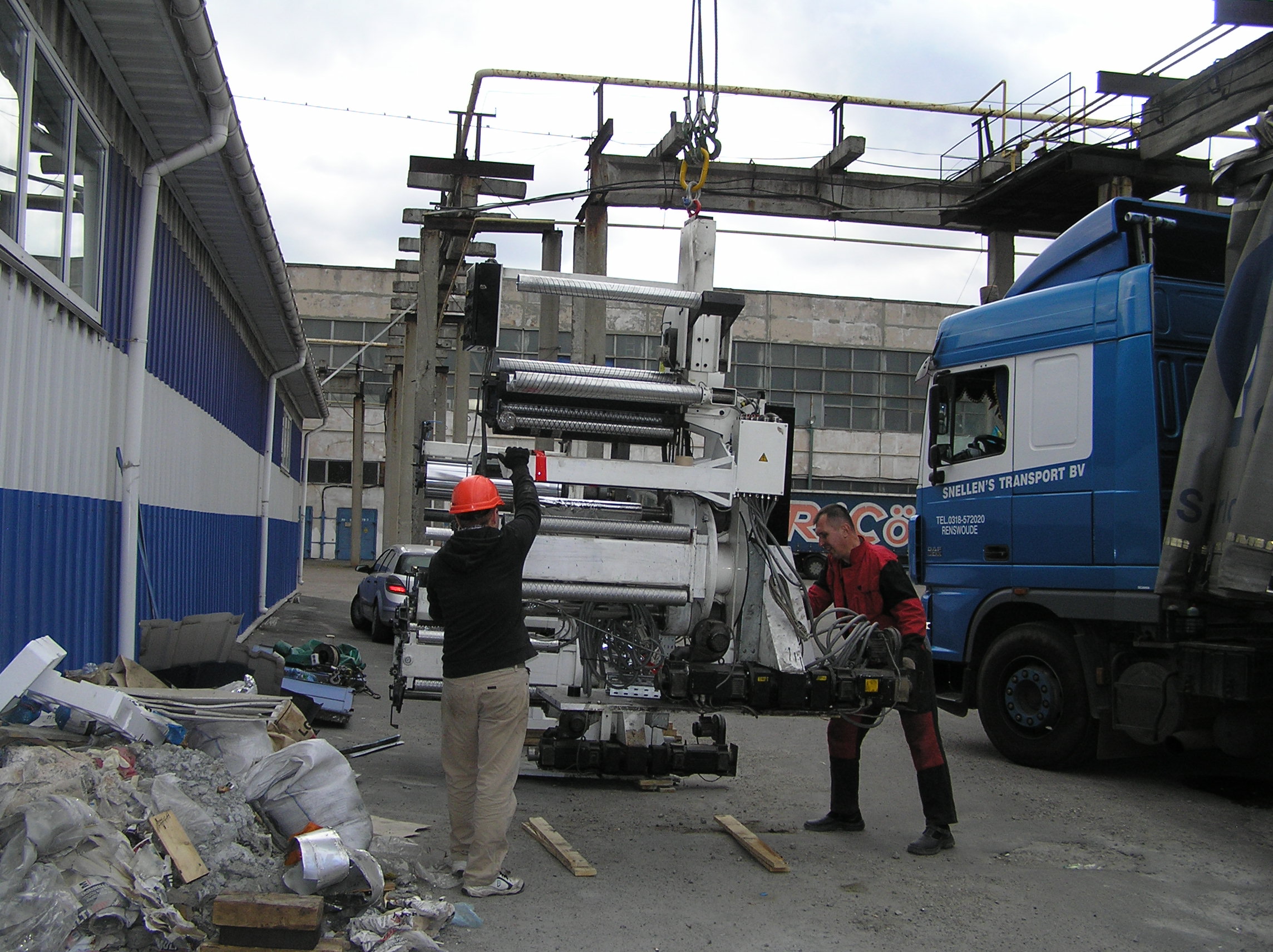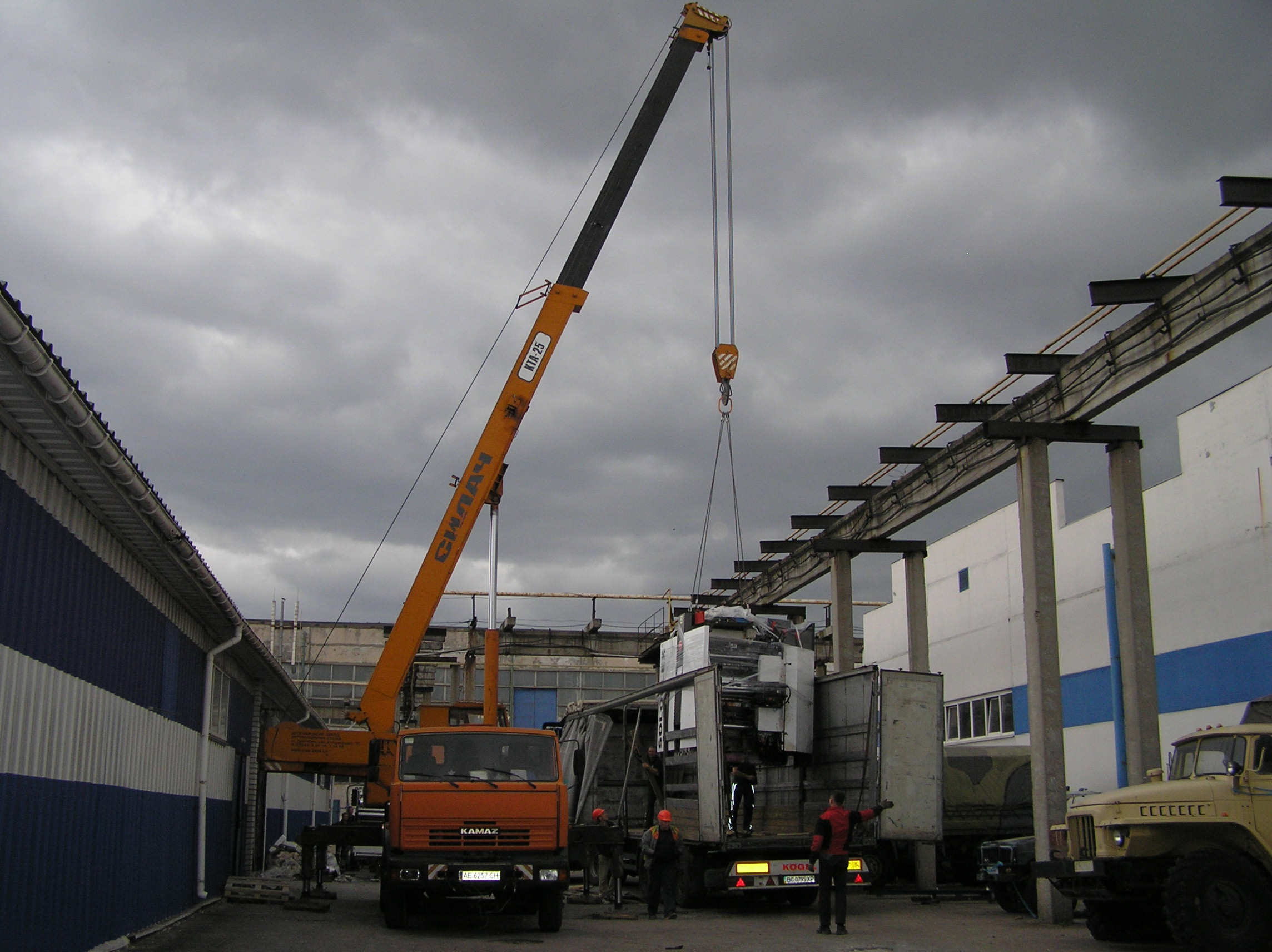 И снова мы по достоинству оценили кран грузоподъемностью 25 тонн. Крановщик поставил машину там, где ему было удобно , раскинул лапы и с улыбкой приступил к процессу. Ему ничего не мешало, он всюду доставал. Ставшую нам родной печатную машину кран поставил прямо перед воротами, остальные агрегаты ставил на свободные места, дальше и дальше выдвигая стрелу. Такелажные скобы и звенья были заранее накручены сразу на все грузы, что позволило сократить время разгрузки. Словно повторяя киевскую схему, кран брал груз пауком и снимал, брал и снимал. Крановщик видел, что мы вооружены до зубов грузоподъемным элементом и это позволило ему разгрузить фуру быстро и качественно.