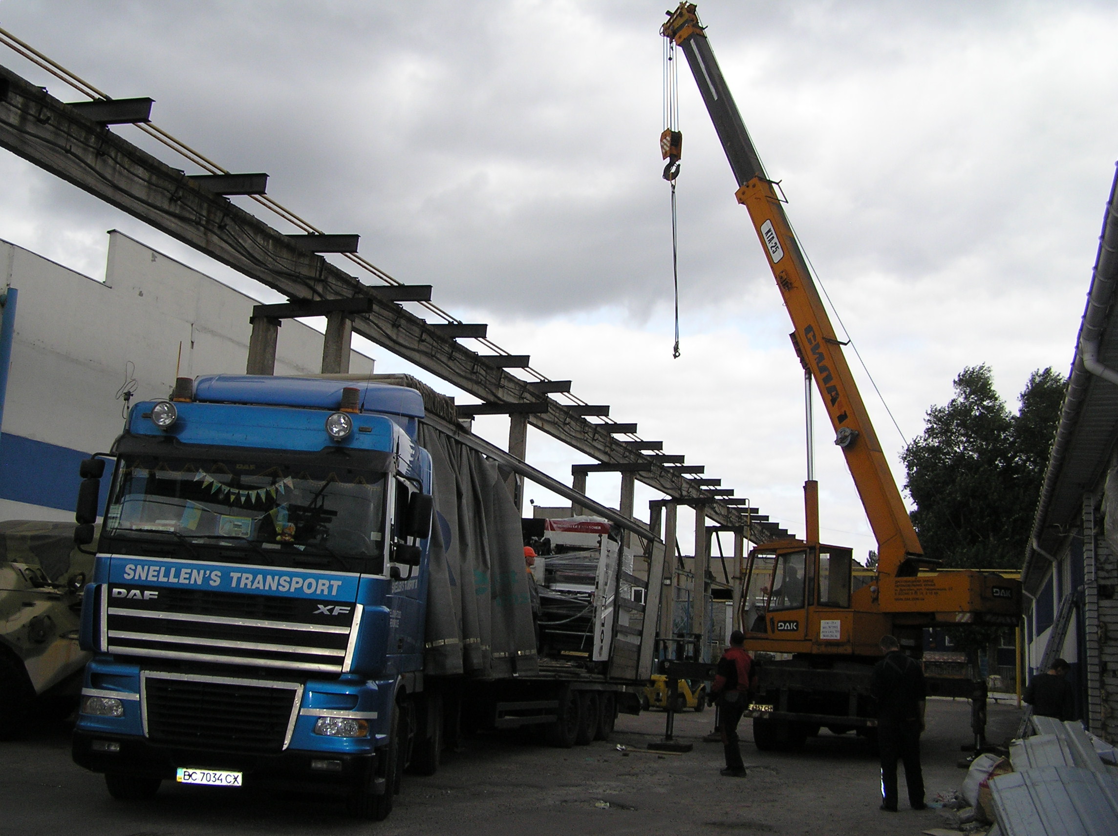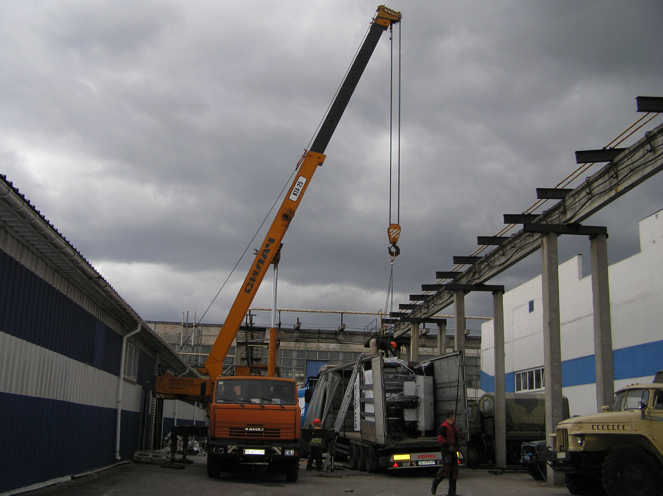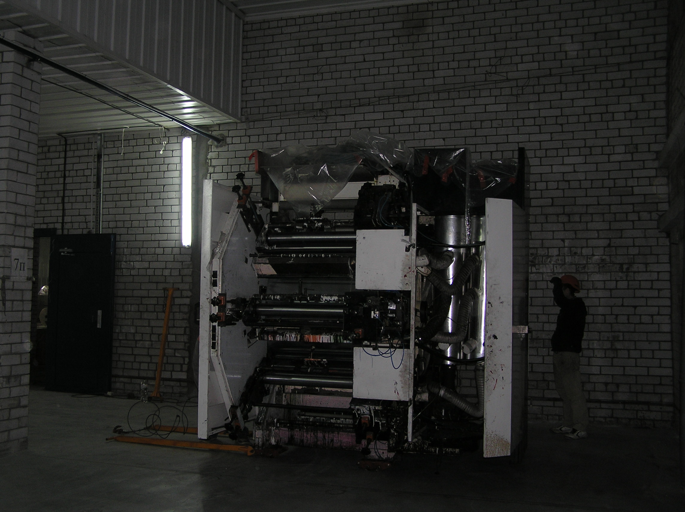 И снова мы по достоинству оценили кран грузоподъемностью 25 тонн. Крановщик поставил машину там, где ему было удобно , раскинул лапы и с улыбкой приступил к процессу. Ему ничего не мешало, он всюду доставал. Ставшую нам родной печатную машину кран поставил прямо перед воротами, остальные агрегаты ставил на свободные места, дальше и дальше выдвигая стрелу. Такелажные скобы и звенья были заранее накручены сразу на все грузы, что позволило сократить время разгрузки. Словно повторяя киевскую схему, кран брал груз пауком и снимал, брал и снимал. Крановщик видел, что мы вооружены до зубов грузоподъемным элементом и это позволило ему разгрузить фуру быстро и качественно.