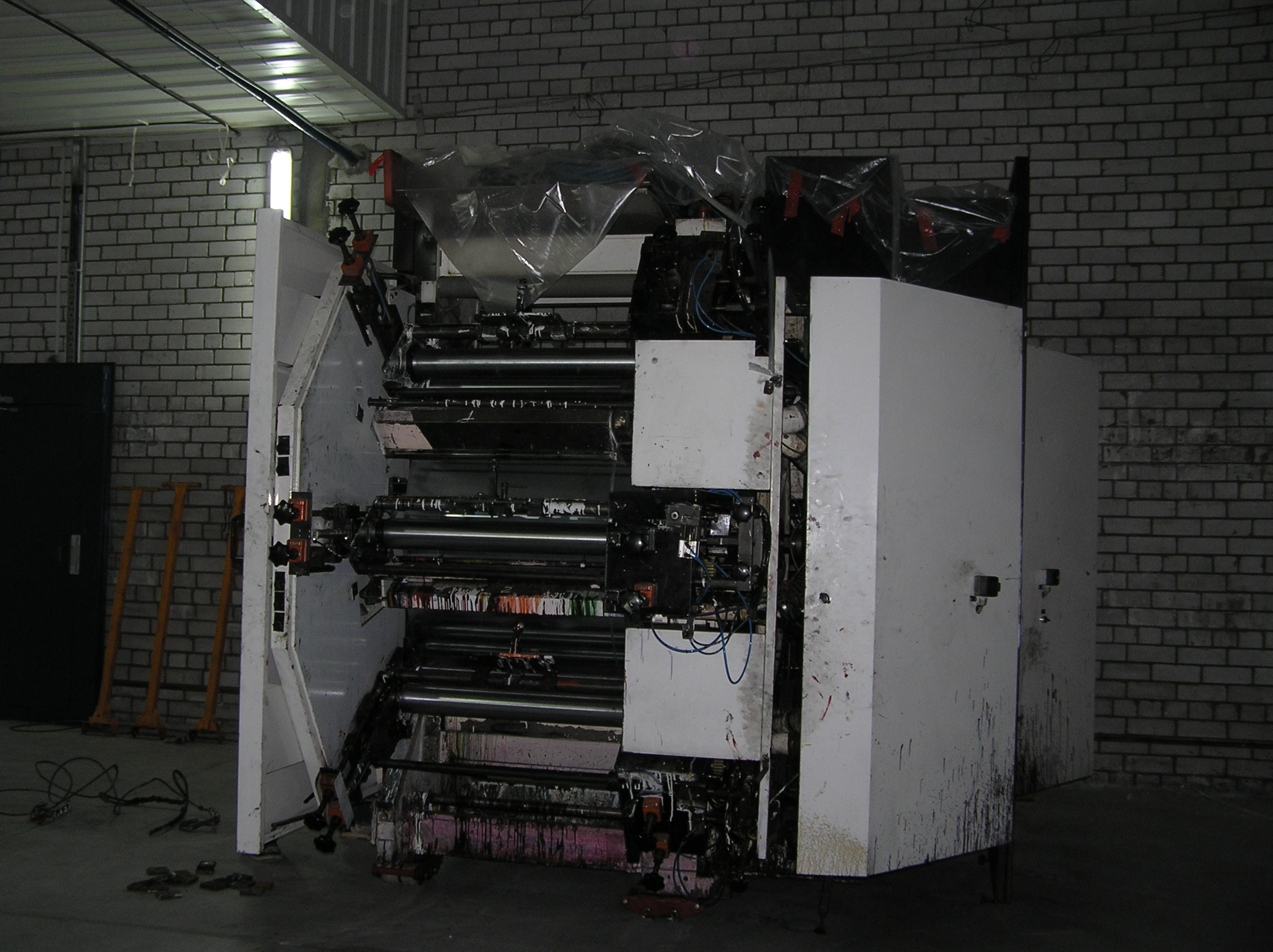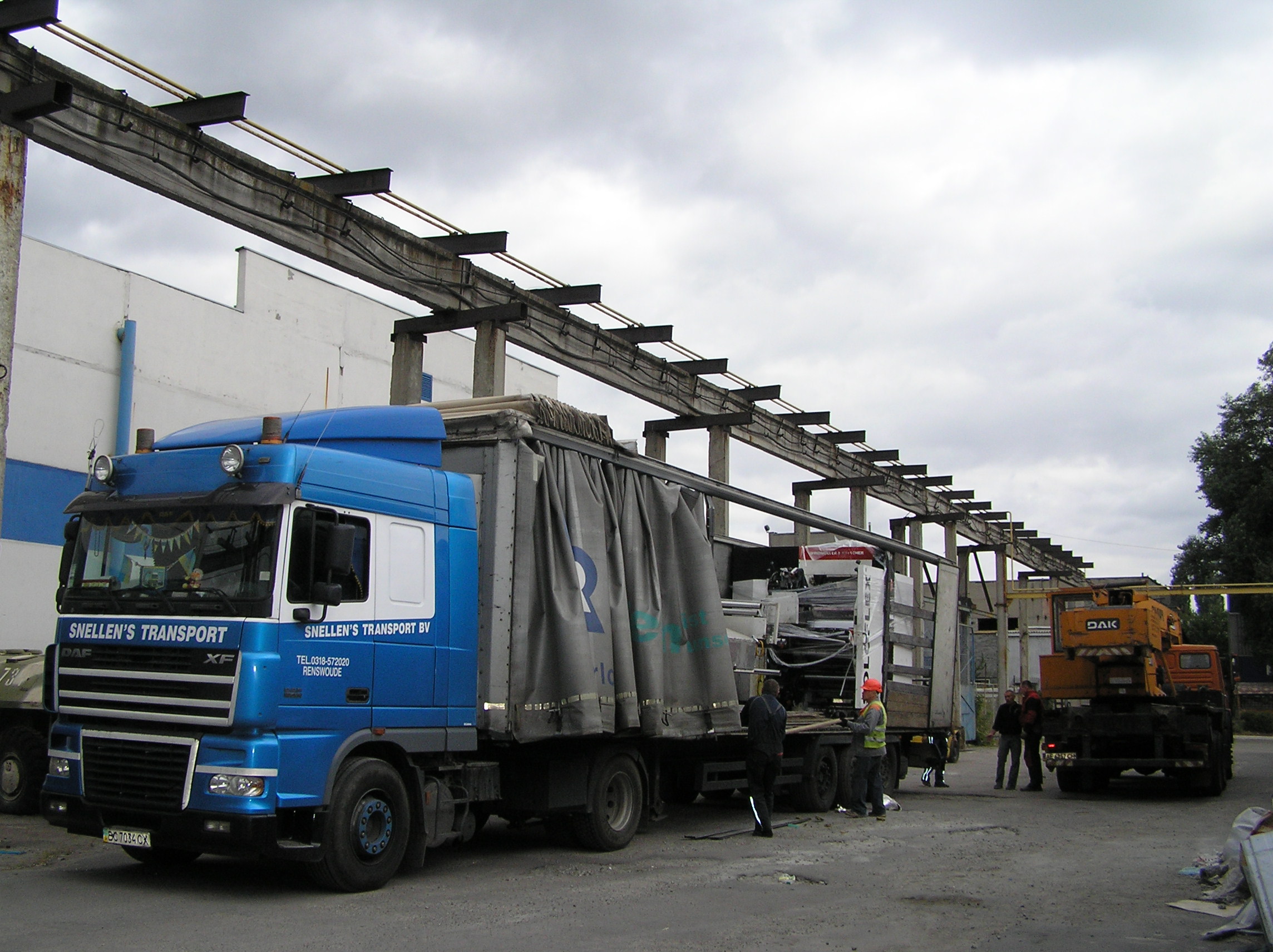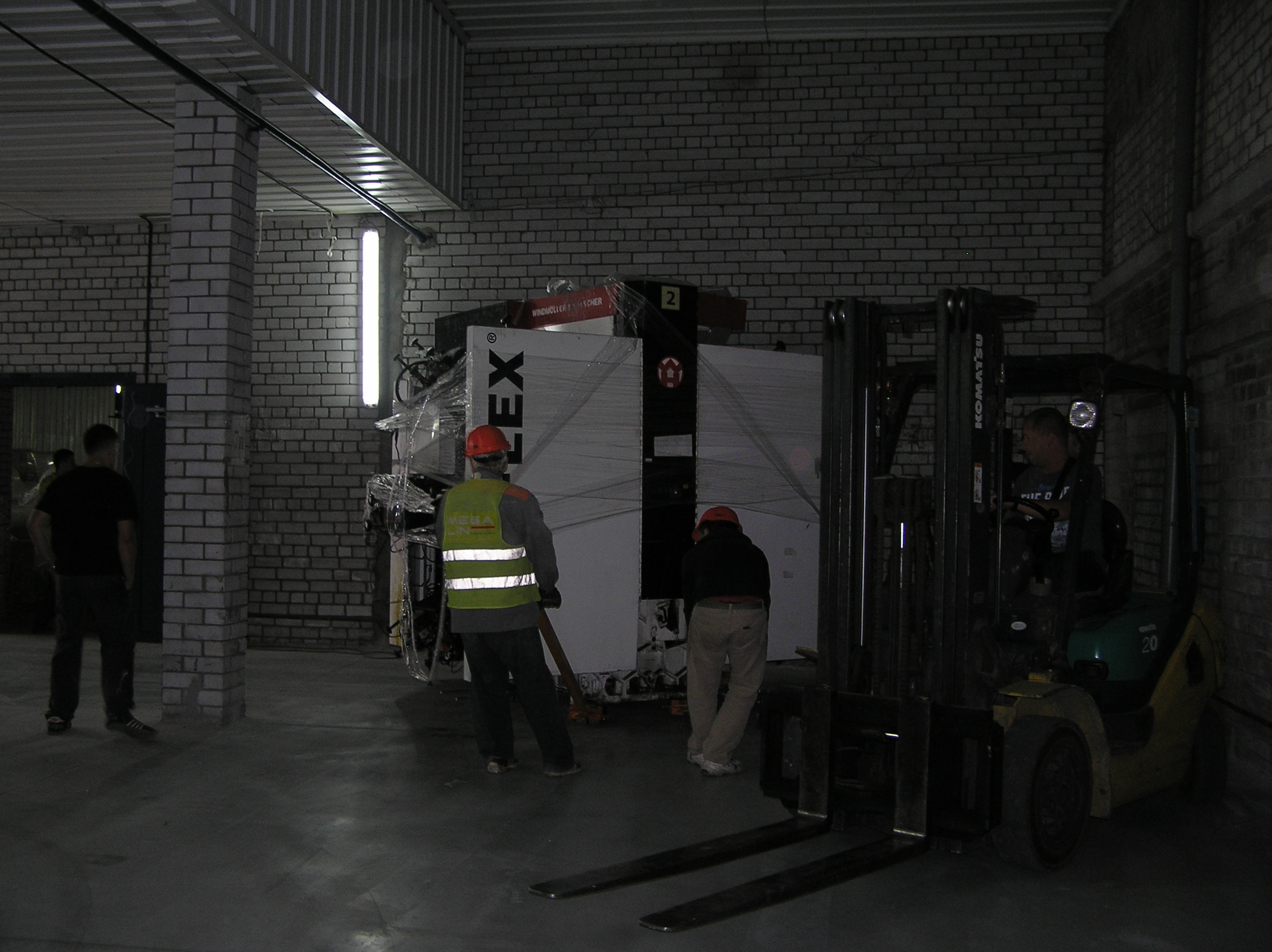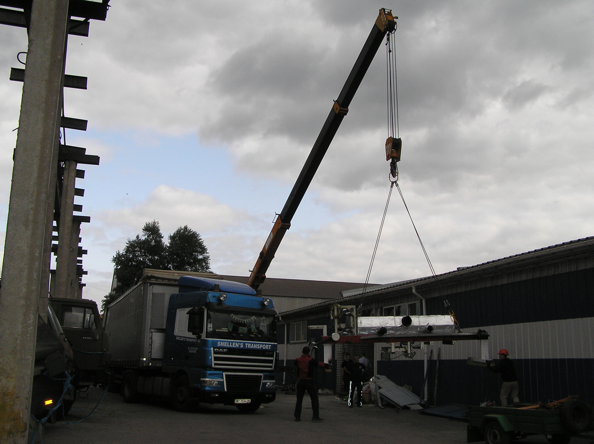 И снова мы по достоинству оценили кран грузоподъемностью 25 тонн. Крановщик поставил машину там, где ему было удобно , раскинул лапы и с улыбкой приступил к процессу. Ему ничего не мешало, он всюду доставал. Ставшую нам родной печатную машину кран поставил прямо перед воротами, остальные агрегаты ставил на свободные места, дальше и дальше выдвигая стрелу. Такелажные скобы и звенья были заранее накручены сразу на все грузы, что позволило сократить время разгрузки. Словно повторяя киевскую схему, кран брал груз пауком и снимал, брал и снимал. Крановщик видел, что мы вооружены до зубов грузоподъемным элементом и это позволило ему разгрузить фуру быстро и качественно.