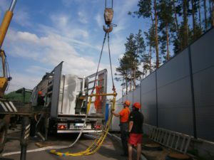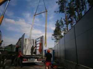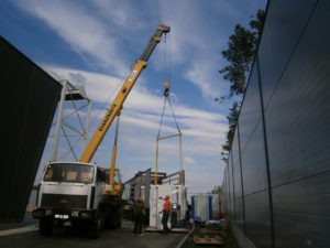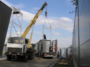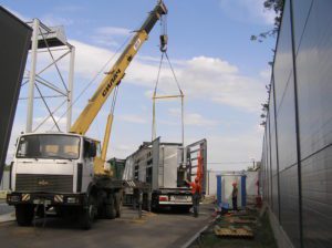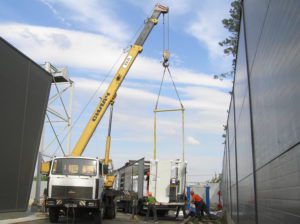 Схема строповки была предоставлена заказчиком заранее. Вес станка составлял 9 тонн. Специально под эту работу была разработана и изготовлена линейная траверса с креплением за края необходимой грузоподъемности. Согласно схеме строповки, груз должен крепиться за три монтажных уха. Были подготовлены мягкие текстильные стропы необходимых – разных, на минуточку!- длин и грузоподъемностей, такелажные скобы всех видов и размеров. Кран грузоподъемностью 25 тонн приподнял застропованный груз над платформой, выдержал некоторое время, затем бережно перенес и поставил на землю. На земле станок был отсоединен от транспортной рамы и следующей операцией был установлен краном перед въездом в цех  на деревянные бруски.