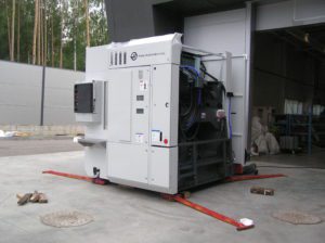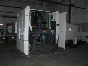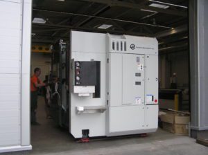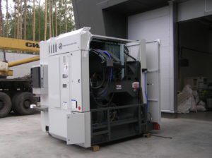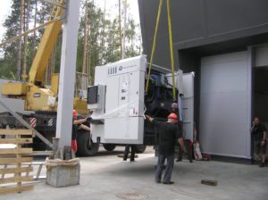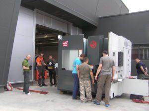 Разгрузка металлообрабатывающего центра с использованием траверсы.