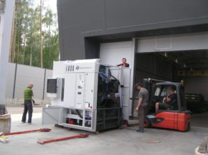 Установив обрабатывающий центр на транспортные катки, мы пристегнули станок к погрузчику и медленно тронулись.