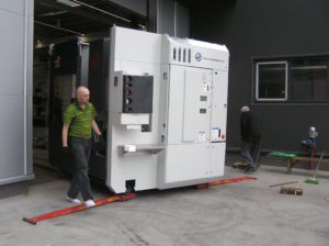 На разгрузку приехал станок. Приехал на фуре, новый, с таможни, запечатанный. Станок с ЧПУ, неудобный как для строповки, так и для перемещения при проведении такелажных работ. Для строповки неудобен тем, что крепежные элементы расположены в глубине агрегата и на разной высоте, и обязательно для разгрузки требует траверсу. Станок для перемещения неудобен тем, что несущая рама расположена в глубине и со всех сторон обвешана различными шкафами, под которые с домкратами не доберешься. Но таких станков становится все больше и к перечисленным неудобствам мы подготовились.