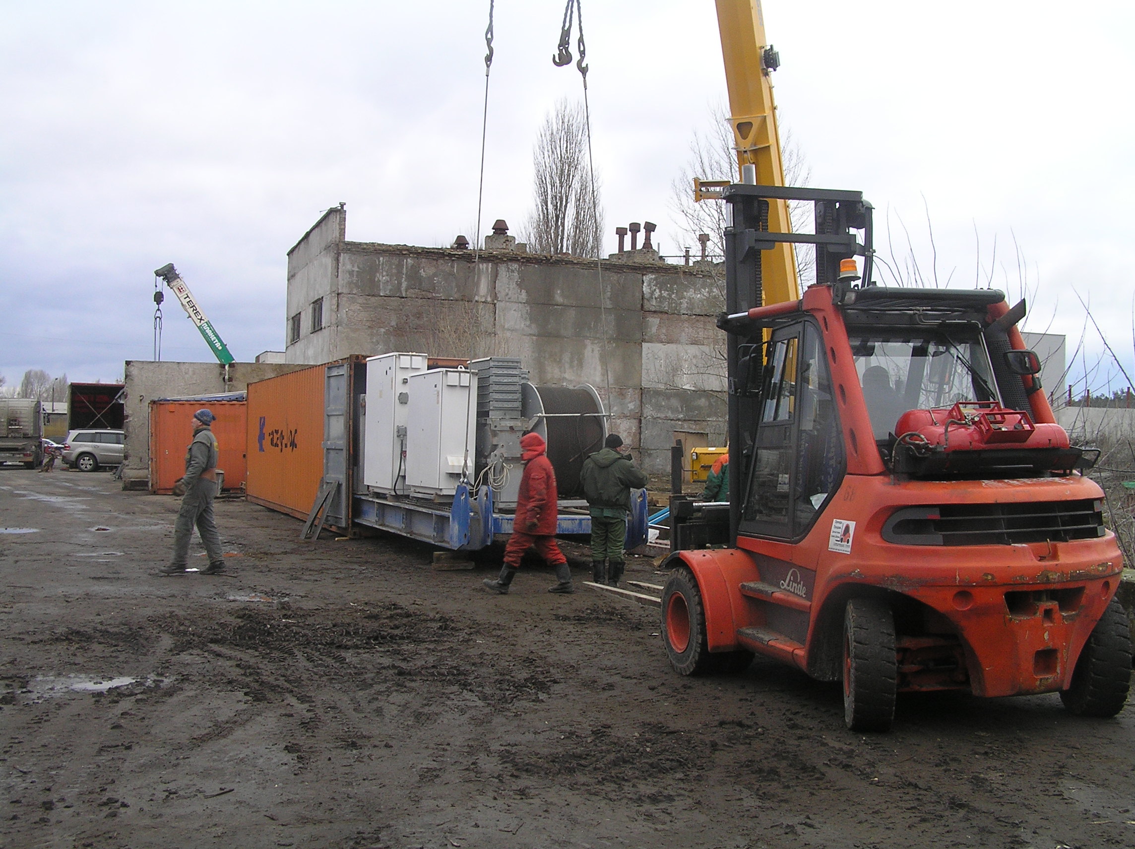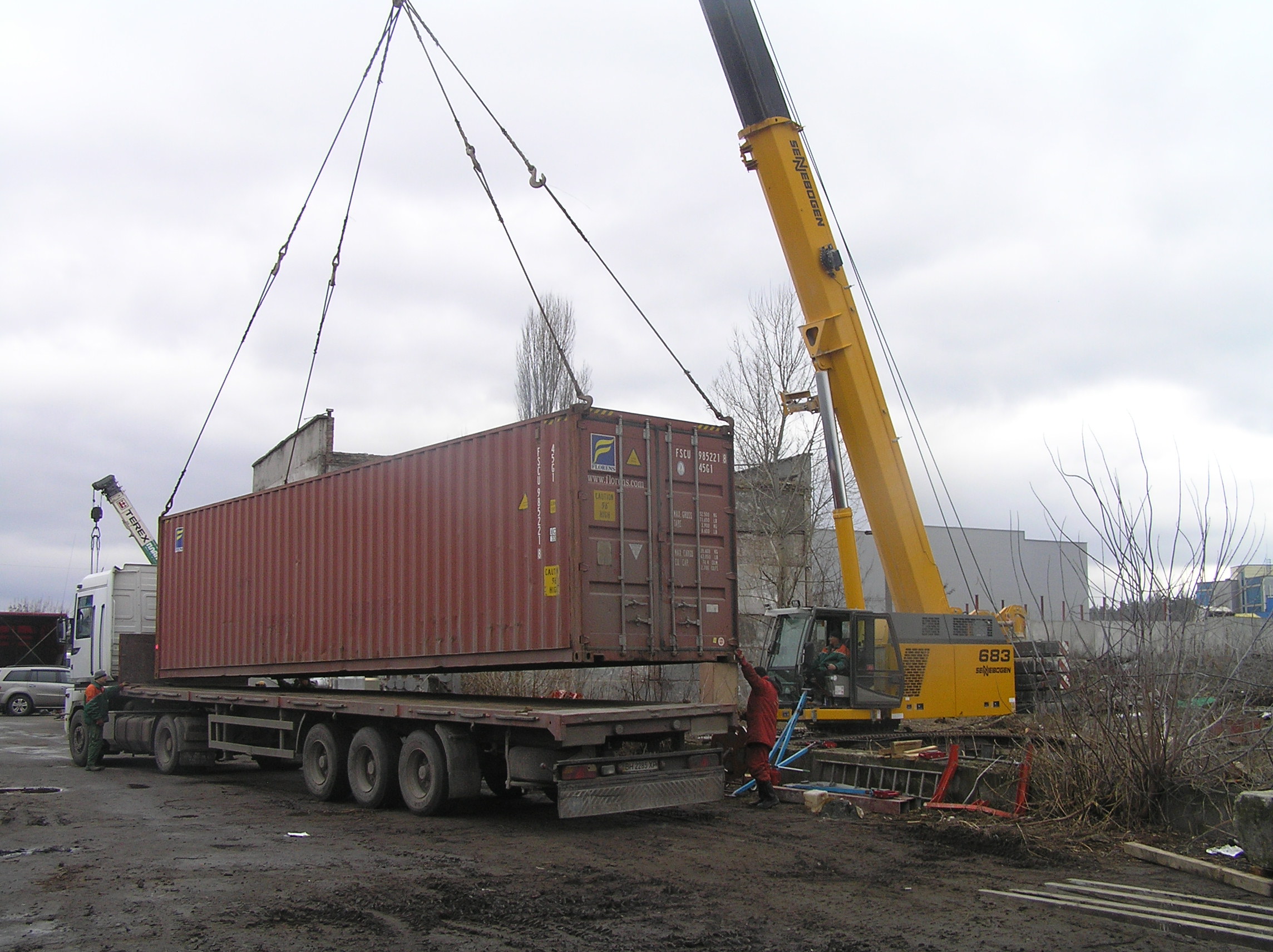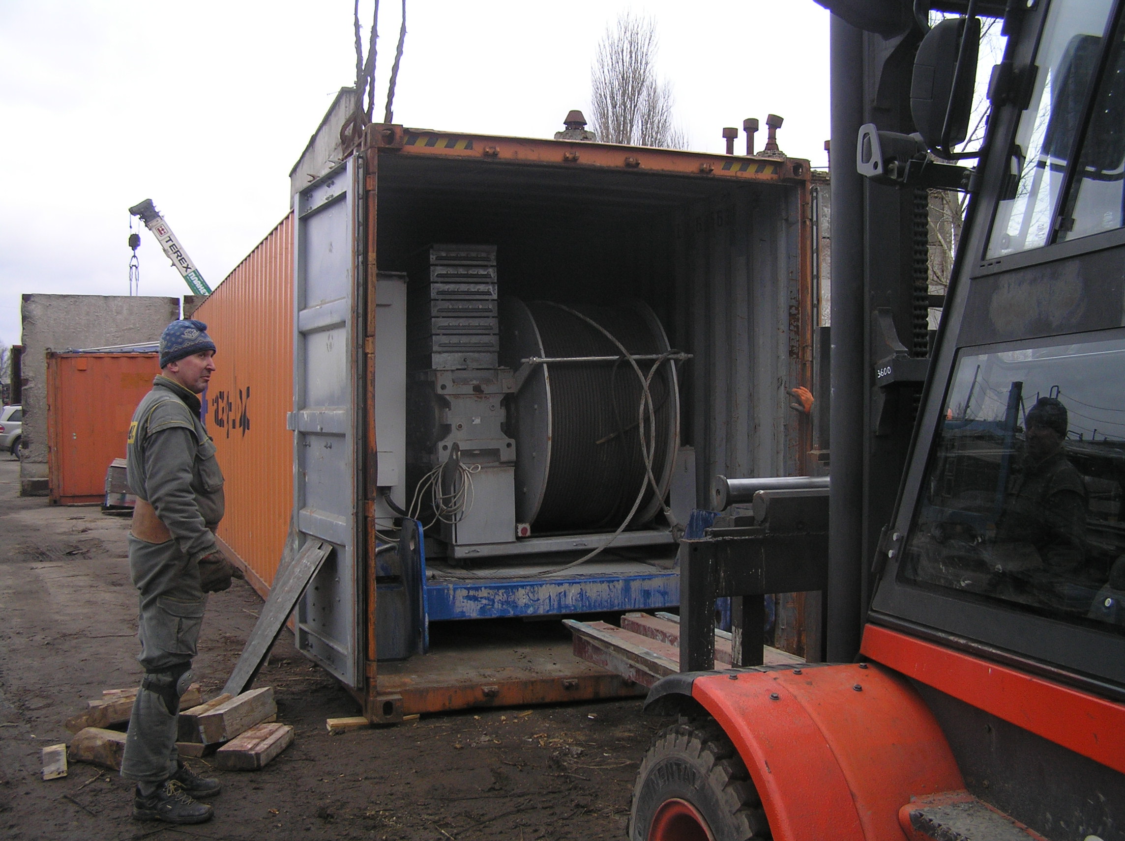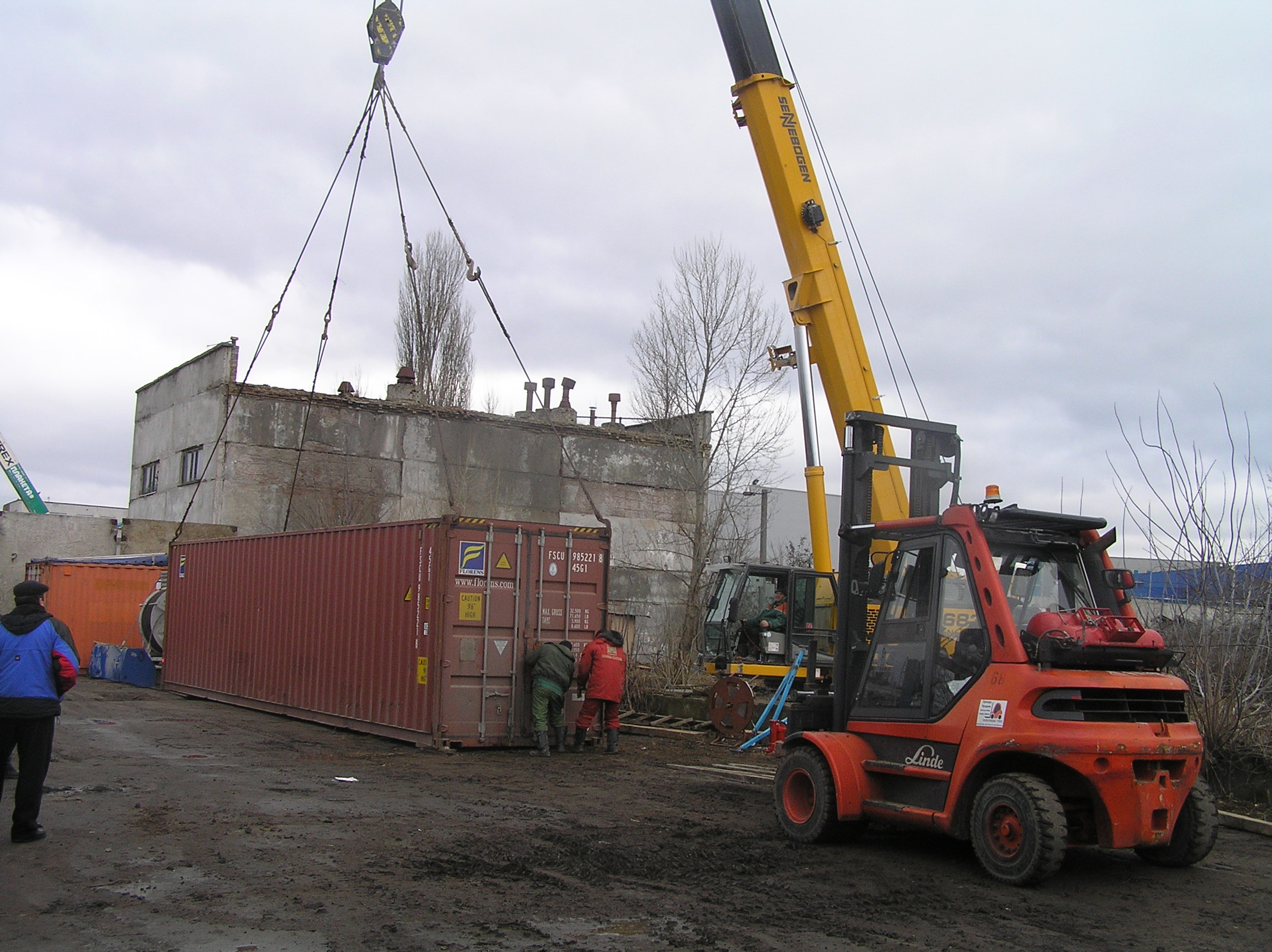 Обе конструкции предстояло запихать в контейнер для последующей отправки в порт. Зазор между грузом и стенками контейнеров составлял около 2-х см., что при длине груза 6 м. и большой массе сильно осложняло задачу. Но слаженная работа обоих коллективов и помощь могучего самоходного крана и погрузчика позволила выполнить такелажные работы в достаточно сжатые сроки.