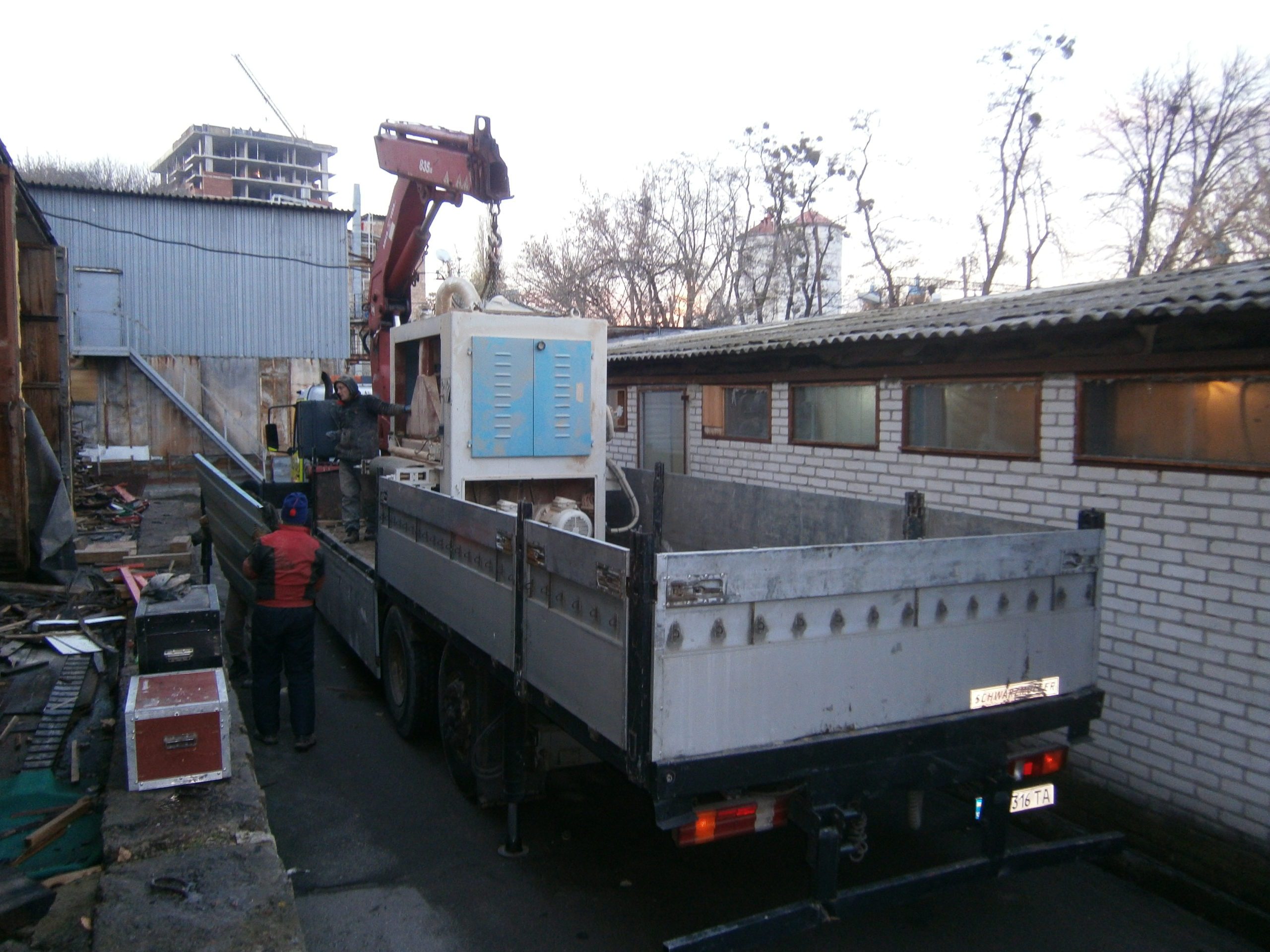 Манипулятор доставил груз на новую площадку и поставил на деревянные бруски. Поставил, кстати, не как нибудь, а чтобы нам дальше катить удобно было. За такую работу от нас водителю, и всему Авто SOS большое человеческое спасибо. Опять же, не на правах рекламы.