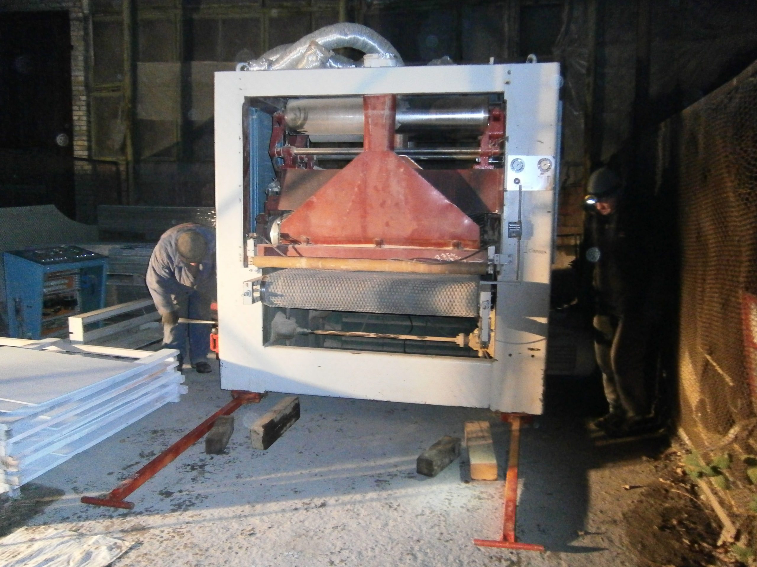 Оставшиеся метры внутрь цеха станок должен был затолкать погрузчик. Он даже стоял рядом, было даже кому за руль сесть. Но что-то не срослось. Было решено не ждать и поднапрячься еще разок. И пусть работу закончили в полной темноте. И пусть ноет уставшая спина. Зато переполняет радость от еще одной решенной трудной задачи. Сделали этот станок, сделали прошлый – сделаем и следующий!