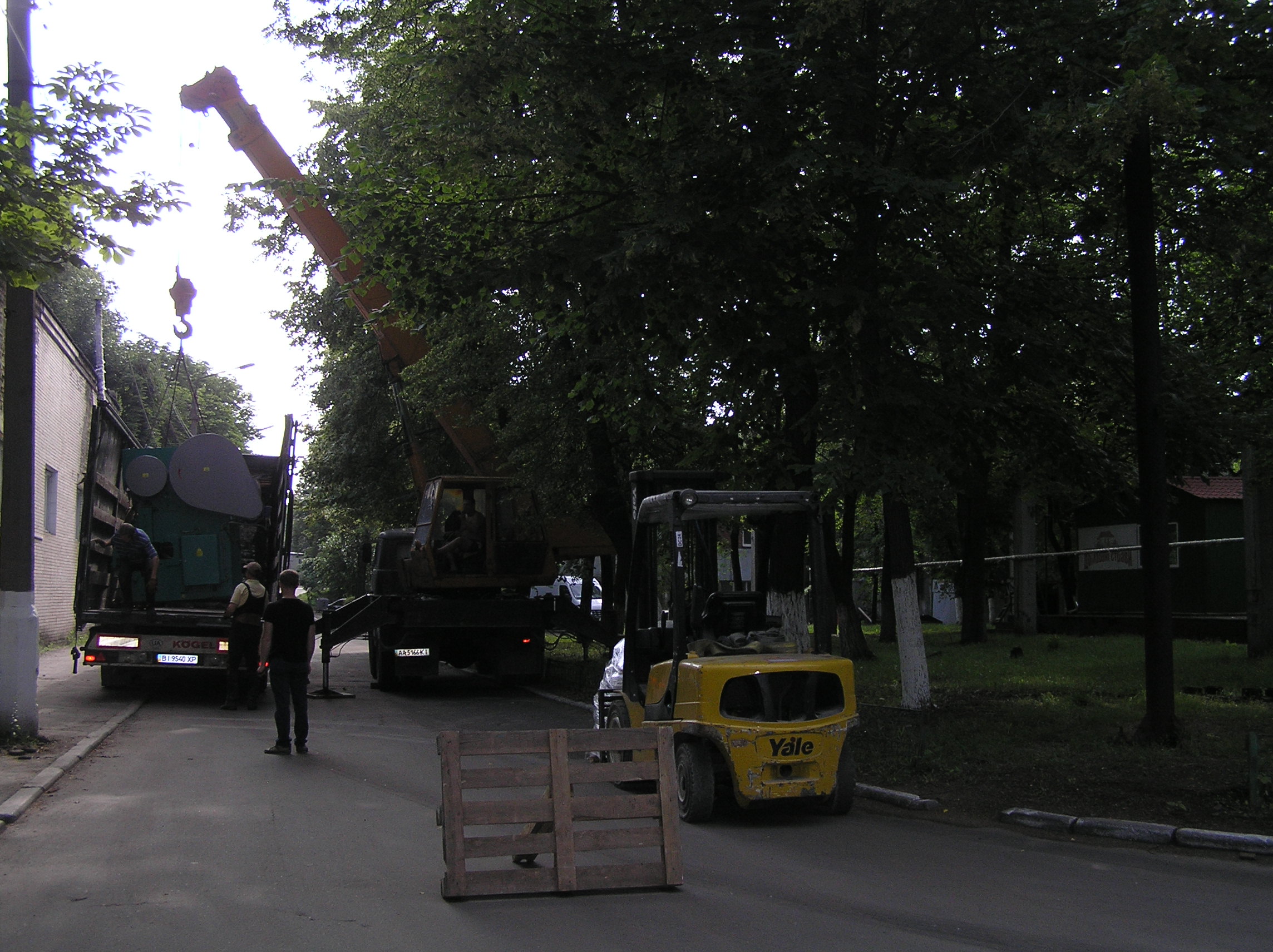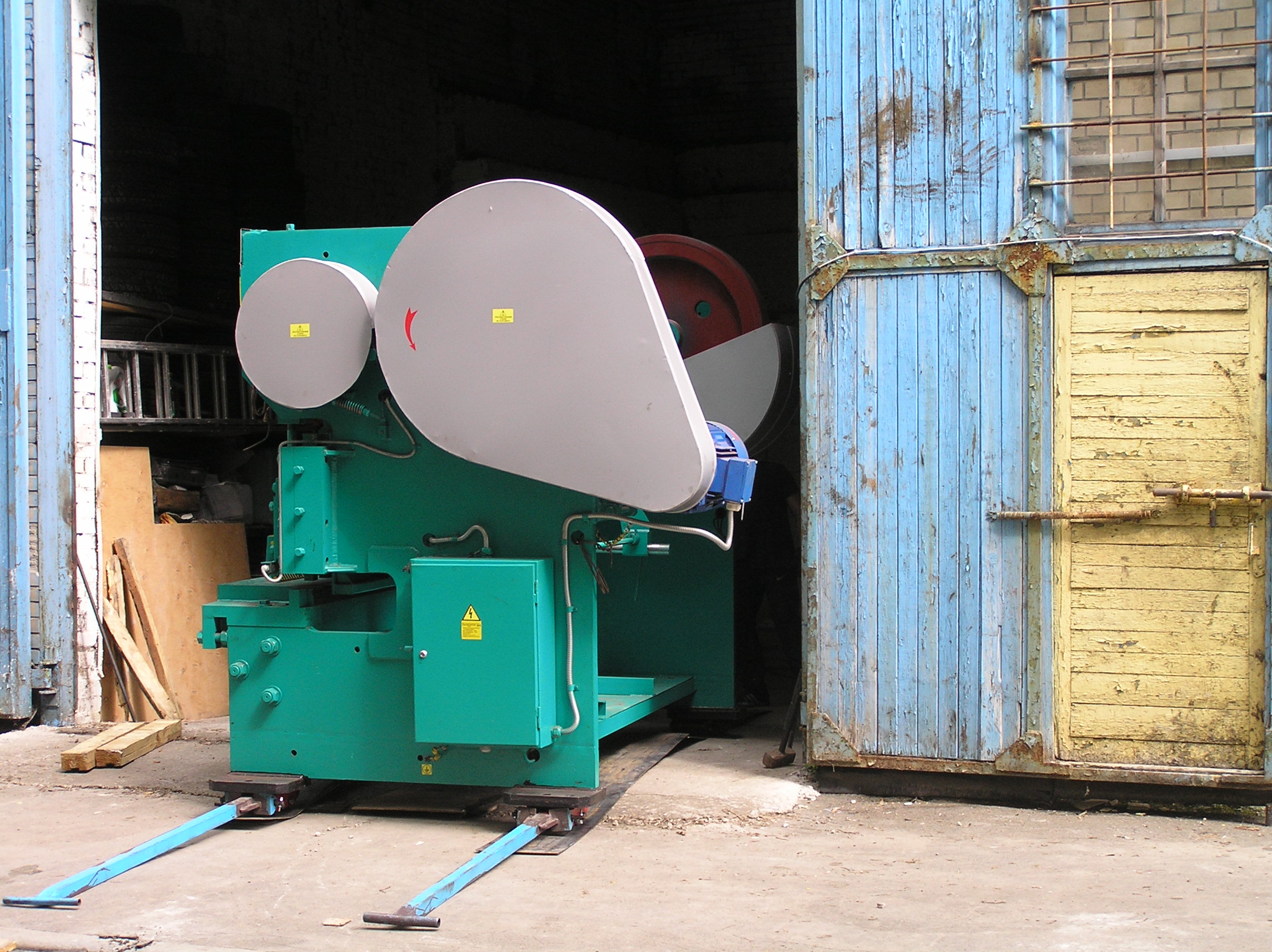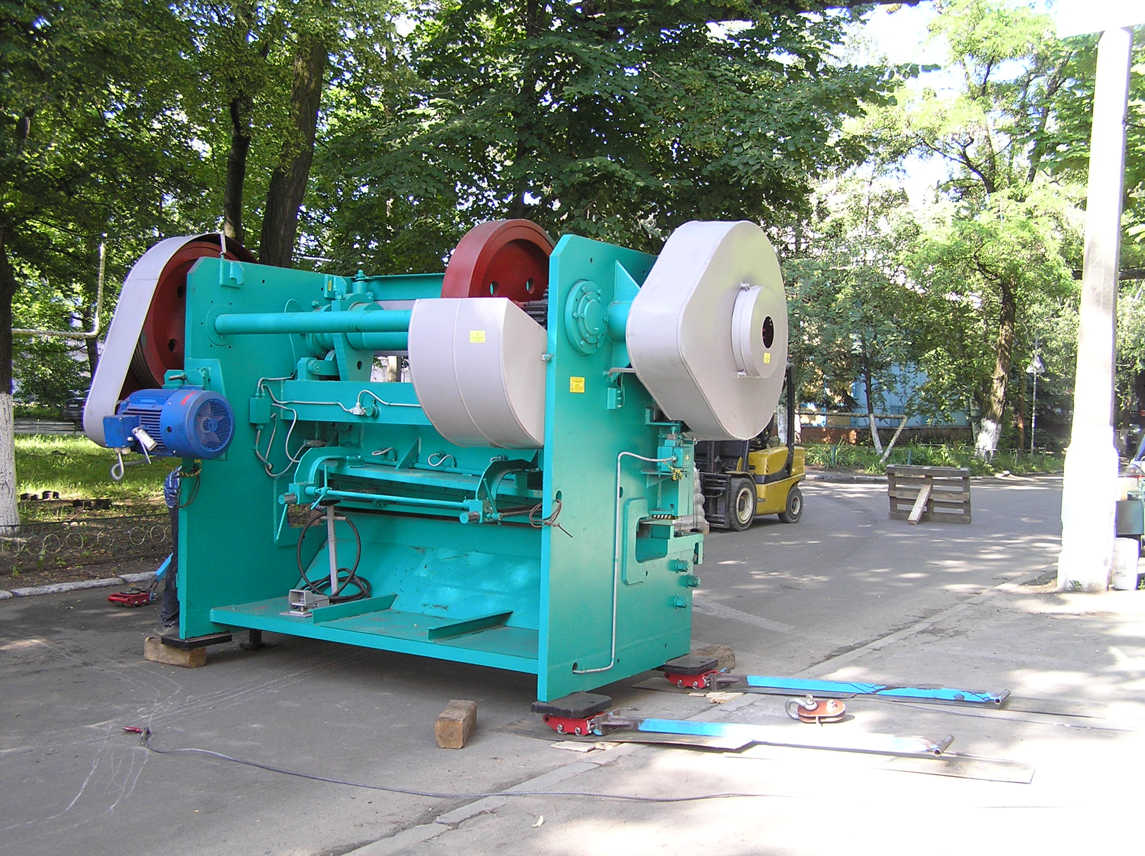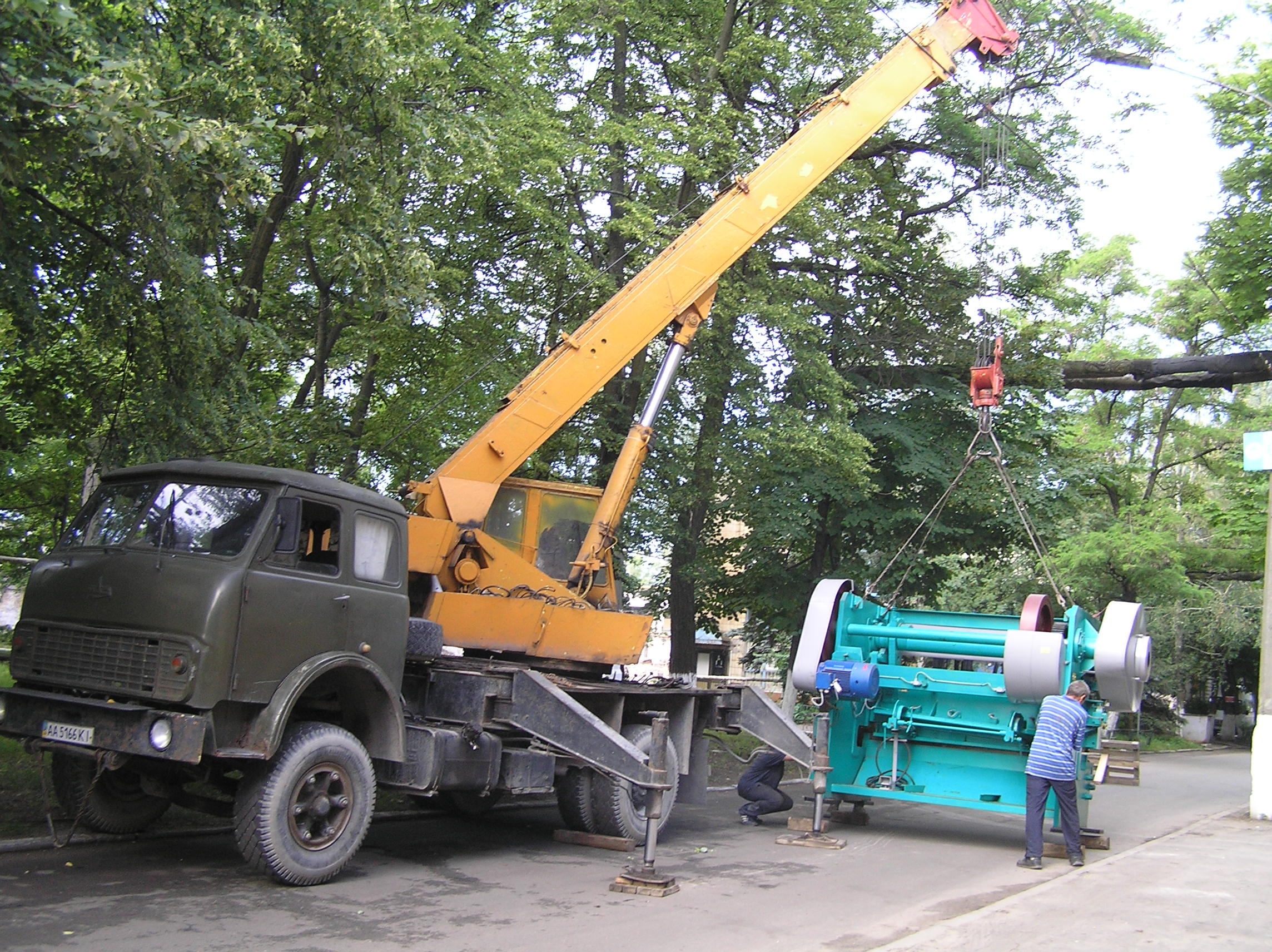 Низкий потолок цеха не позволял произвести разгрузку внутри и было принято решение разгрузить гильотину автокраном с фуры и далее перемещать станок на катках с использованием такелажных приспособлений.