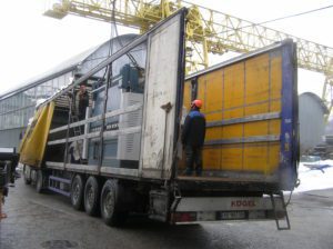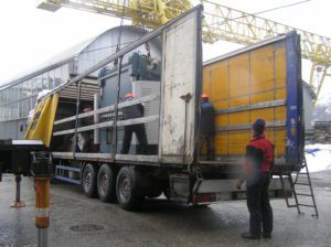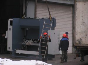 К этому времени подтянулись фура с краном и мы приступили к погрузке станков. Вальцовочный станок, как более легкий, был застропован под пузо мягкими стропами и встал в кузов сразу за кабиной.