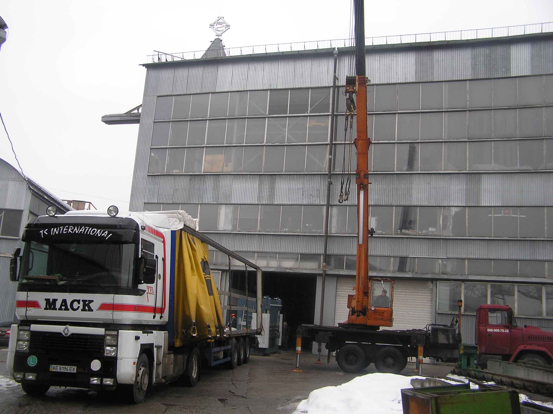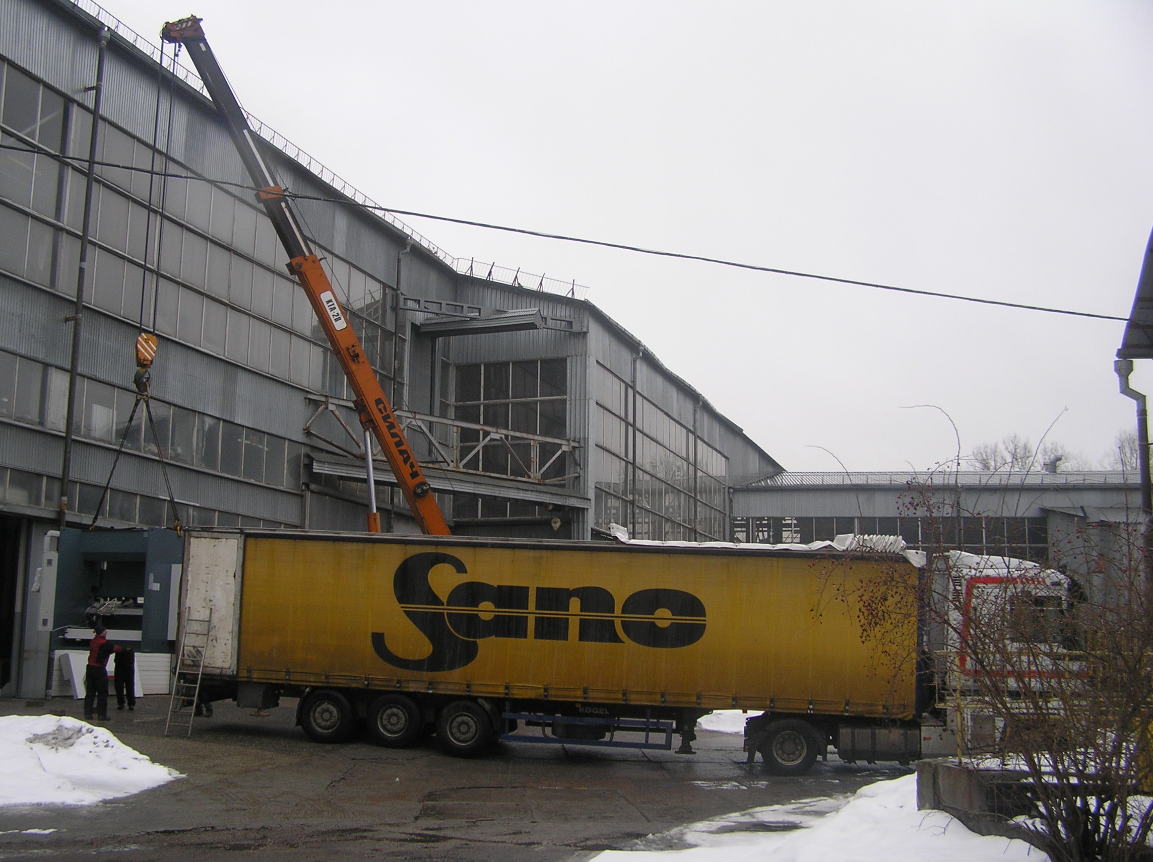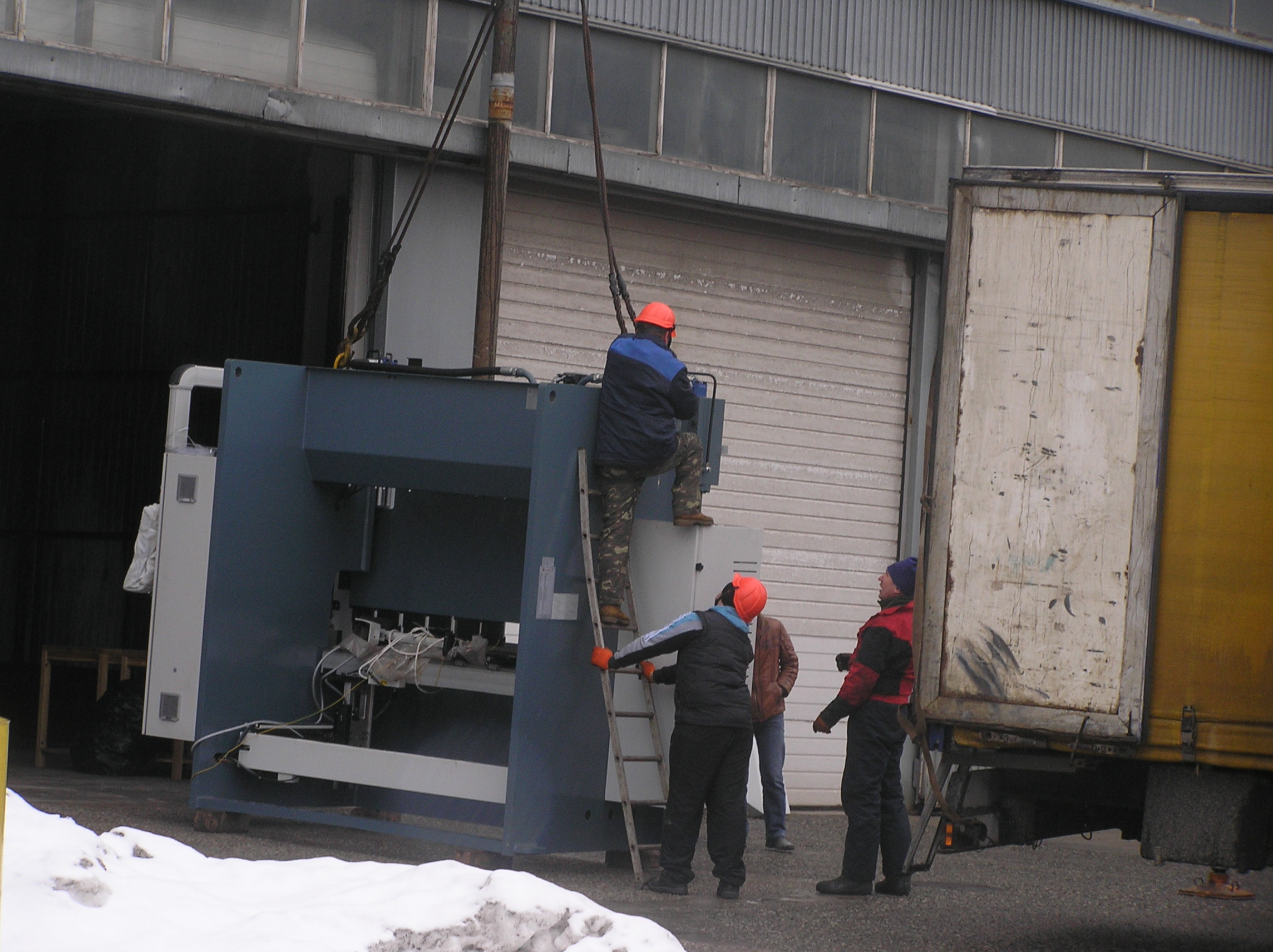 К этому времени подтянулись фура с краном и мы приступили к погрузке станков. Вальцовочный станок, как более легкий, был застропован под пузо мягкими стропами и встал в кузов сразу за кабиной.
