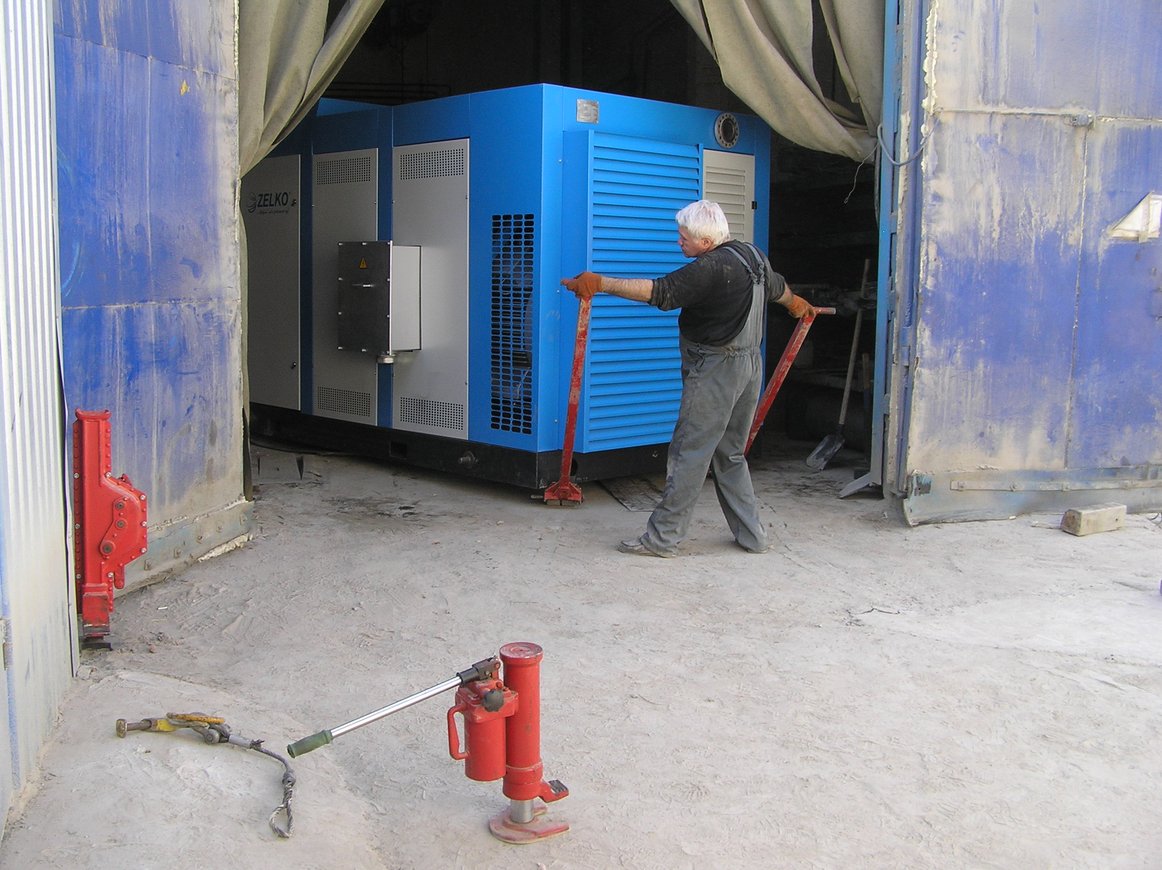 Все, как обычно. С брусков домкратами переносим компрессор на тележки, берем на поводок – поехали. Сегодня такелажные работы нам помогает проводить погрузчик, с его помощью удается проехать около двадцати метров неровного бетона. Заехав в тупик, погрузчик отстегивает поводок и передает компрессор нам уже полностью.