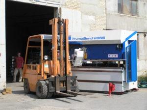 После доставки по центральному проезду цеха, станок с помощью погрузчика был задвинут в свою нишу и установлен на подкладки. Заказчик рекомендовал в цеху не фотографировать, поэтому представлены снимки только с разгрузки.