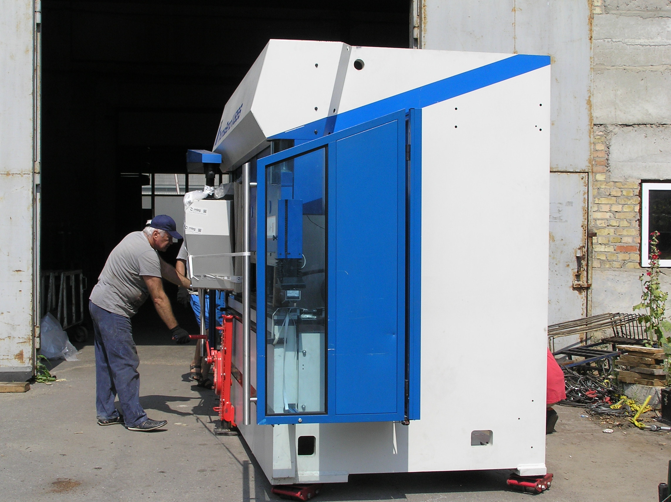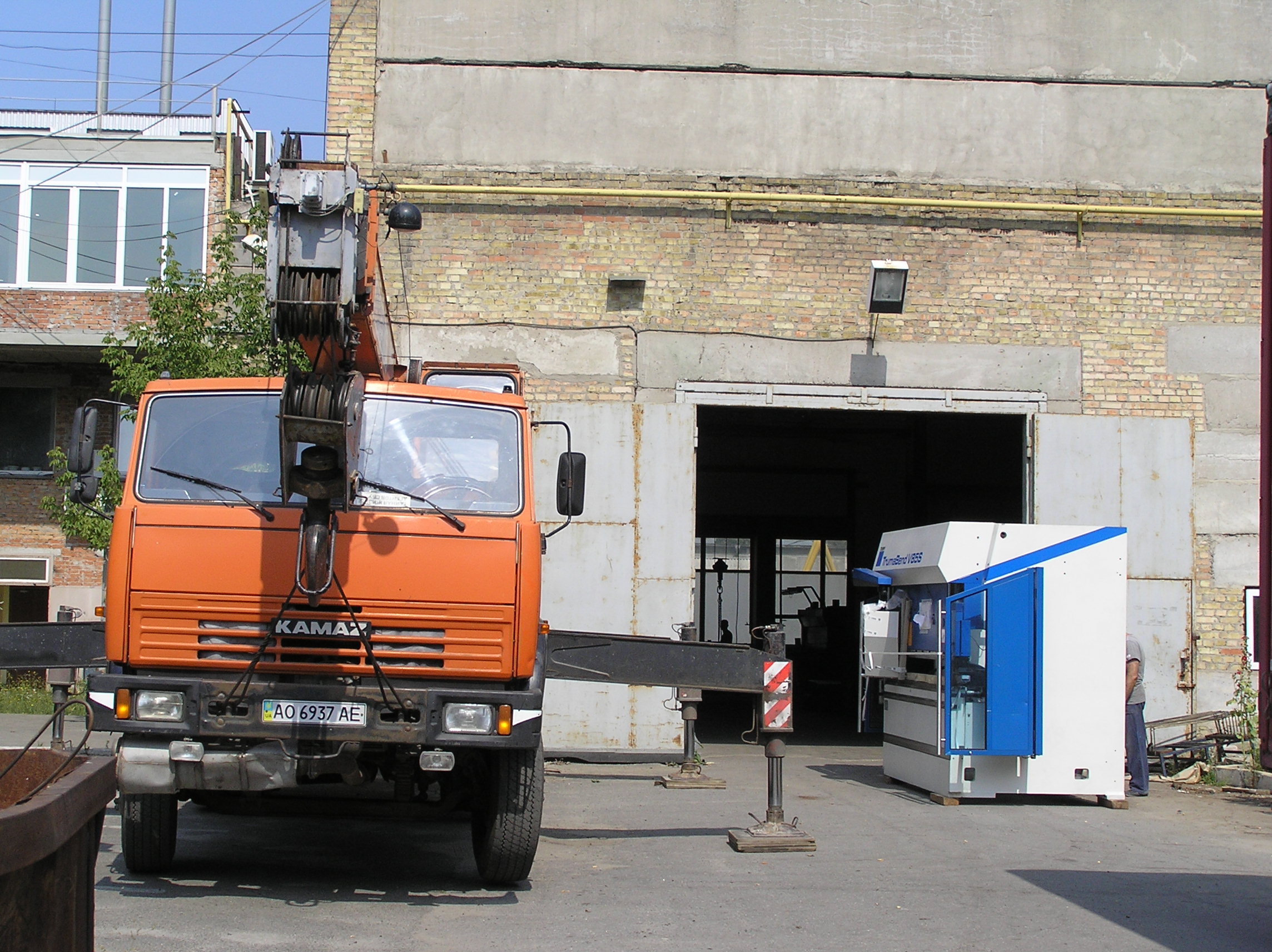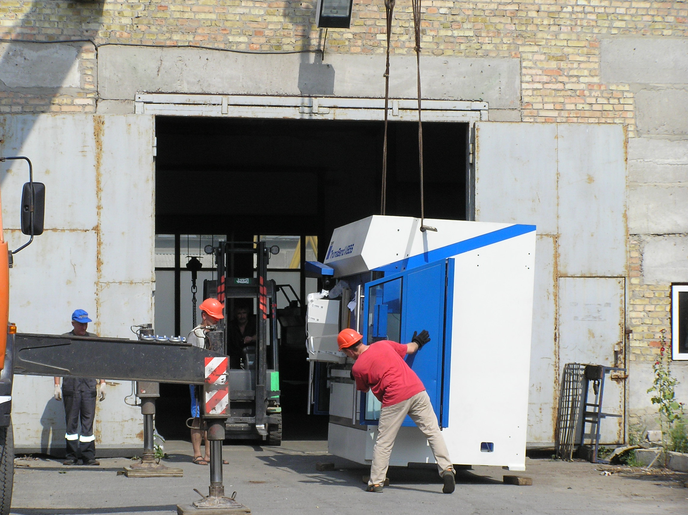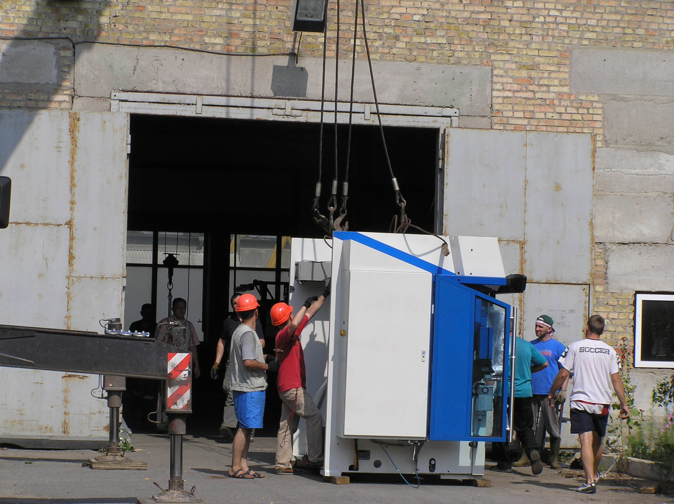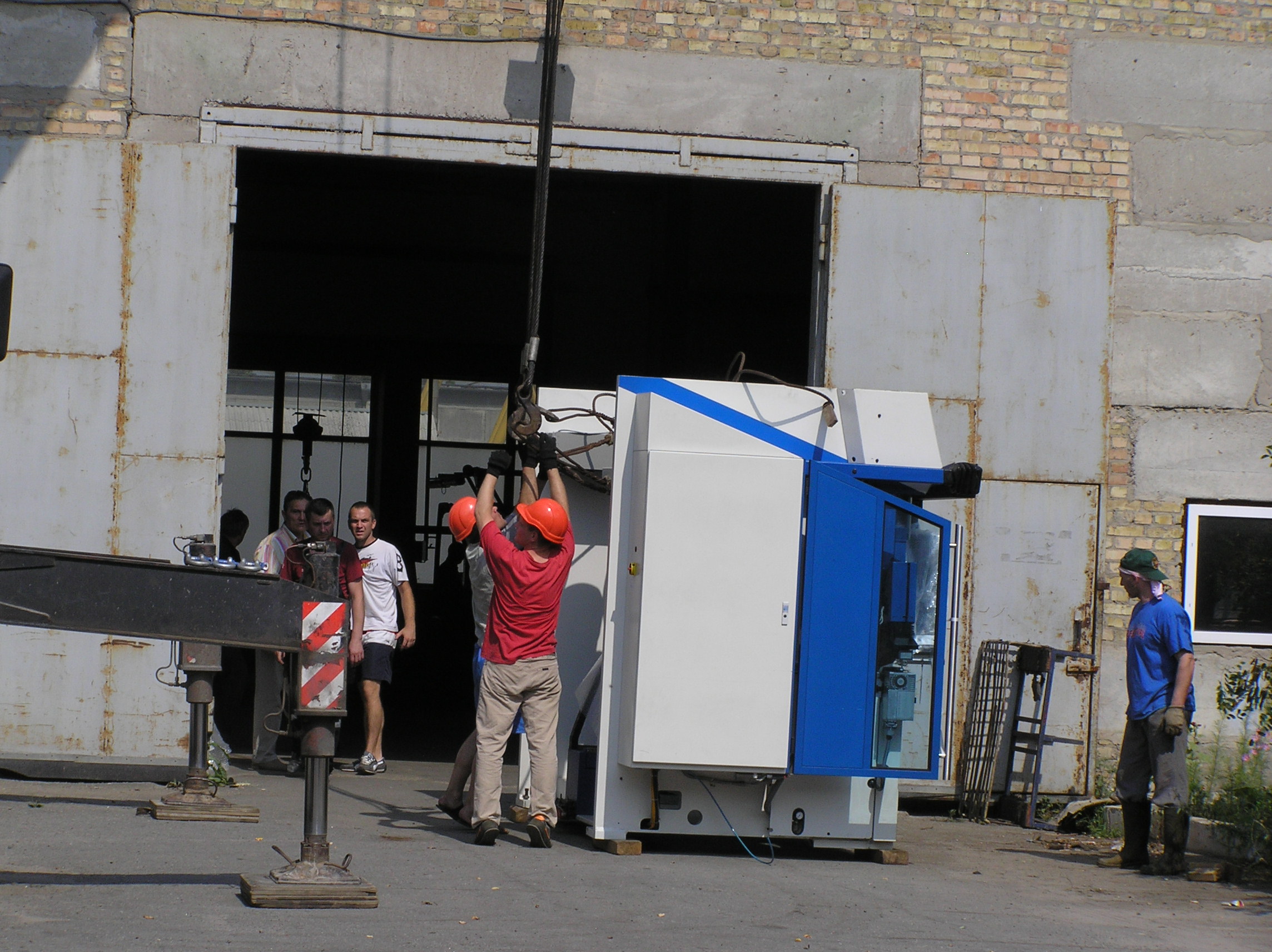 После доставки по центральному проезду цеха, станок с помощью погрузчика был задвинут в свою нишу и установлен на подкладки. Заказчик рекомендовал в цеху не фотографировать, поэтому представлены снимки только с разгрузки.