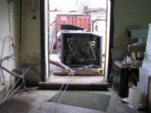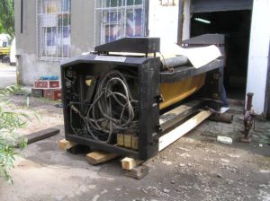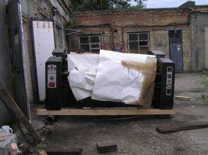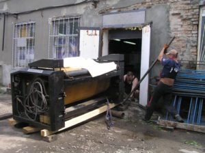 Перемещение печатного станка коландер (2500кг.) в цех. Из-за отсутствия жесткой рамы, станок был поставлен на 2-а деревянных бруска, на которых проходило передвижение. На этих же брусках станок в последствии и остался стоять в цеху. Перемещение станка в цех осложнялось узким проемом, зазор составлял около 3-х см. Вес станка – 2500 кг.