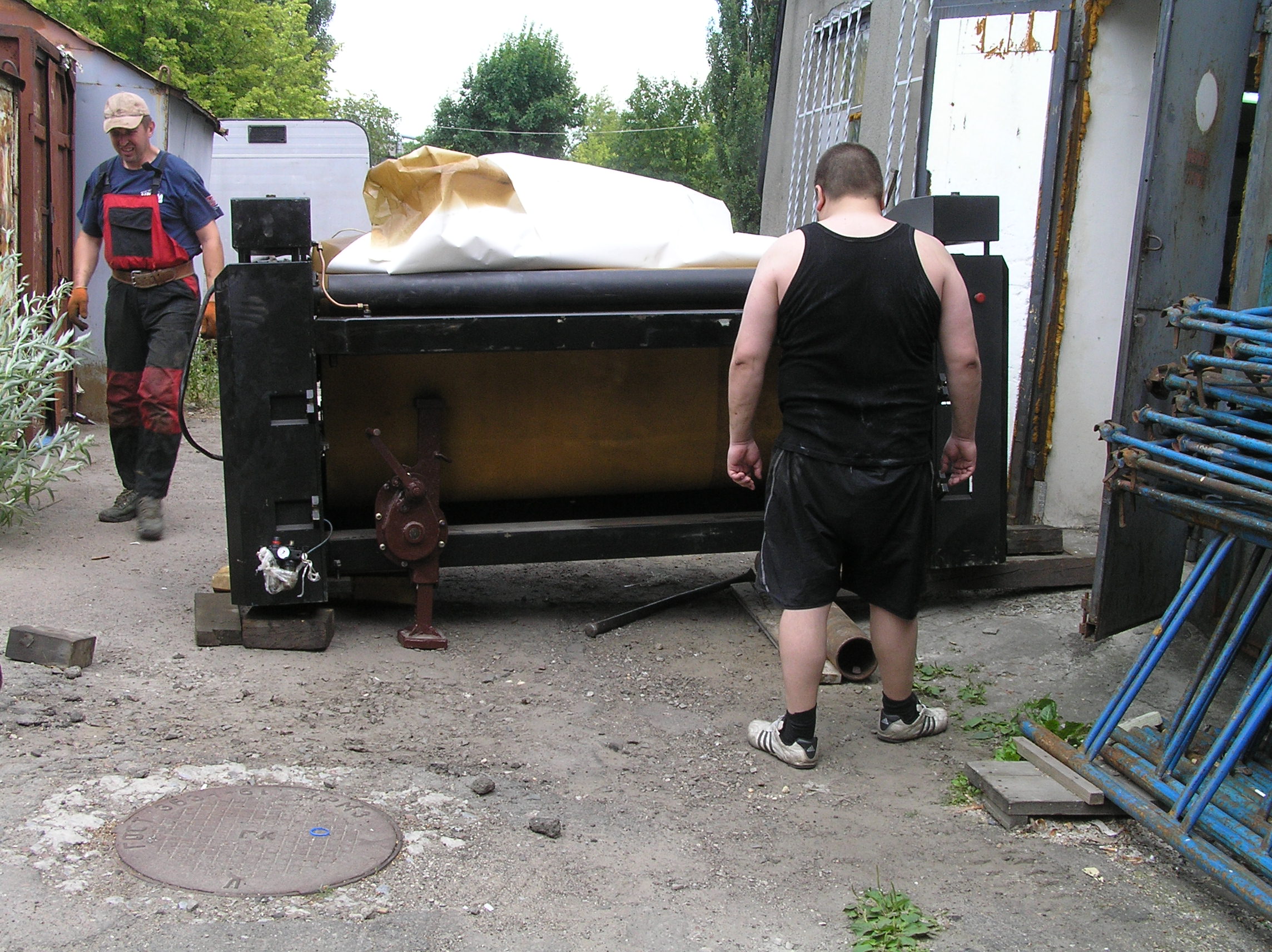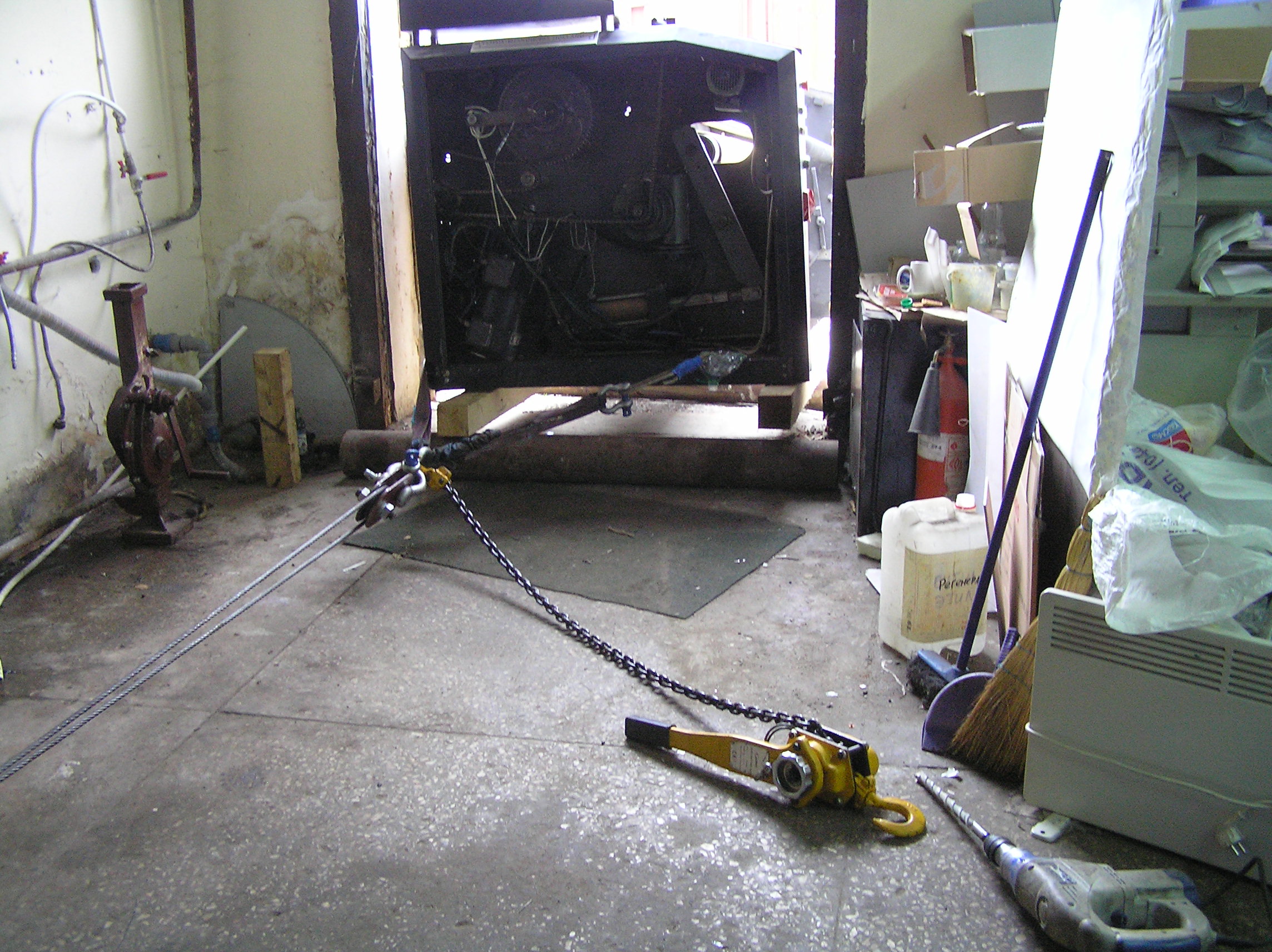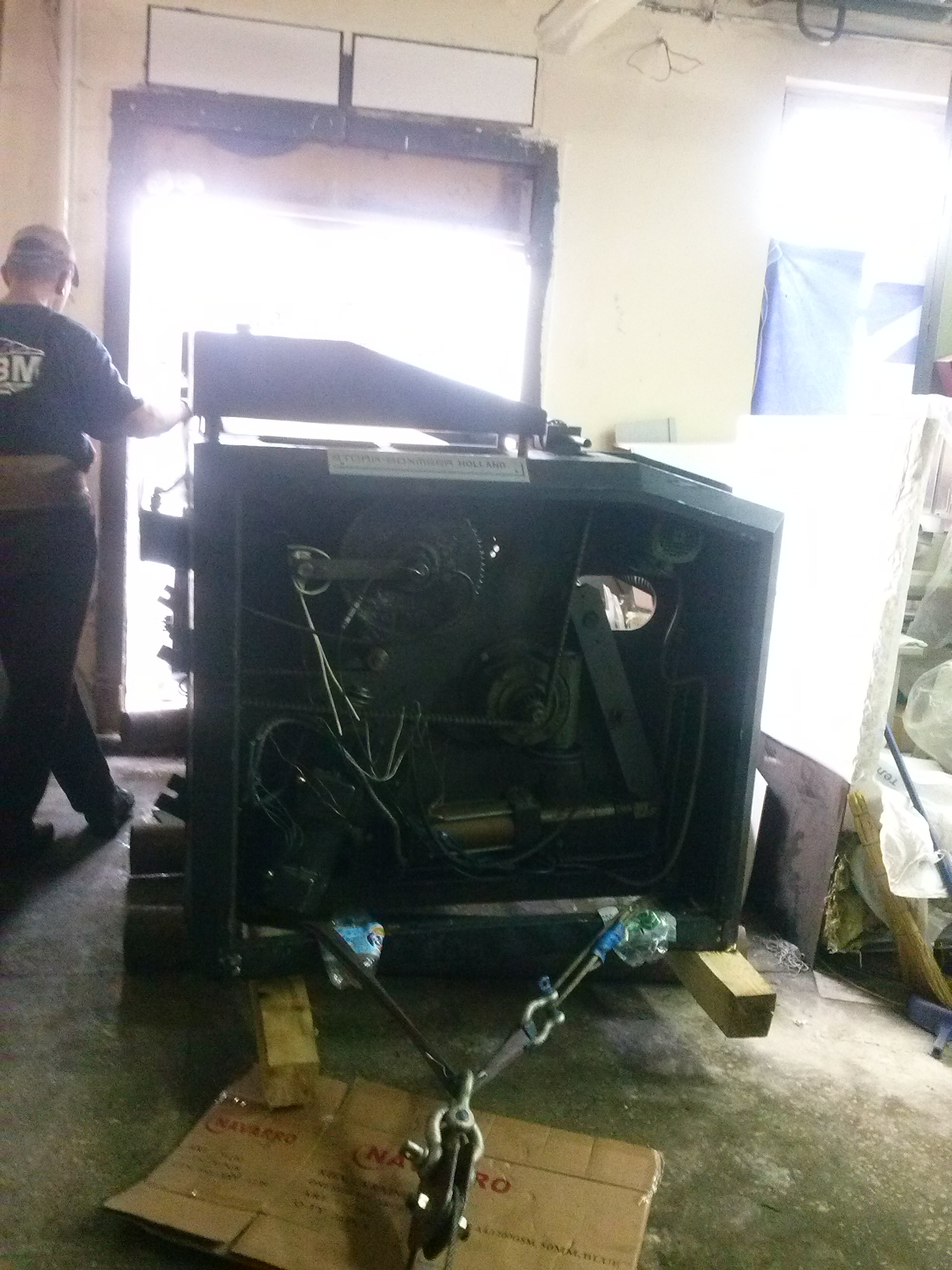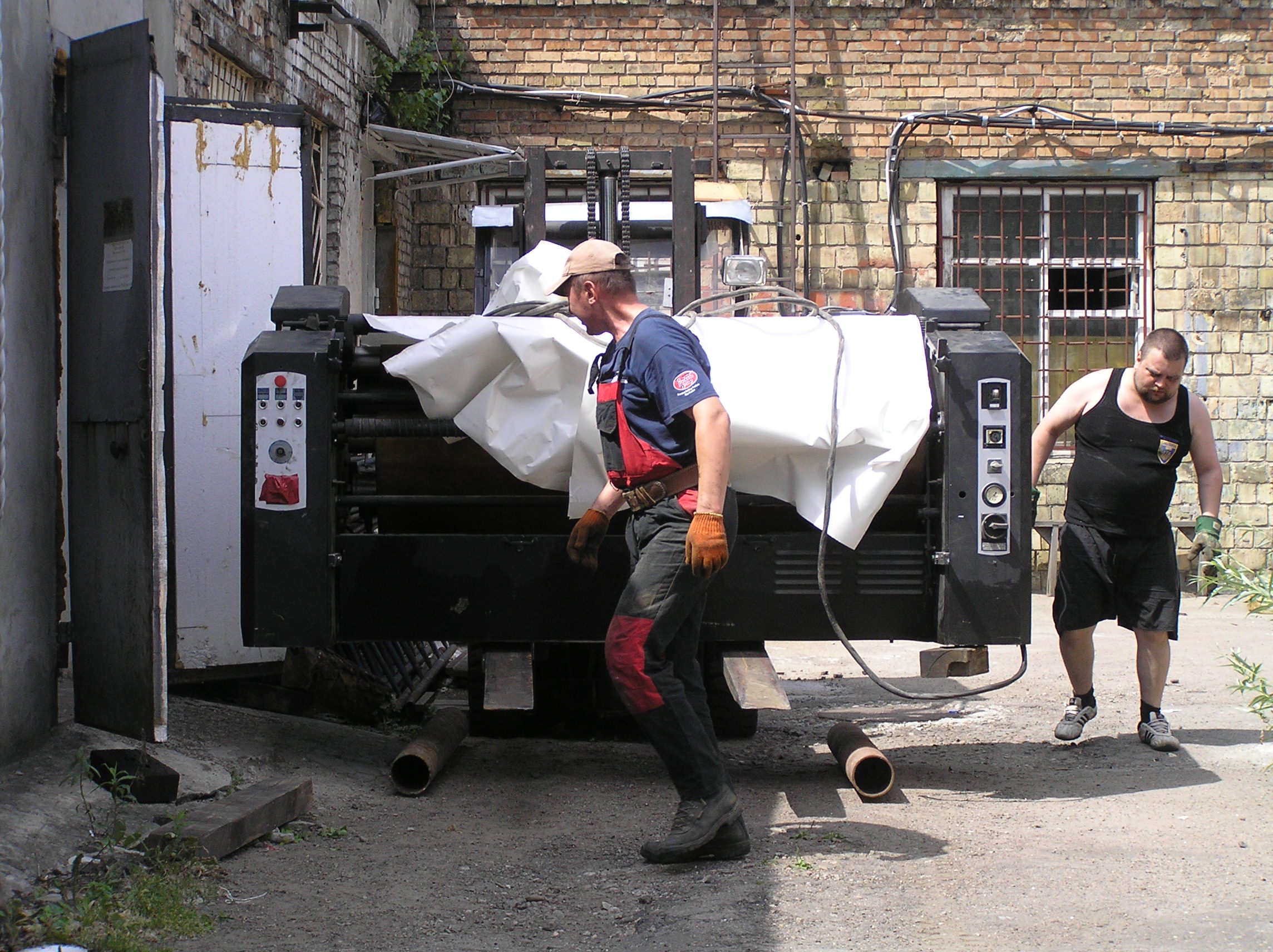 Перемещение печатного станка коландер (2500кг.) в цех. Из-за отсутствия жесткой рамы, станок был поставлен на 2-а деревянных бруска, на которых проходило передвижение. На этих же брусках станок в последствии и остался стоять в цеху. Перемещение станка в цех осложнялось узким проемом, зазор составлял около 3-х см. Вес станка – 2500 кг.