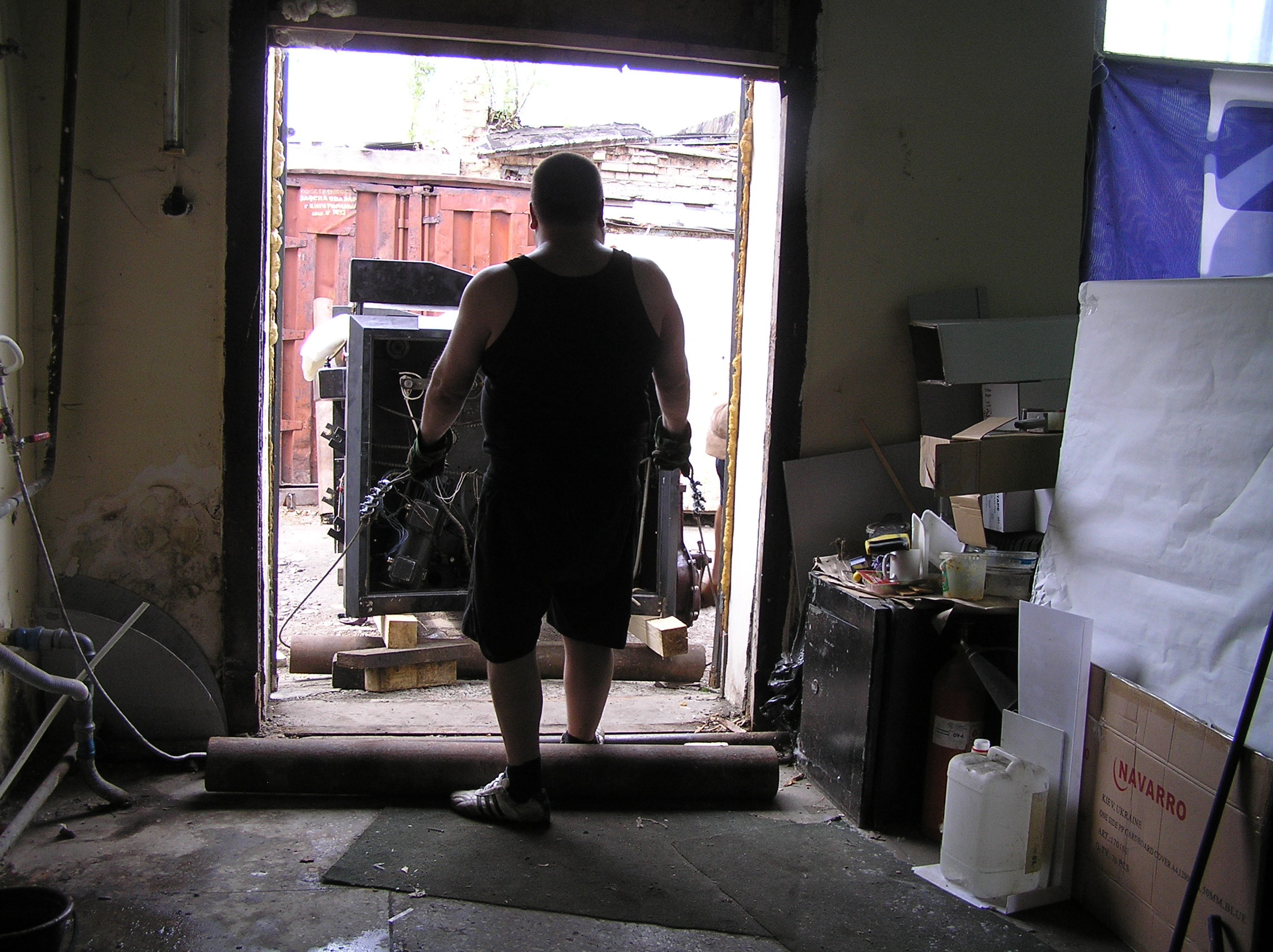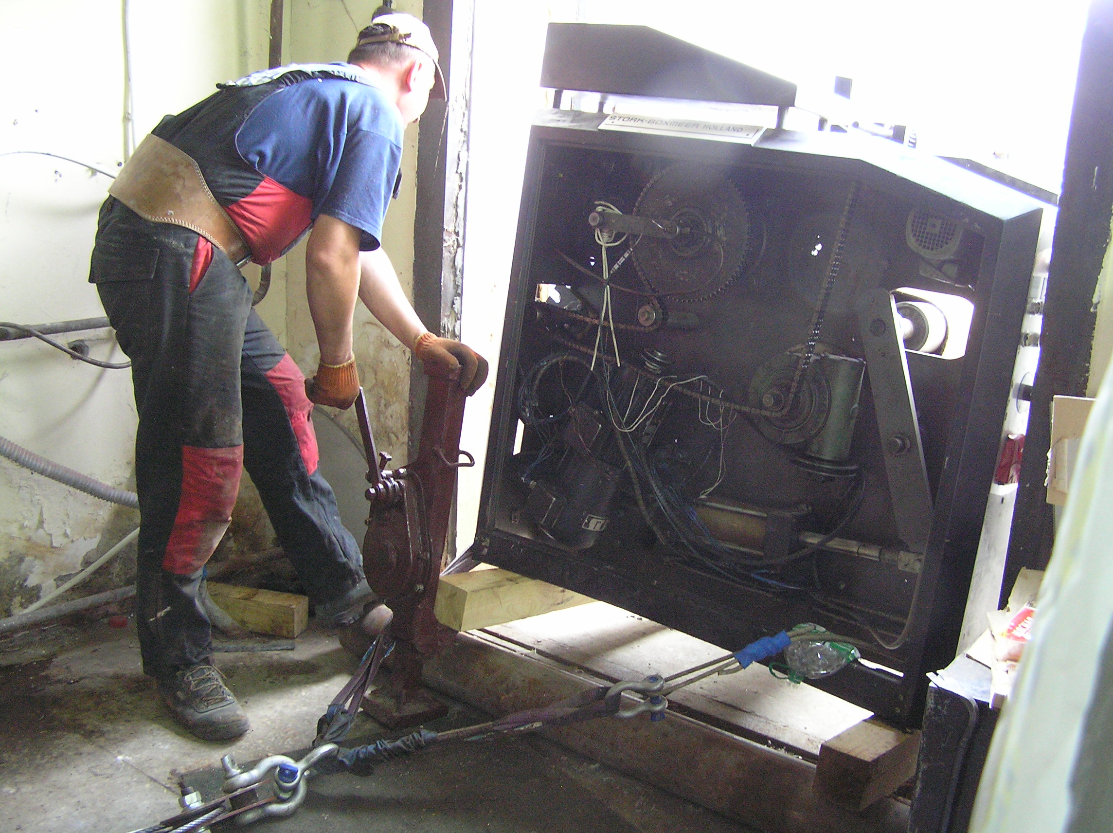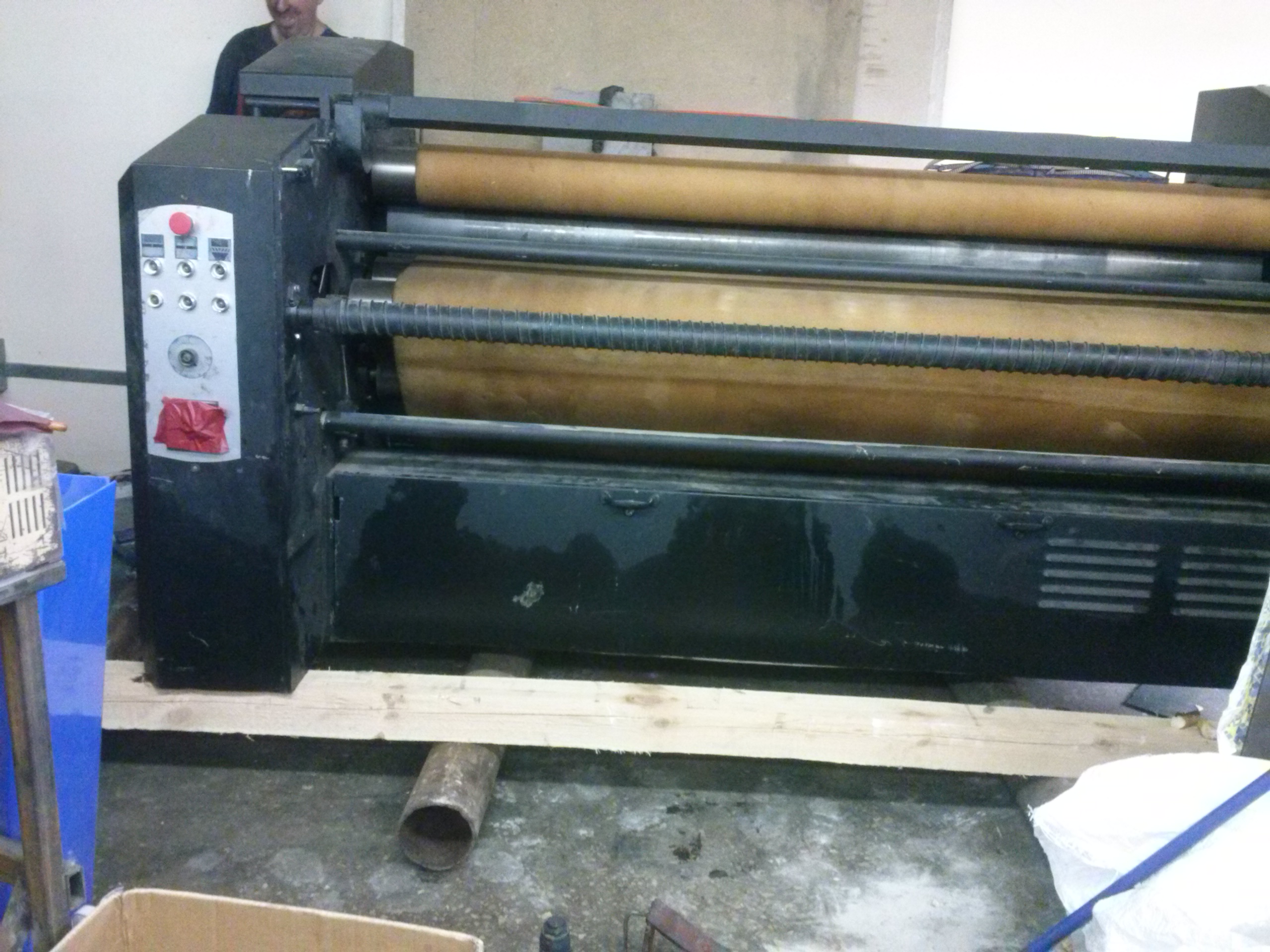 Перемещение печатного станка коландер (2500кг.) в цех. Из-за отсутствия жесткой рамы, станок был поставлен на 2-а деревянных бруска, на которых проходило передвижение. На этих же брусках станок в последствии и остался стоять в цеху. Перемещение станка в цех осложнялось узким проемом, зазор составлял около 3-х см. Вес станка – 2500 кг.