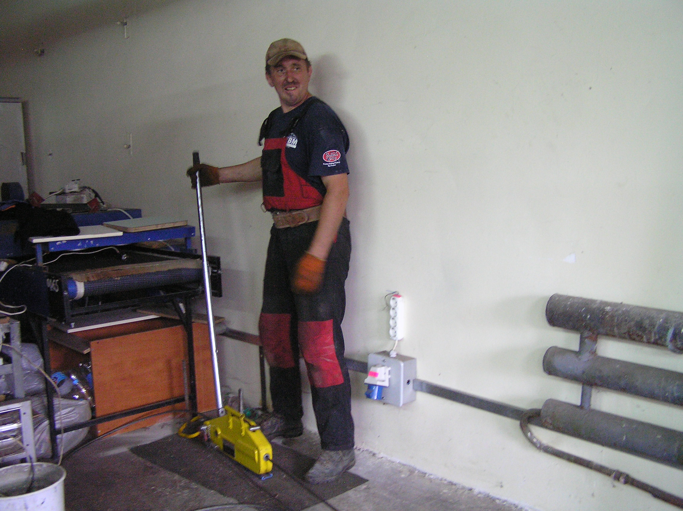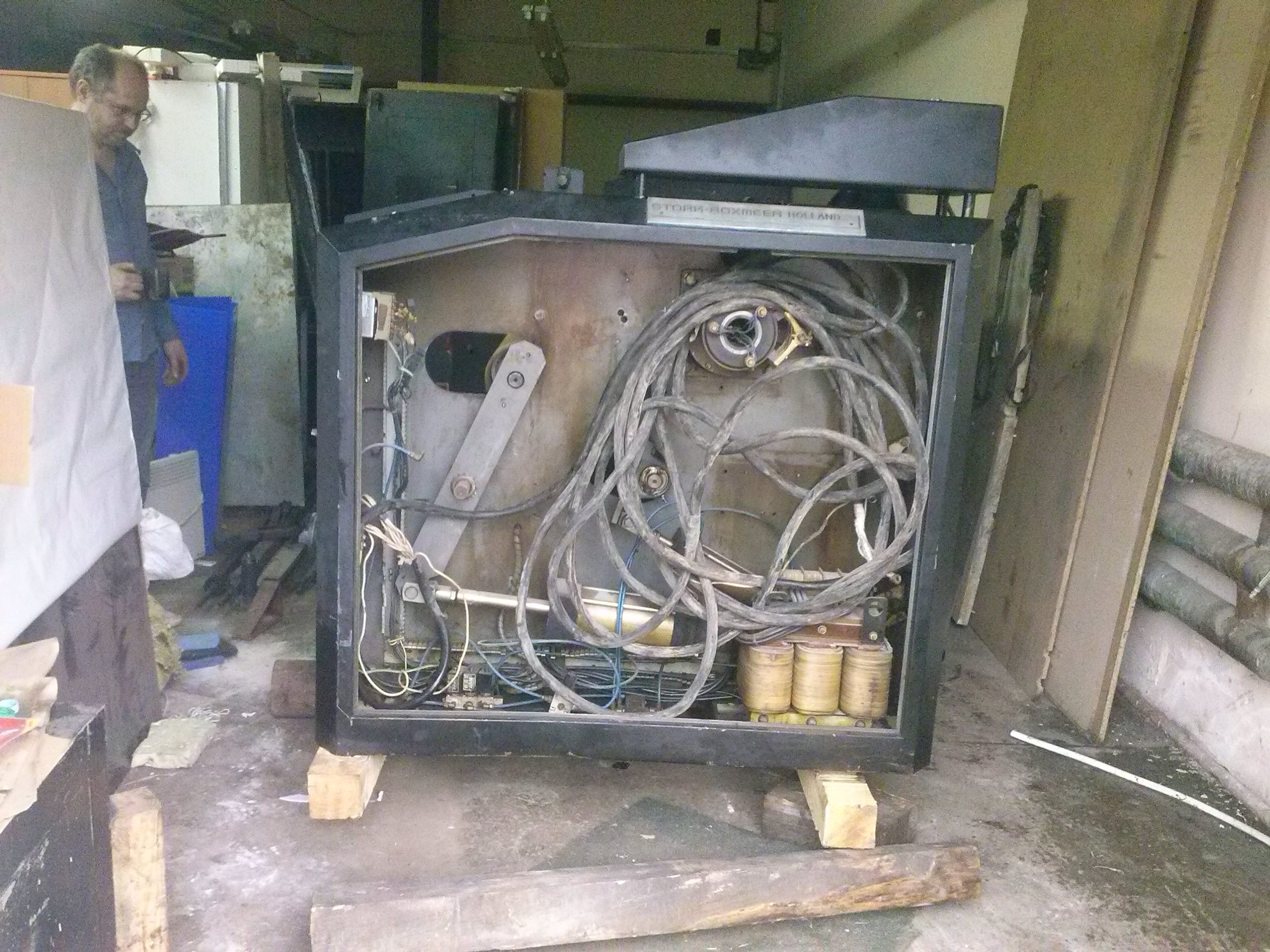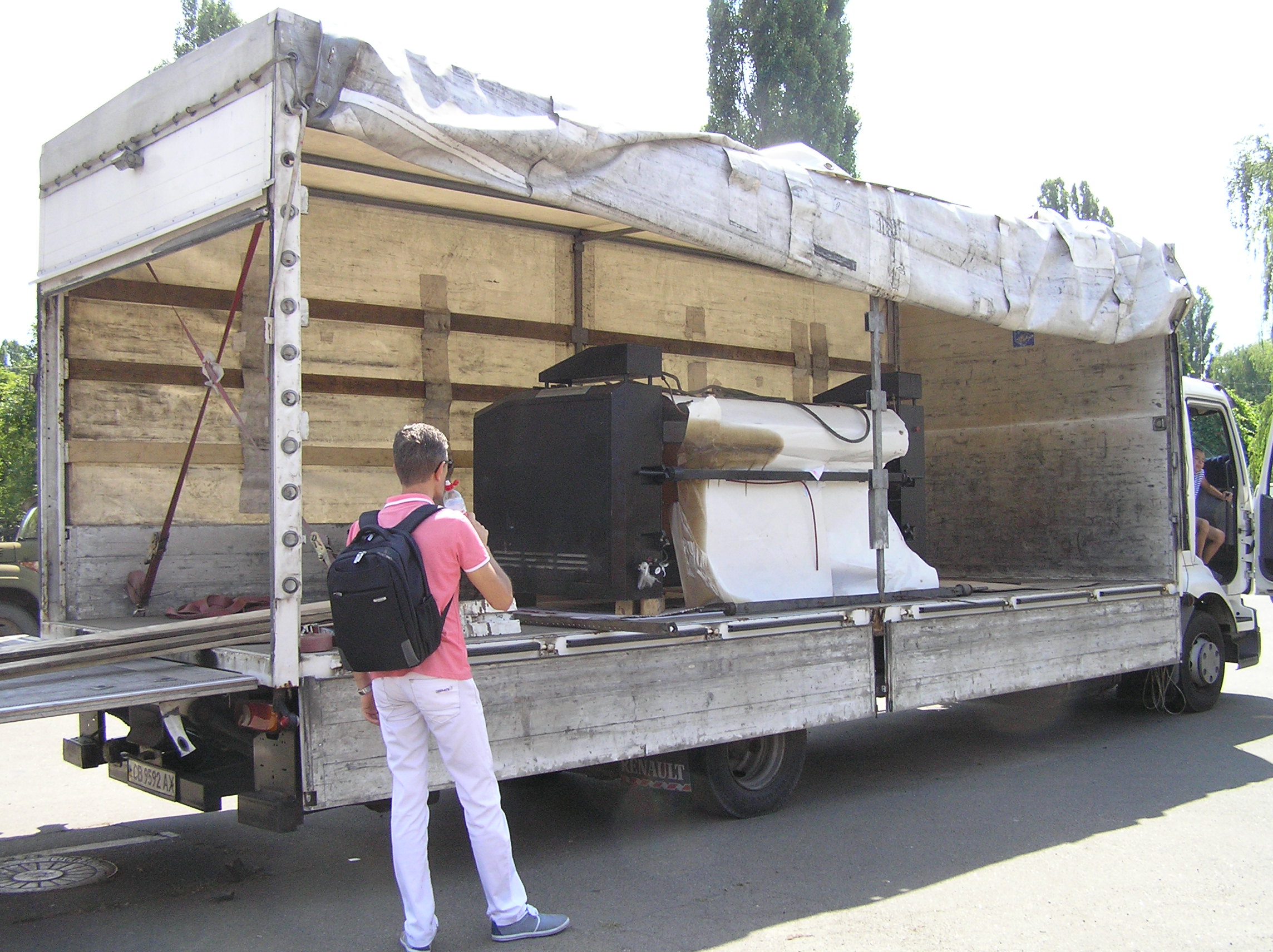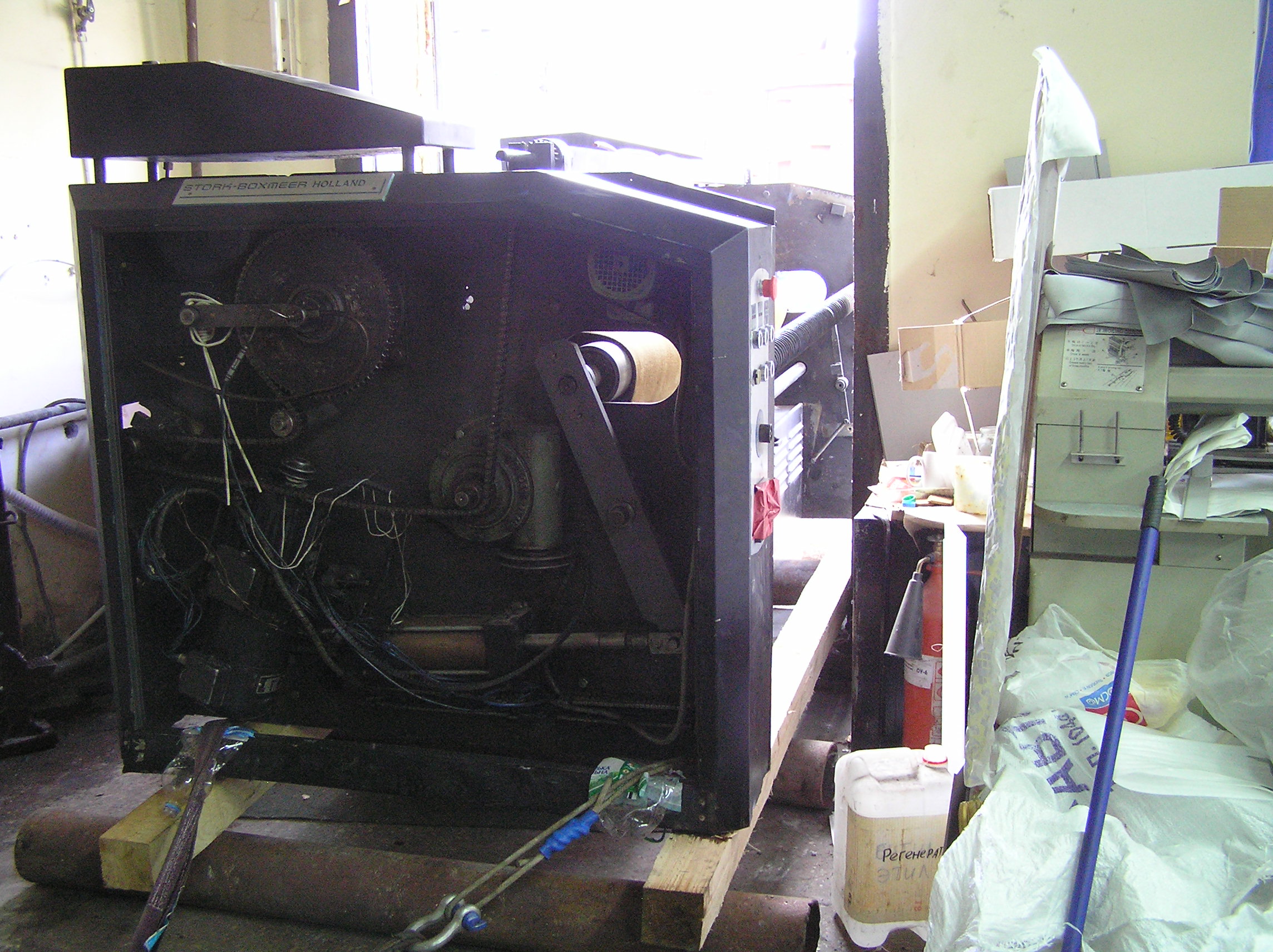 Перемещение печатного станка коландер (2500кг.) в цех. Из-за отсутствия жесткой рамы, станок был поставлен на 2-а деревянных бруска, на которых проходило передвижение. На этих же брусках станок в последствии и остался стоять в цеху. Перемещение станка в цех осложнялось узким проемом, зазор составлял около 3-х см. Вес станка – 2500 кг.