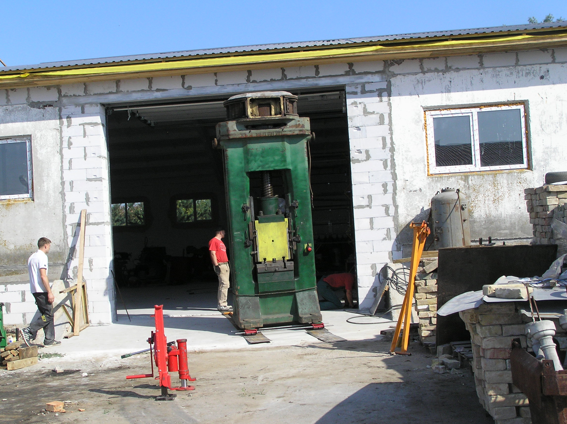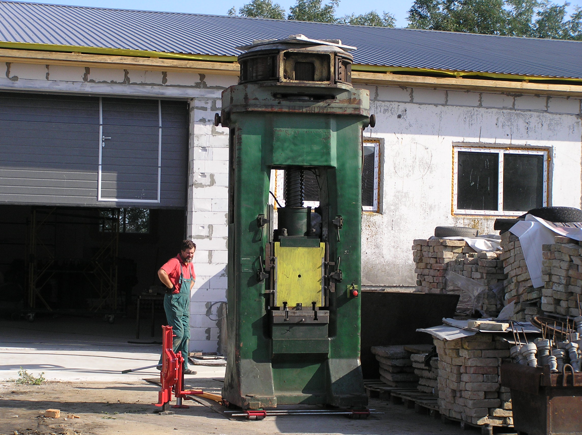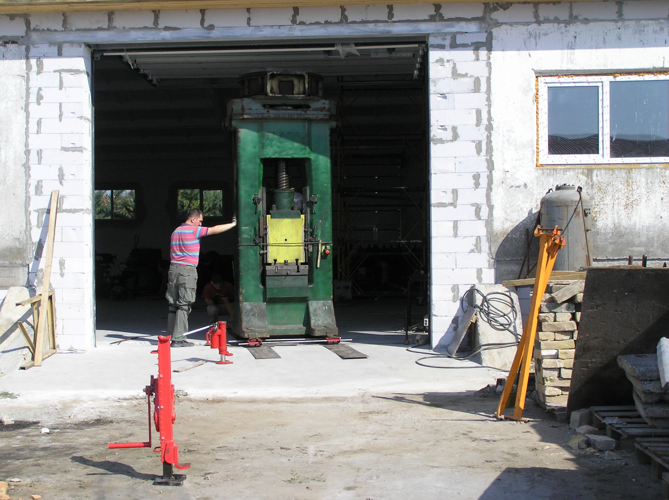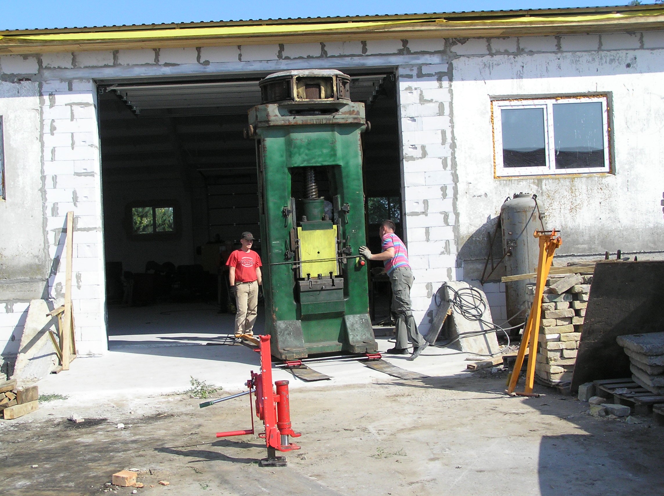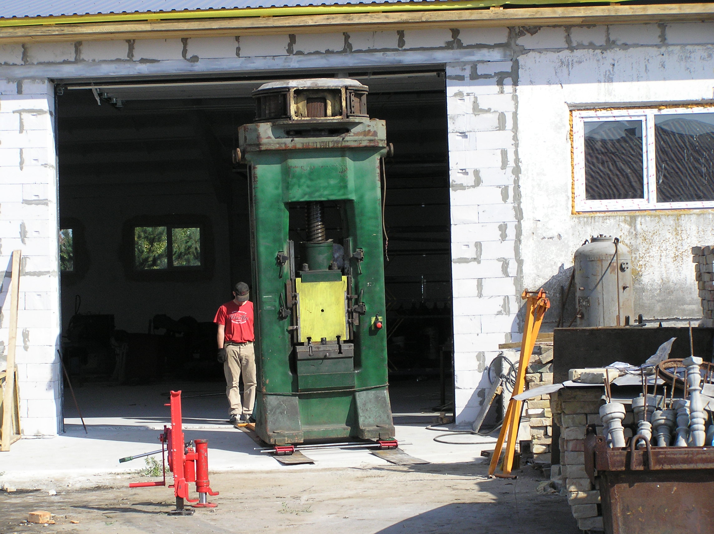 Именно такой груз встретил нас в этот раз. Пресс имел основание 1.5м. на 1.5м., высоту 4 м. и вес 12 т. Кран поставил крепыша прямо перед воротами цеха. При въезде в цех небольшой подъем, в воротах канава с высоковольтным кабелем. Все, как мы любим.
