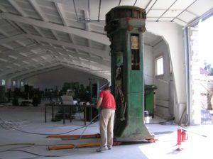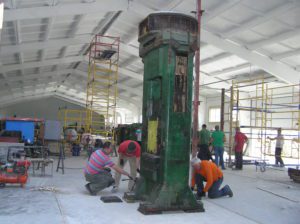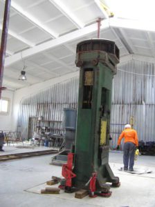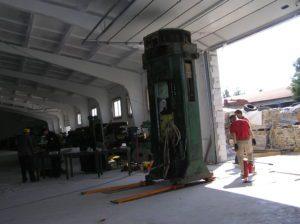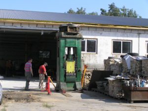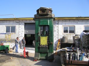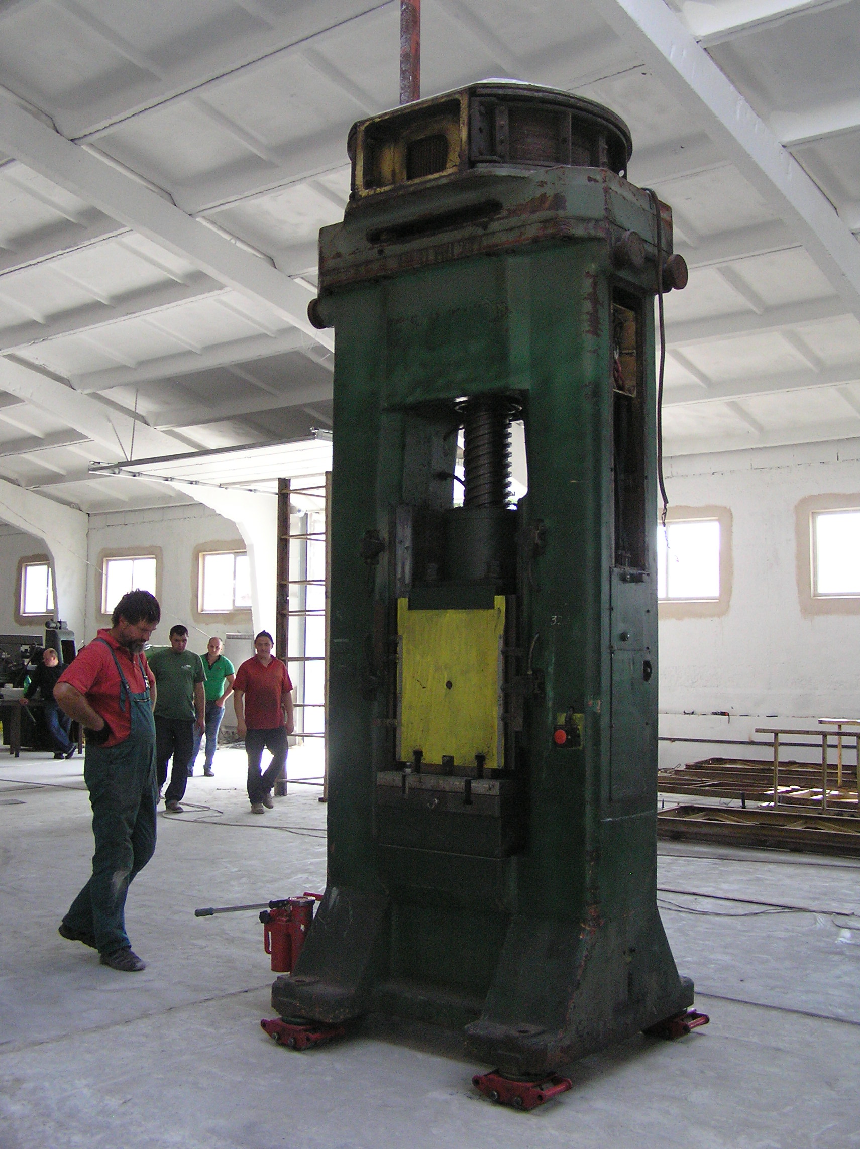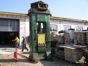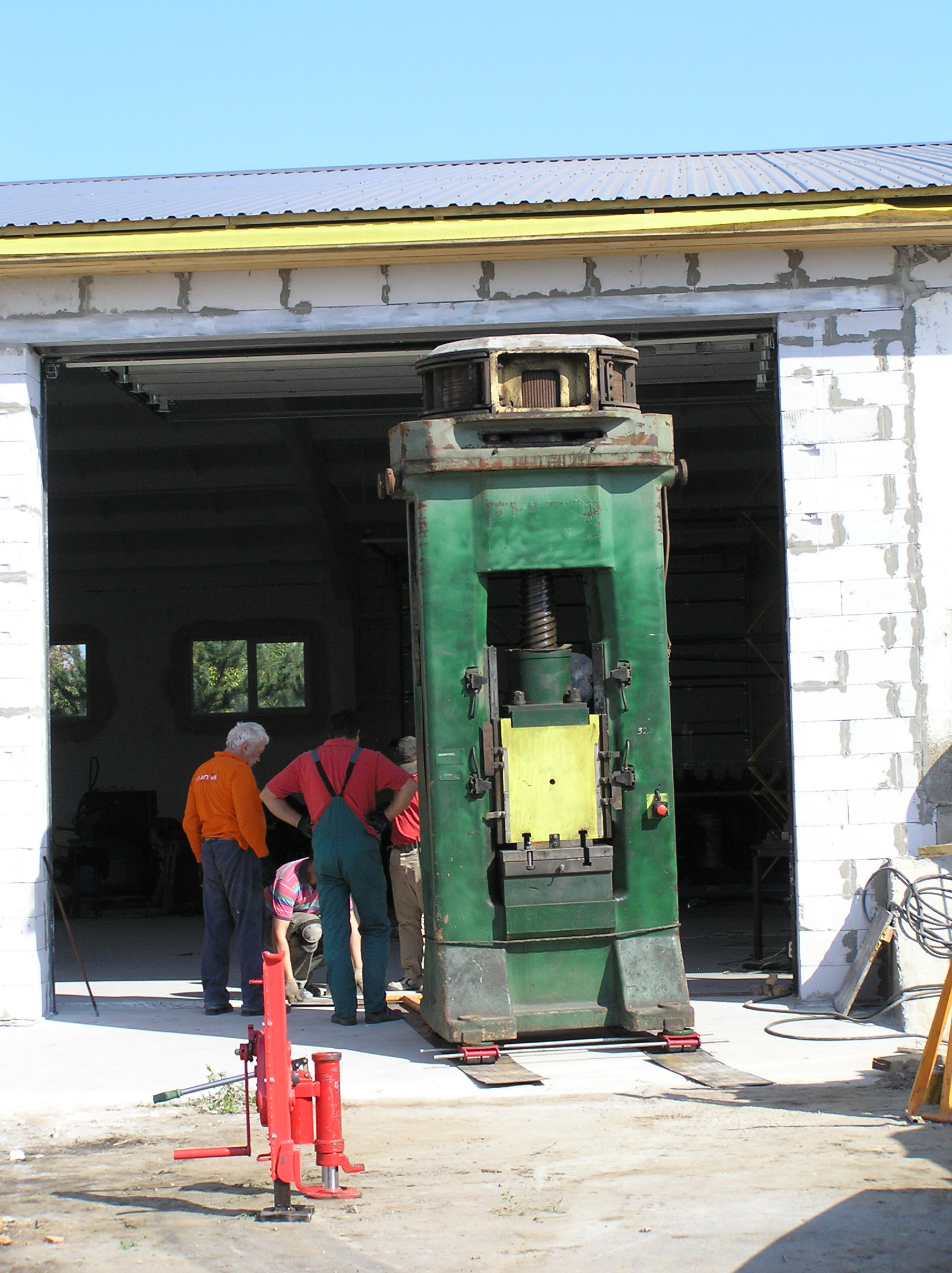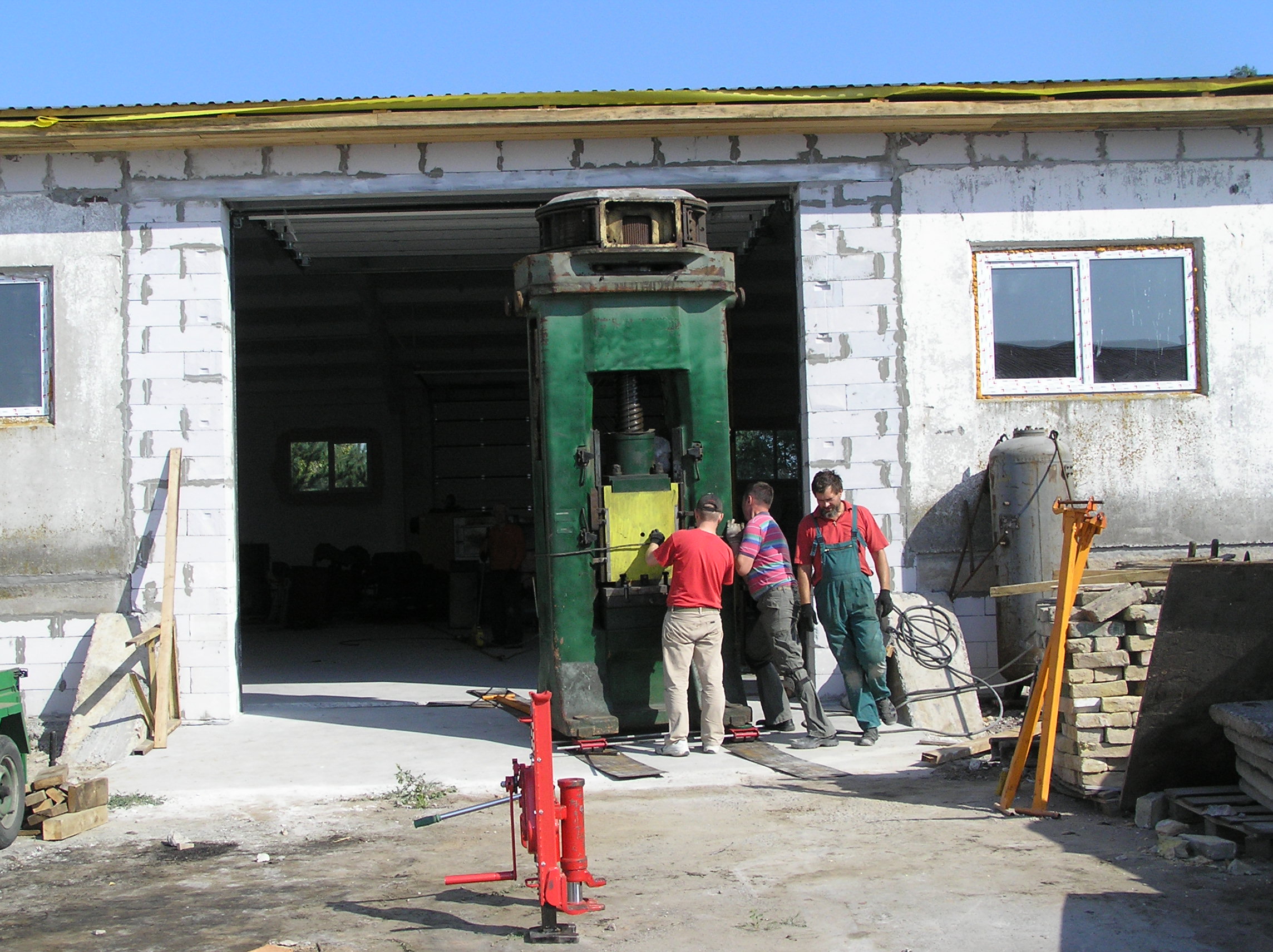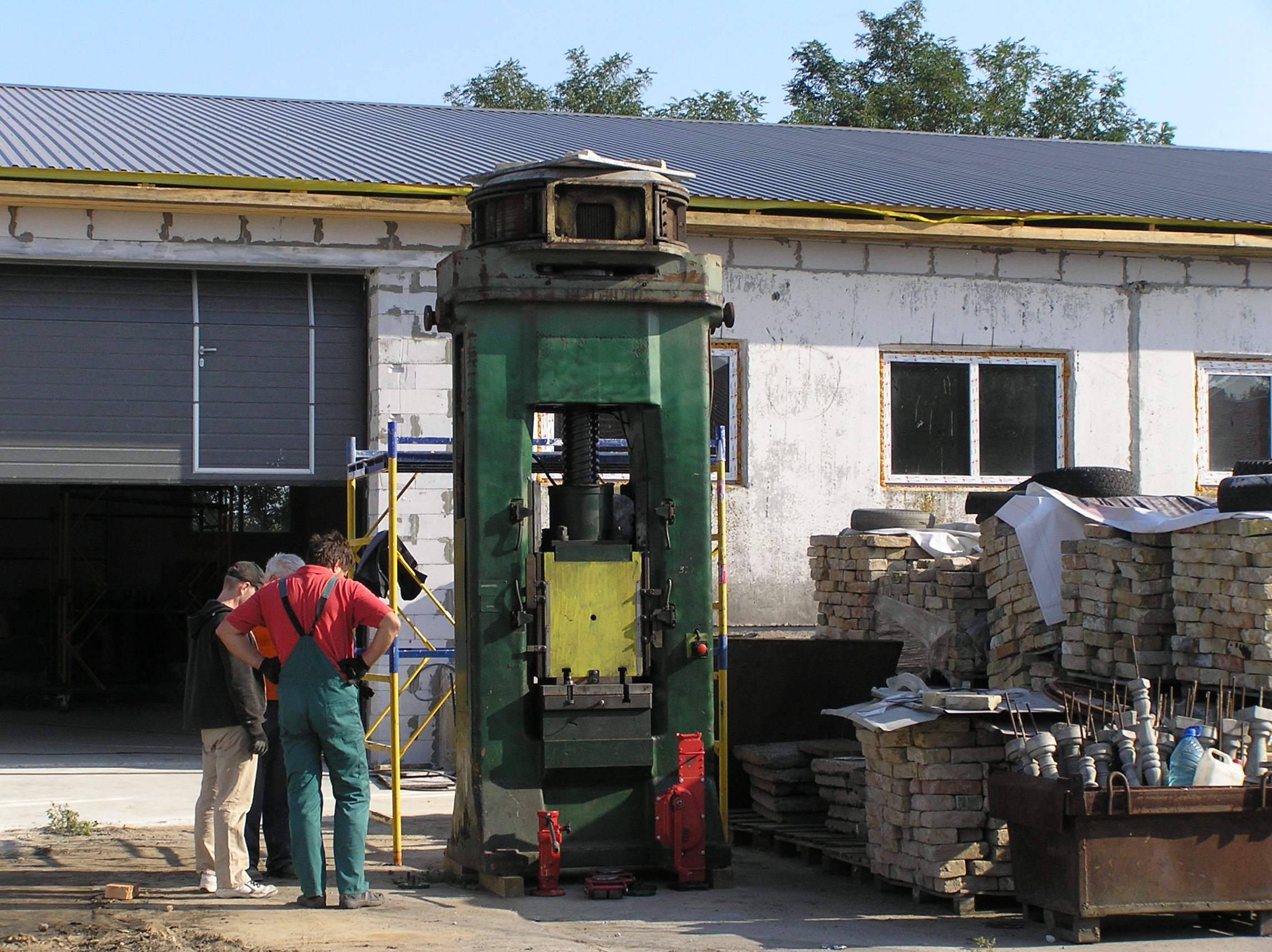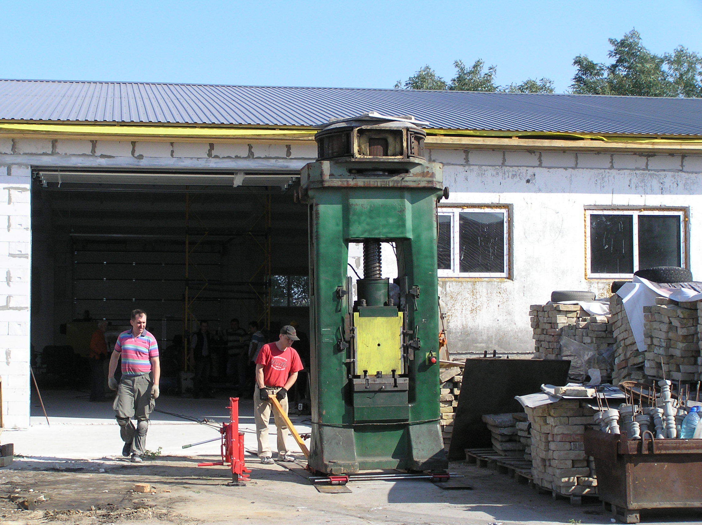 Именно такой груз встретил нас в этот раз. Пресс имел основание 1.5м. на 1.5м., высоту 4 м. и вес 12 т. Кран поставил крепыша прямо перед воротами цеха. При въезде в цех небольшой подъем, в воротах канава с высоковольтным кабелем. Все, как мы любим.