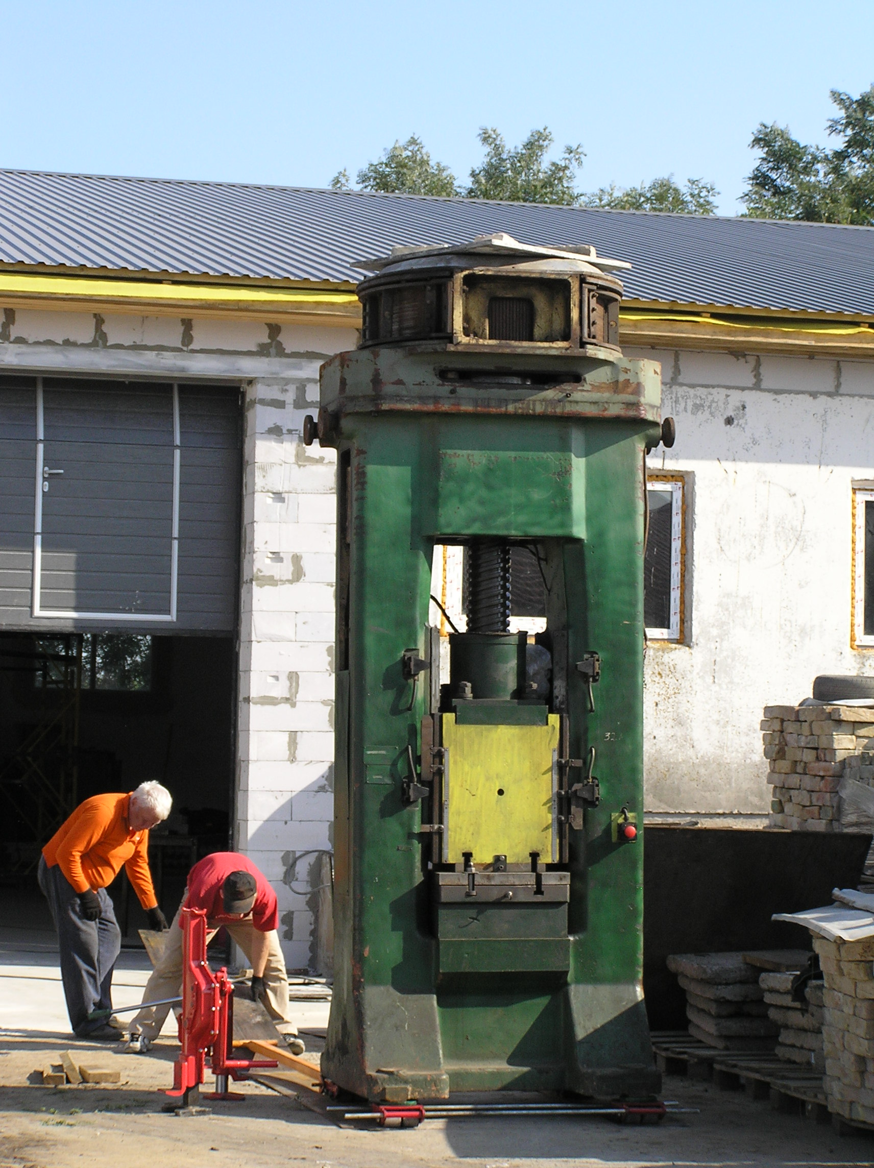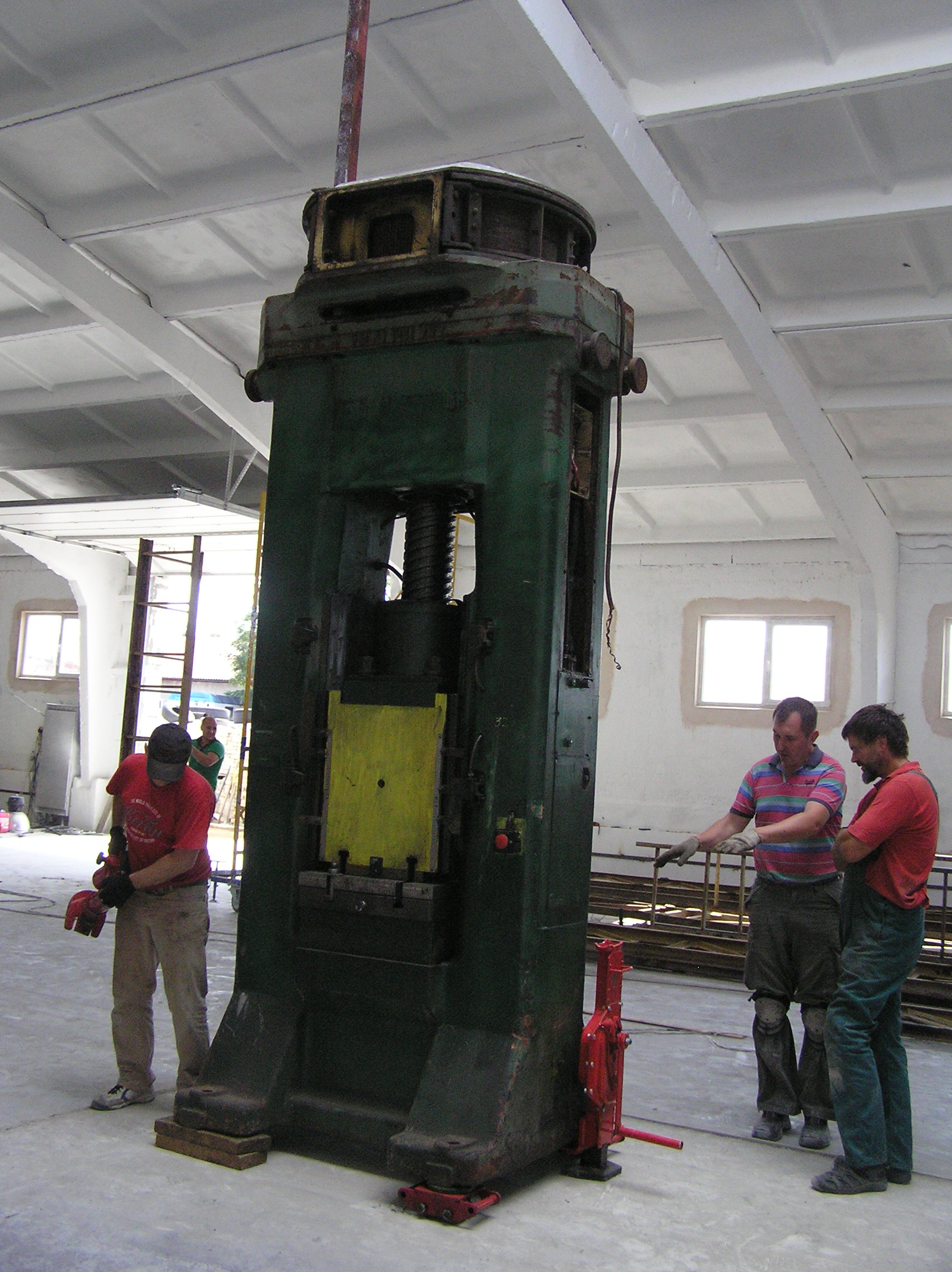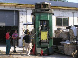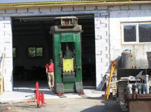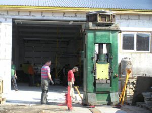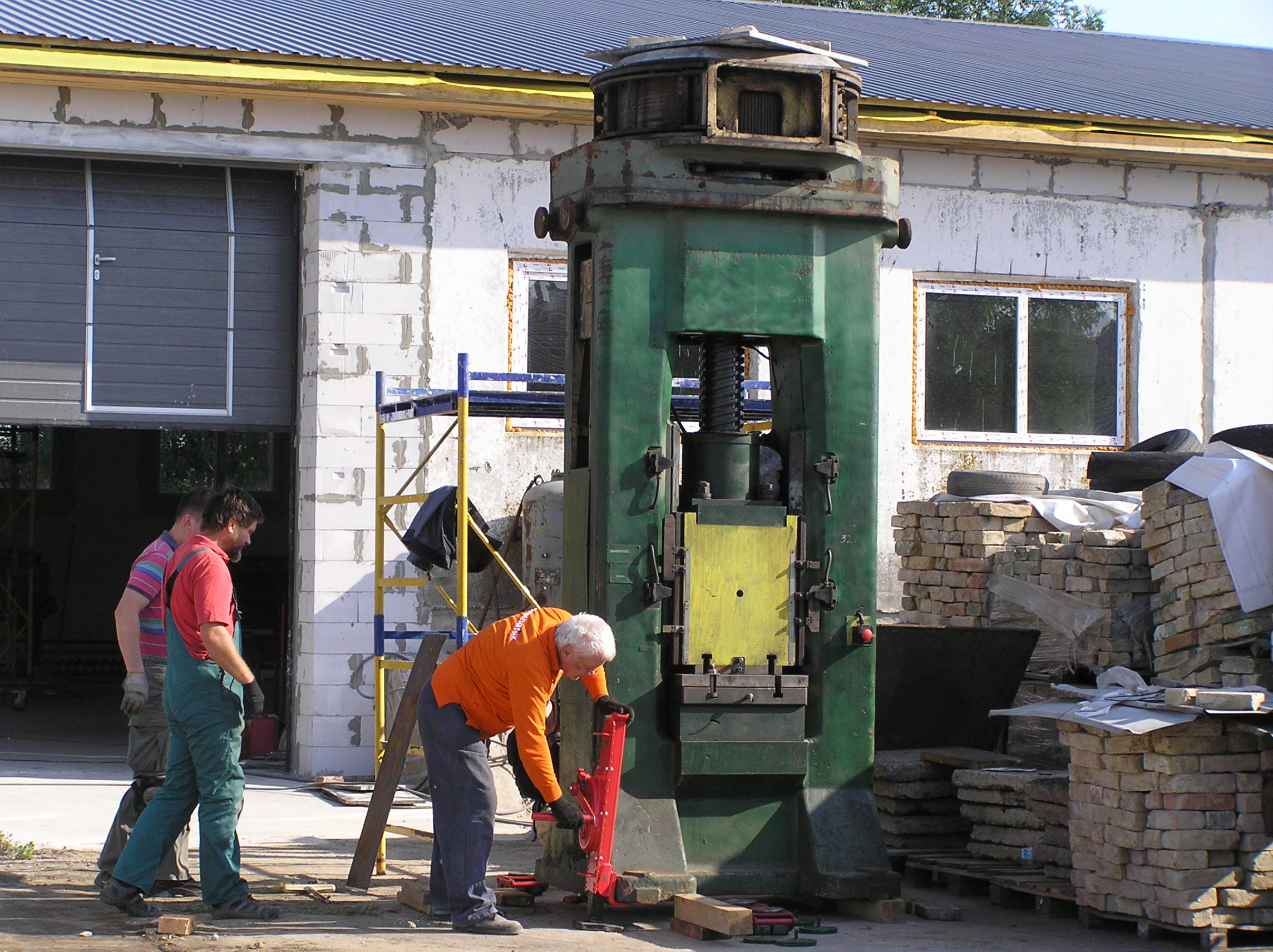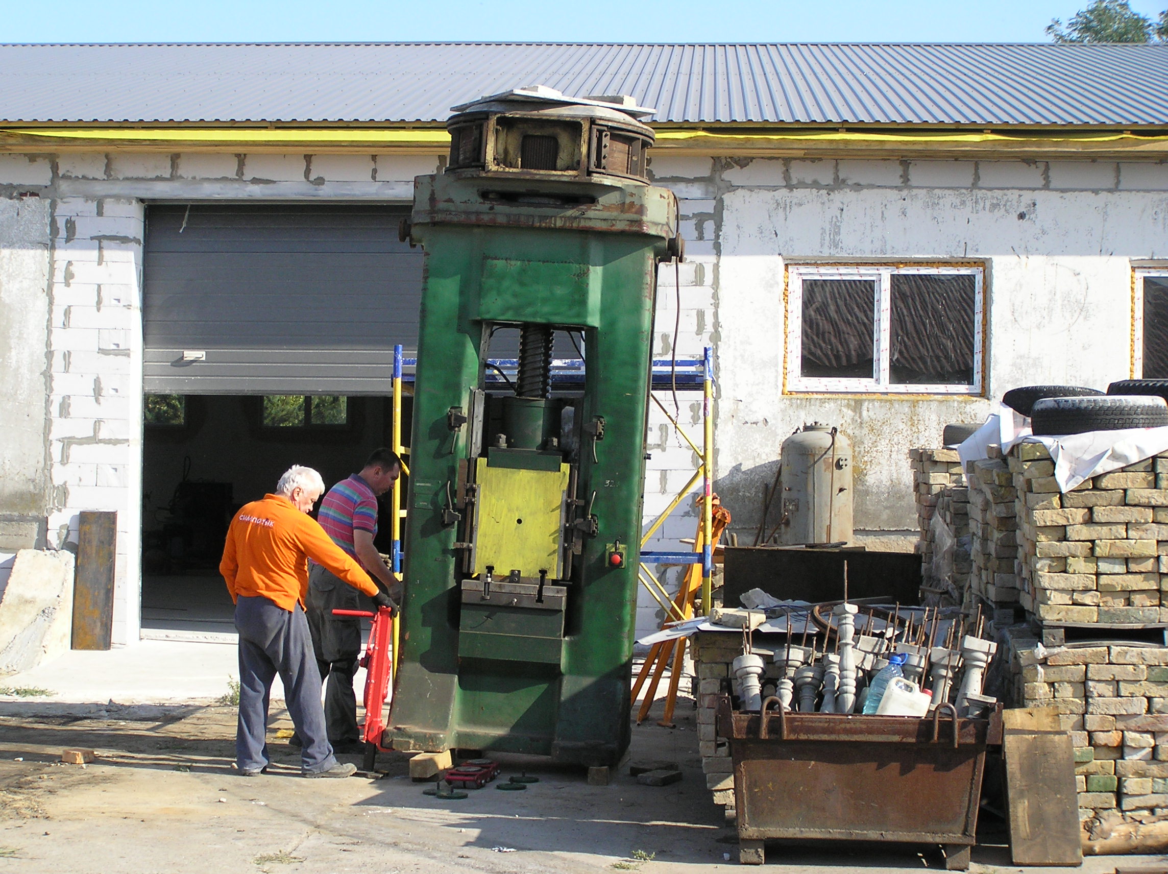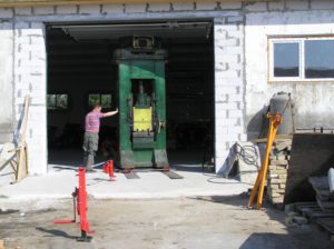 Страсти закончились, когда мы въехали в цех. Для пресса в уровень с основным полом была залита бетонная подушка. Развернувшись на ходу на 180 градусов, крепыш занял предписанное ему место. Под «лапки» из резины были изготовлены подкладки, на них после проверки уровня пресс и был установлен.