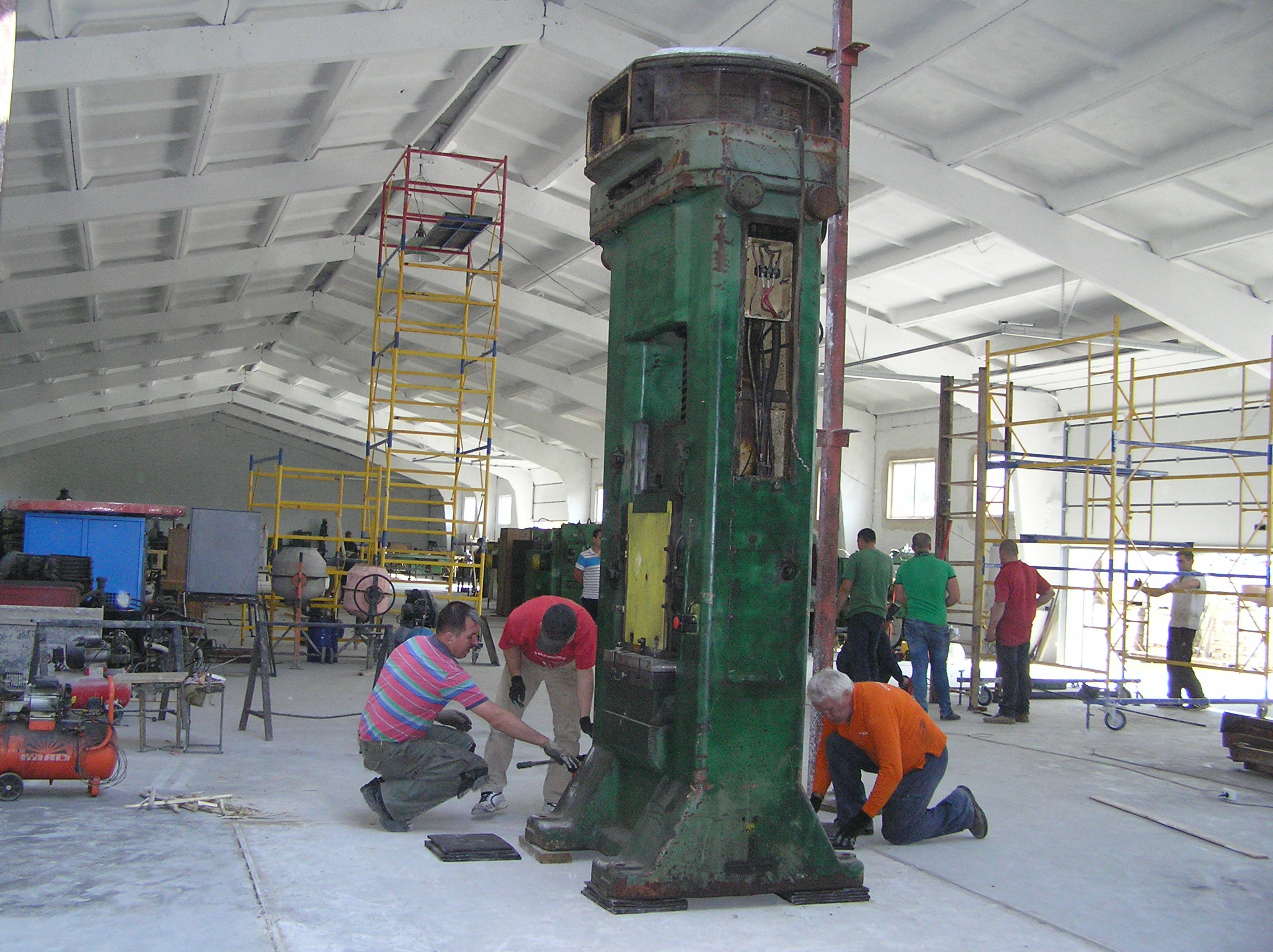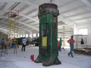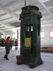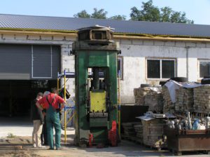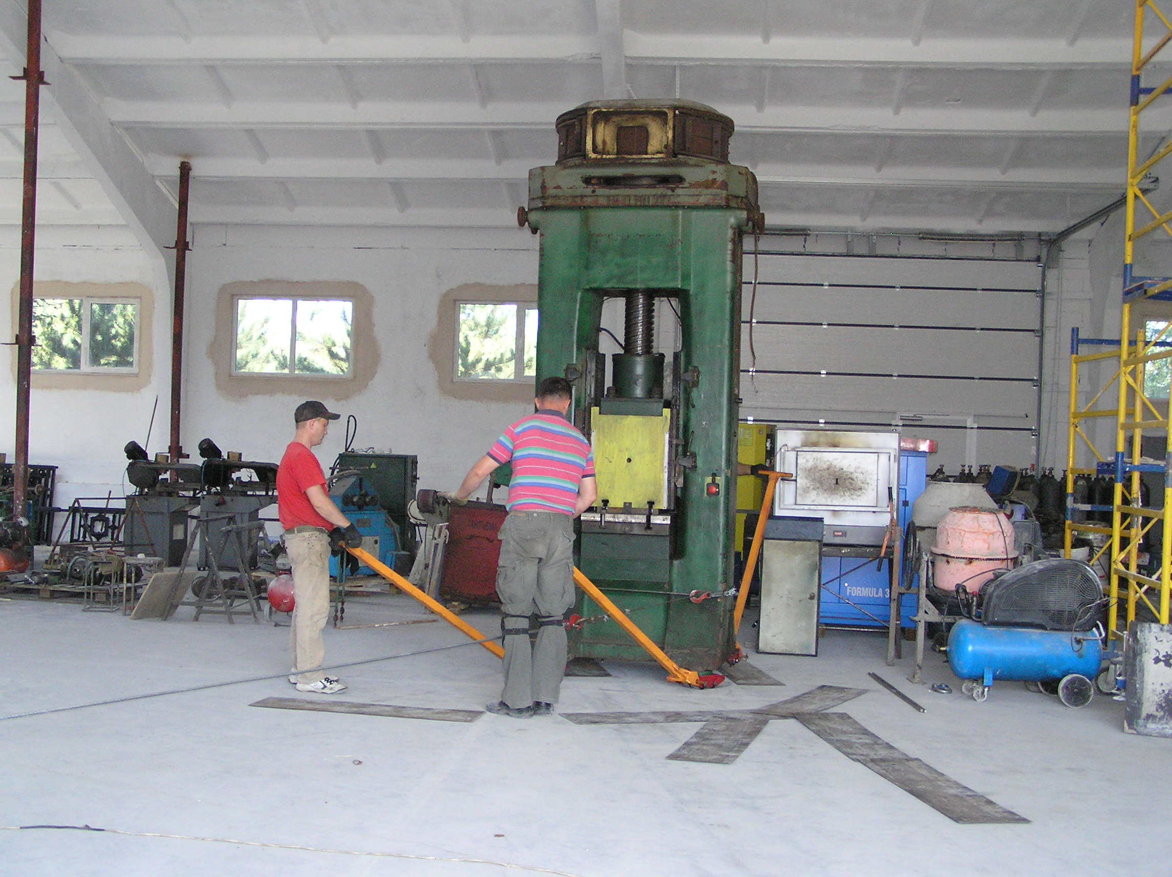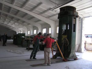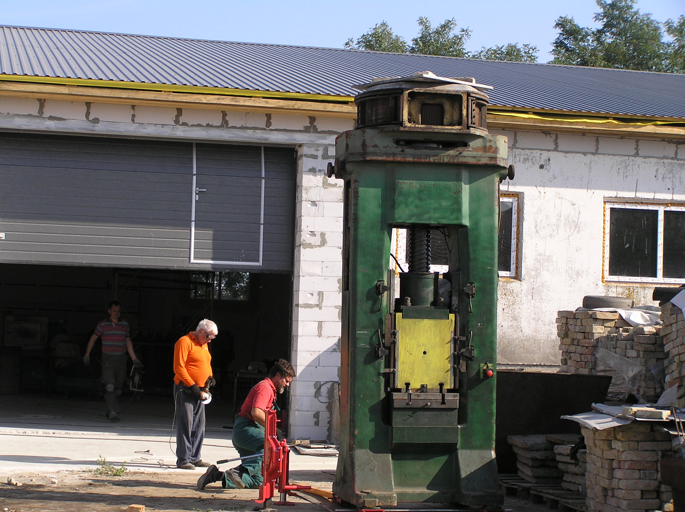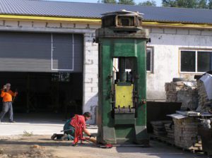 Страсти закончились, когда мы въехали в цех. Для пресса в уровень с основным полом была залита бетонная подушка. Развернувшись на ходу на 180 градусов, крепыш занял предписанное ему место. Под «лапки» из резины были изготовлены подкладки, на них после проверки уровня пресс и был установлен.
