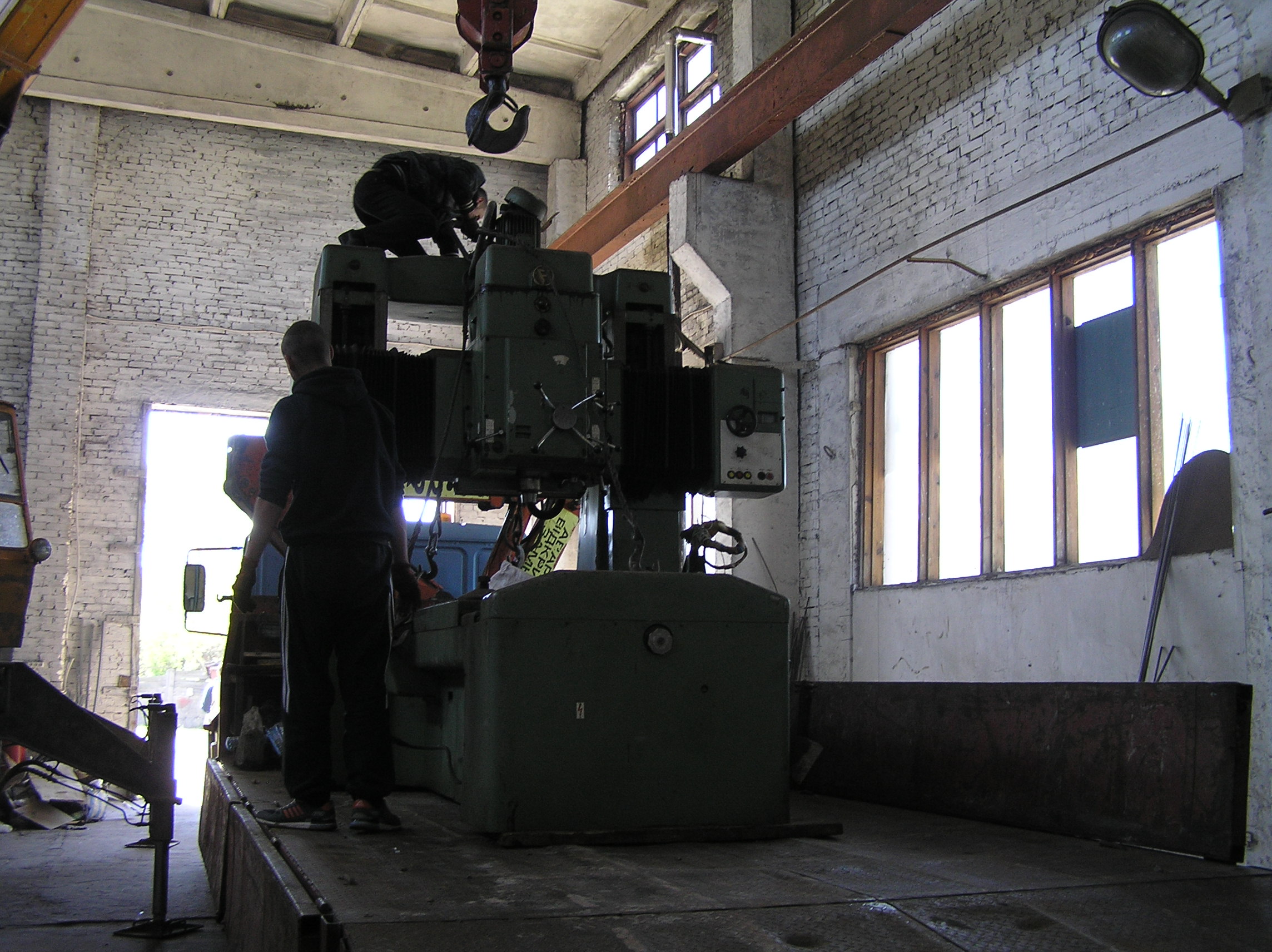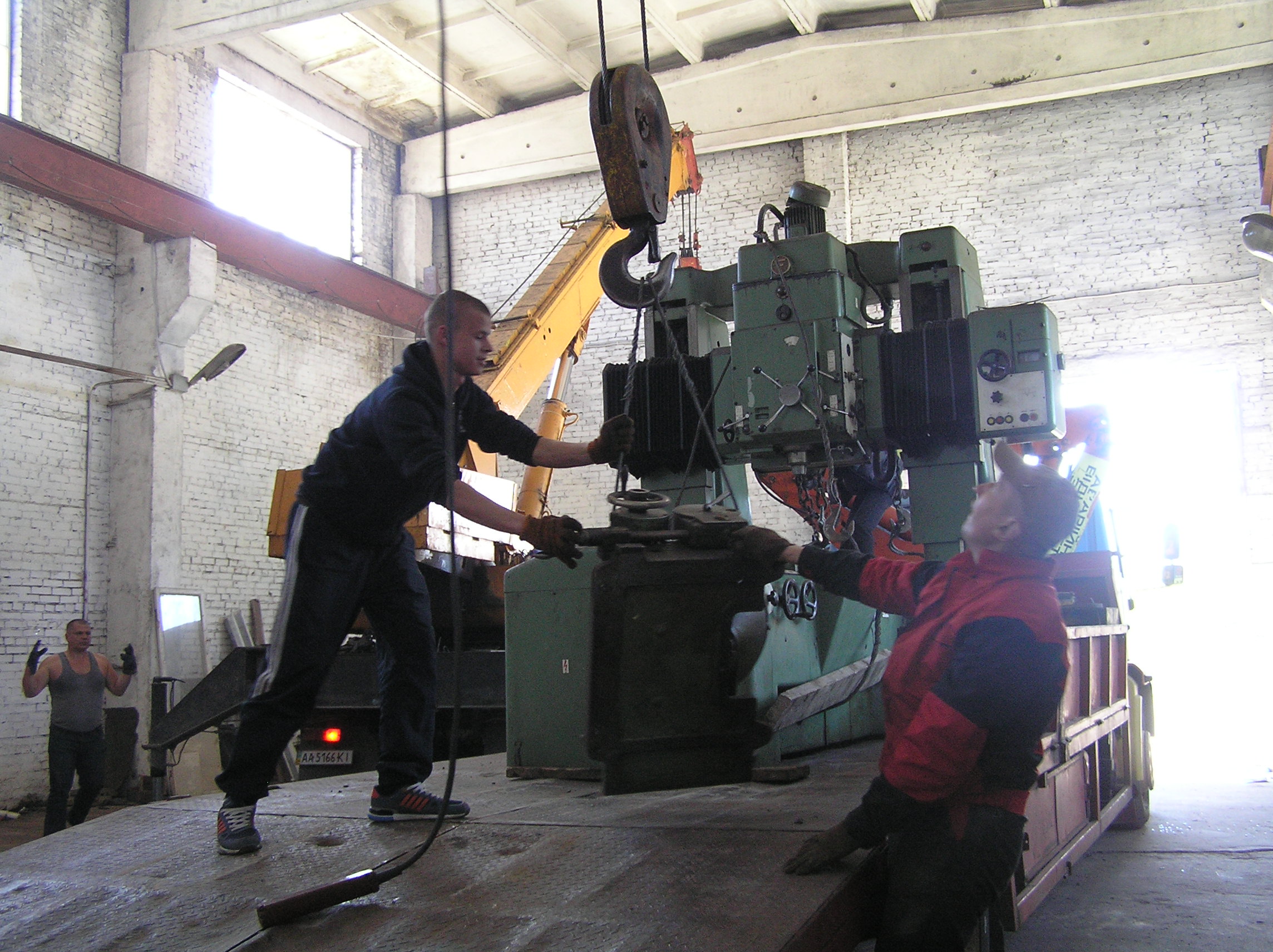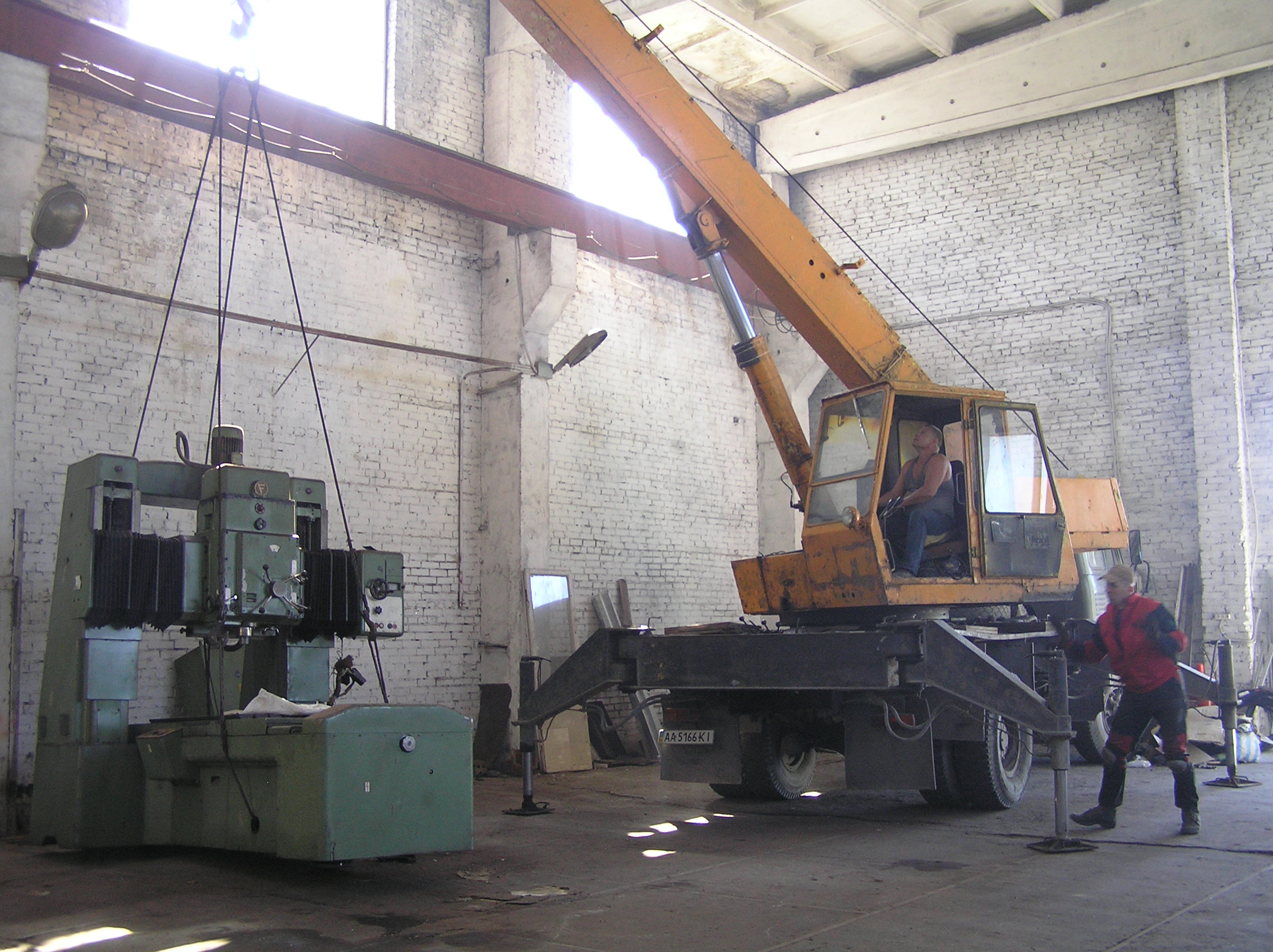 Продольно строгальный станок предстояло вывезти из цеха в связи с продажей его новому владельцу. Такелажные работы существенно упрощались тем обстоятельством, что в цеху, хоть и тесно прижавшись друг к другу, смогли разместиться автокран и грузовая машина. Вес станка составлял 7.5 тонн и за два дня мы не смогли найти грузовик с манипулятором, способный взять этот вес. В очередной раз ситуацию спас опытный крановщик с 12 т краном, стрела которого с минимальным зазором помещалась под потолком производственного цеха. Бережно, едва не задевая стрелой перекрытия цеха, груз был установлен на эвакуатор. Выбор был остановлен на авто-эвакуаторе, так как этот тип грузовика имеет минимальную высоту платформы, позволяющую проехать со станком в проем ворот цеха. В этой работе многие факторы были «впритык»: не было времени на спокойный поиск крана и грузовика, не было места для обоих машин рядом со станком, не было возможности для нормального подъема и поворота стрелы крана. Как впоследствии оказалось, не было возможности для разгрузки станка автокраном в новом цеху. Приехав на место разгрузки мы обнаружили, что в цех не входит ни авто-эвакуатор с грузом, ни автокран. Было принято решение разгрузиться на улице, а станок в цех затягивать с помощью такелажного оборудования. Очередным сюрпризом было отсутствие электричества в новом цеху. Но нас было уже не остановить. Станок медленно заехал за ворота цеха, вспомогательные шкафы тоже практически не сопротивлялись проведению такелажных работ — работа была сделана и сделана «на отлично». Изначально запланированные на полдня, такелажные работы растянулись на целый день. Погрузить станок на машину и затащить станок в цех в этом случае превратилось в непростую и интересную задачу. Решить ее успешно помог профессионализм давно работающего с нами крановщика, широкий выбор такелажных приспособлений, надежные помощники и опыт, бесценный опыт проведения такелажных работ. Все эти факторы, будем надеяться, убедили наших заказчиков в том, что выбор компании » Блокмастер» — это удачный выбор.
