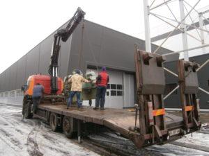 Манипулятором шлифовальный станок был установлен на платформу и надежно закреплен. После доставки на новое место станок так же бережно был разгружен и предварительно установлен на деревянные бруски.
